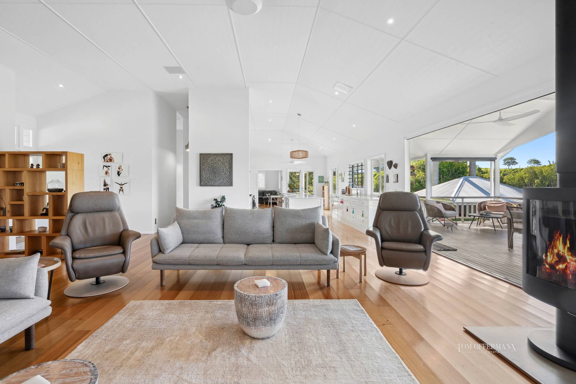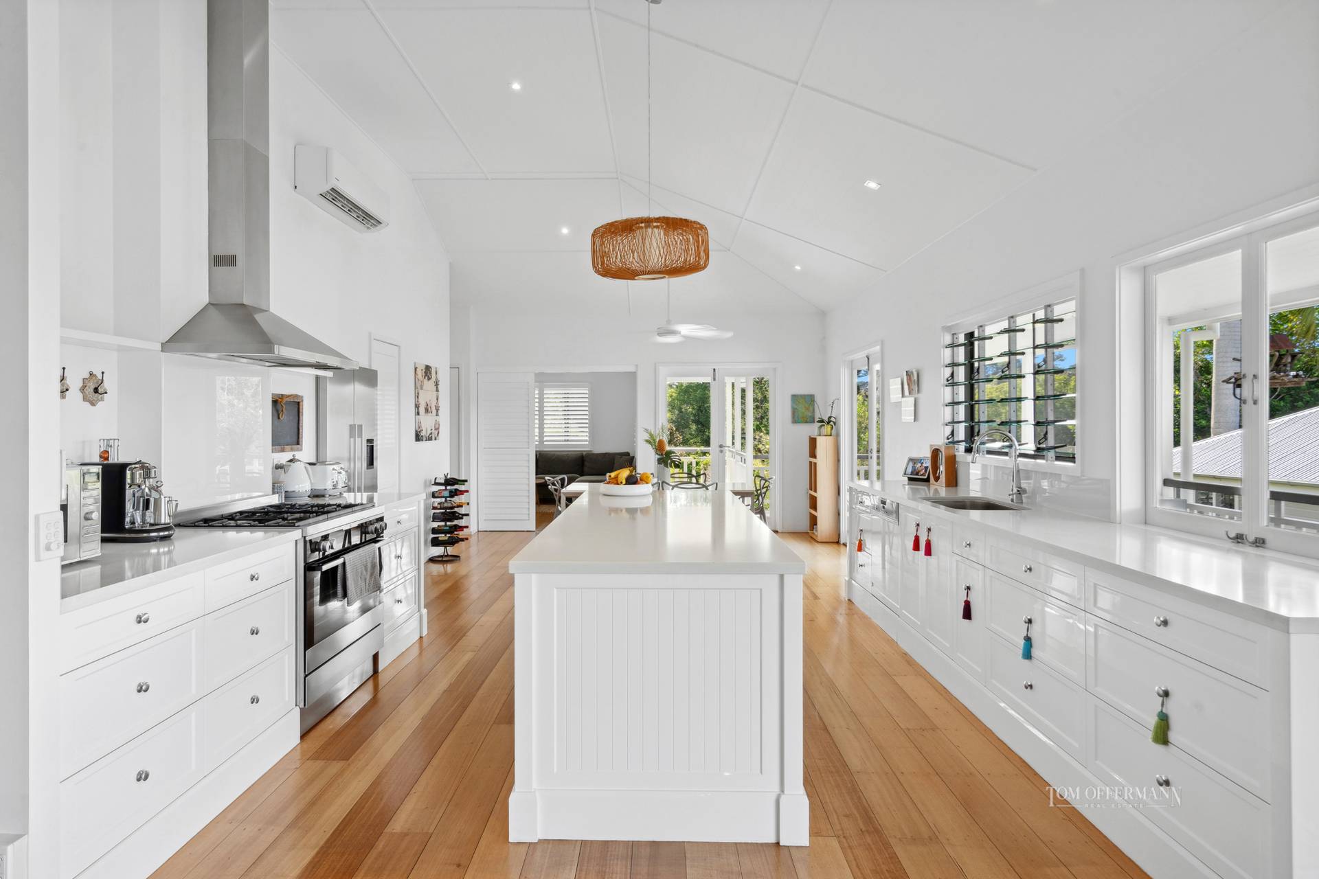Open the white timber glass paned door to a sense of alluring elegance with lofty vaulted ceilings, VJ and dado features, French doors opening from most rooms, also running the width of the substantial living room, inviting brilliant natural light to shadow dance over beautiful blackbutt flooring. Note the wood-burning fireplace, custom cabinetry, dedicated dining area, west wing lounge, plentiful plantation shutters, wispy sheers and grand kitchen which is commensurate in size and functionality to everything about the Estate.