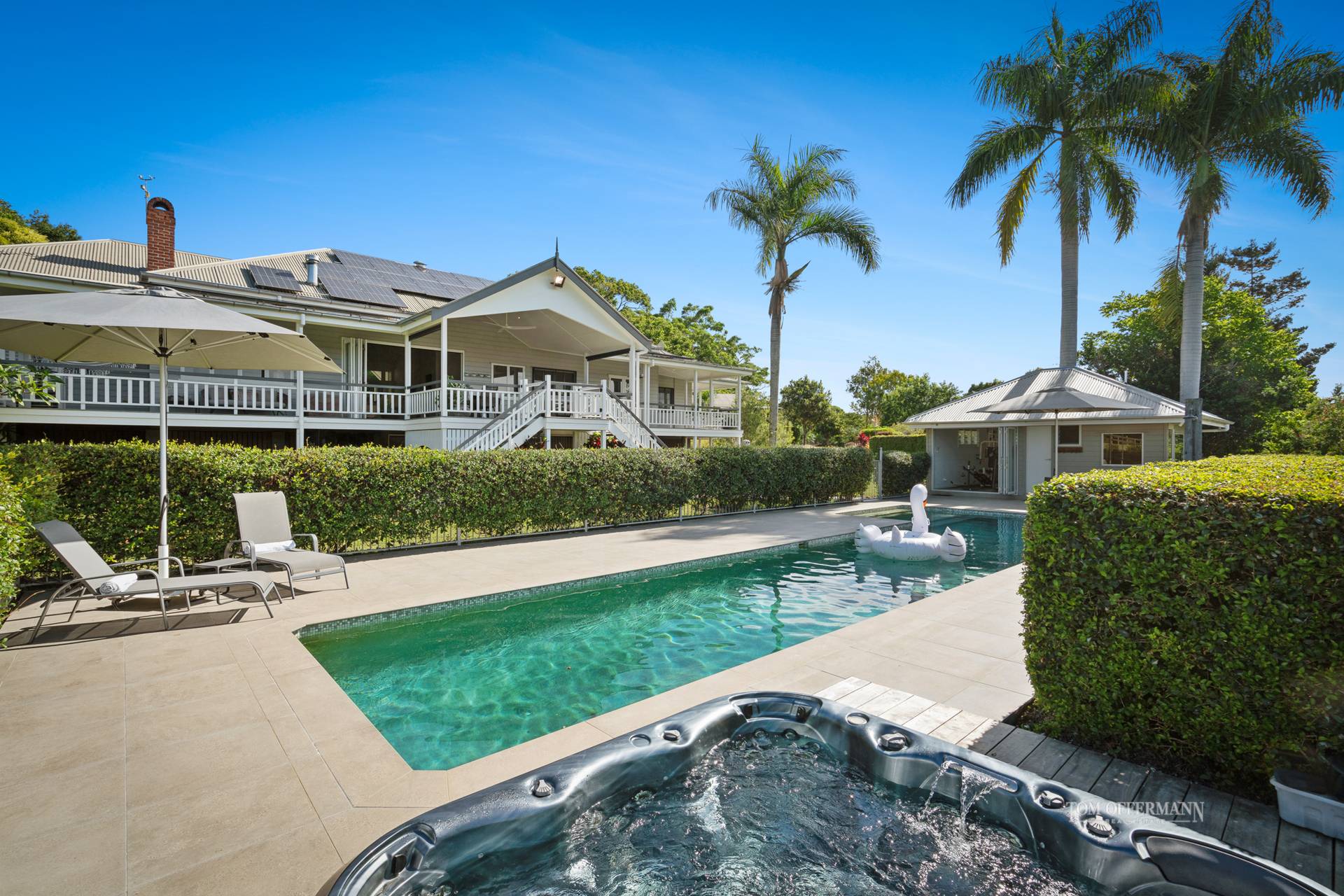 - Exterior: circular driveway Poinciana centre; lawns/gardens w 150yr old Moreton Bay fig; mangos; magnolias; hedges; fruits incl passionfruit, lychees, pawpaw, citrus; shade house w above ground veg beds & irrigation; coop w yard; 90,000L tanks; new septic; bore water via Puretec filtration system; new solar 13.5 kW