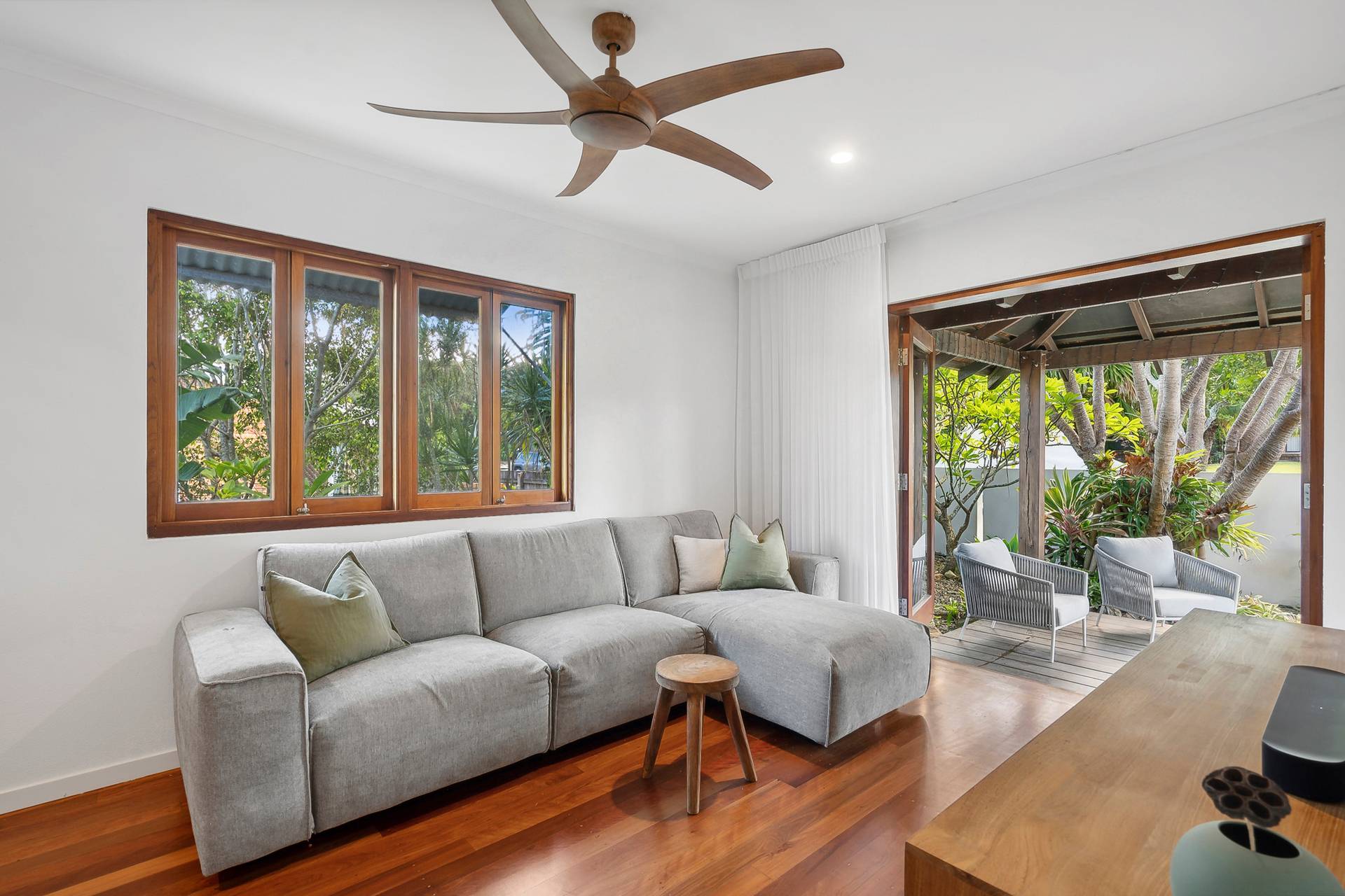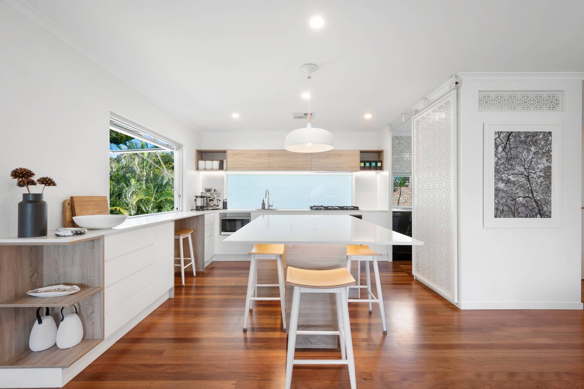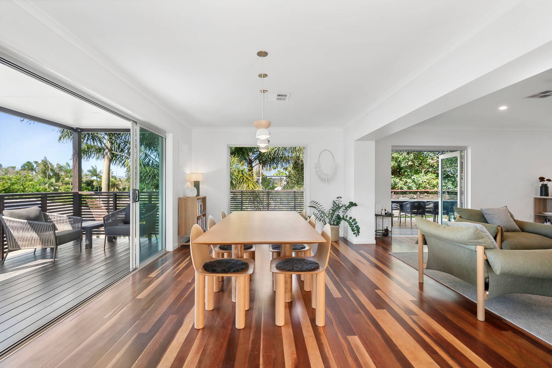 The secured front gate entry leads you to a tropical garden and central lap pool before entering the front door. Polished hardwood flooring in the main living area sets the tone of the home. Open-plan living flows to an outdoor entertaining deck with a fire pit, and French doors lead to a private deck ideal for outdoor dining while listening to the sound of the ocean. The kitchen serves as the hub of the home, featuring a central breakfast bar, European appliances, a butchers' pantry, and stone benchtops-a chef's inspired kitchen. The open living area combines a lounge and dining area that is one of three separate living areas that the home has to offer.