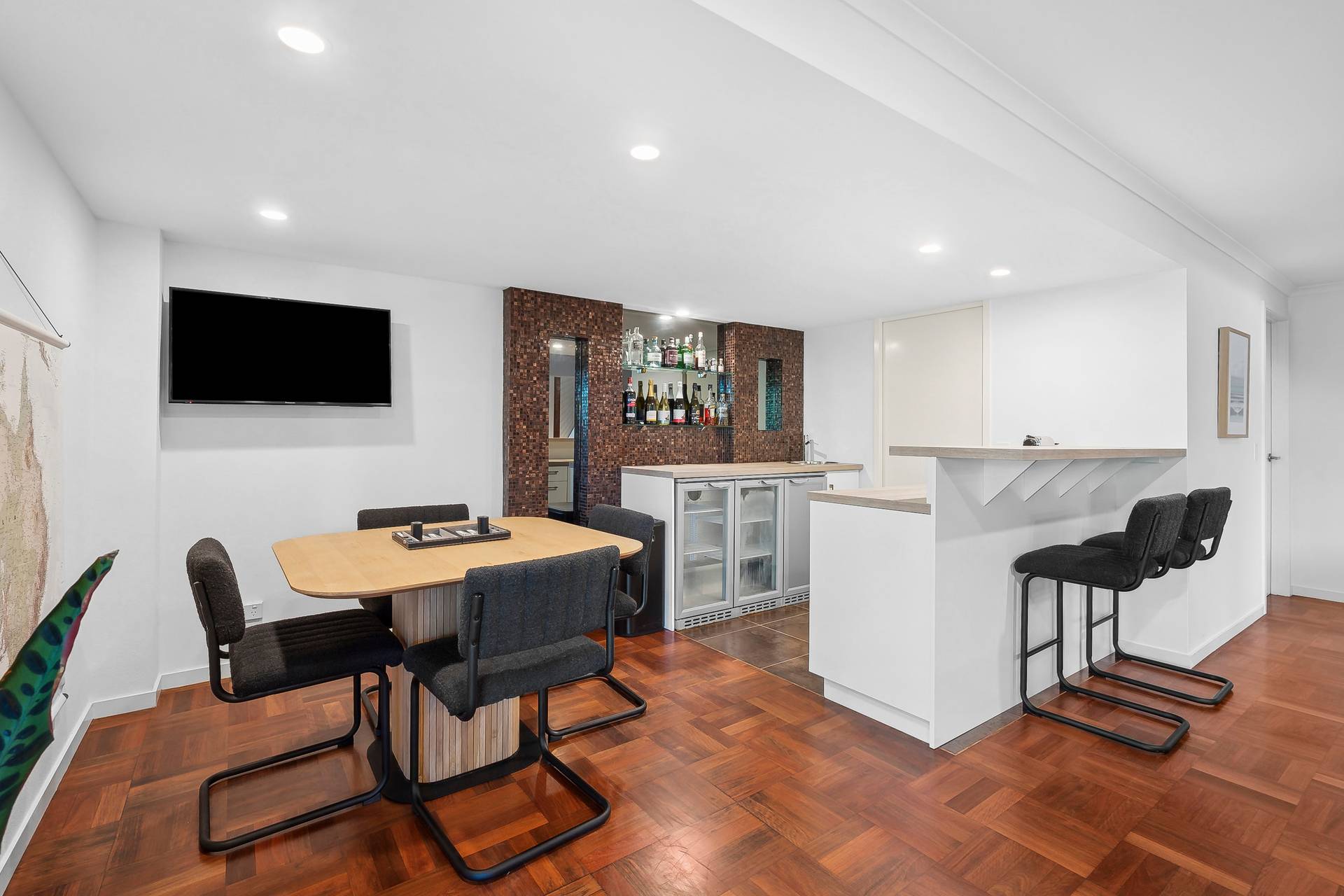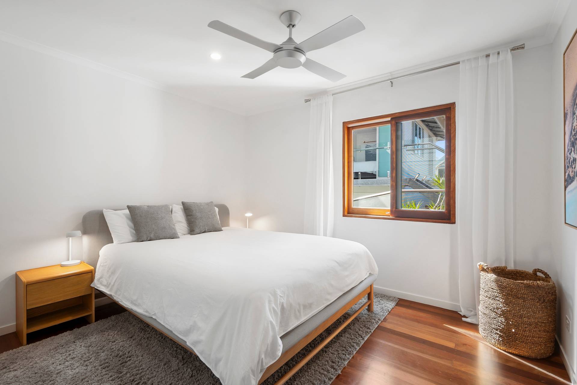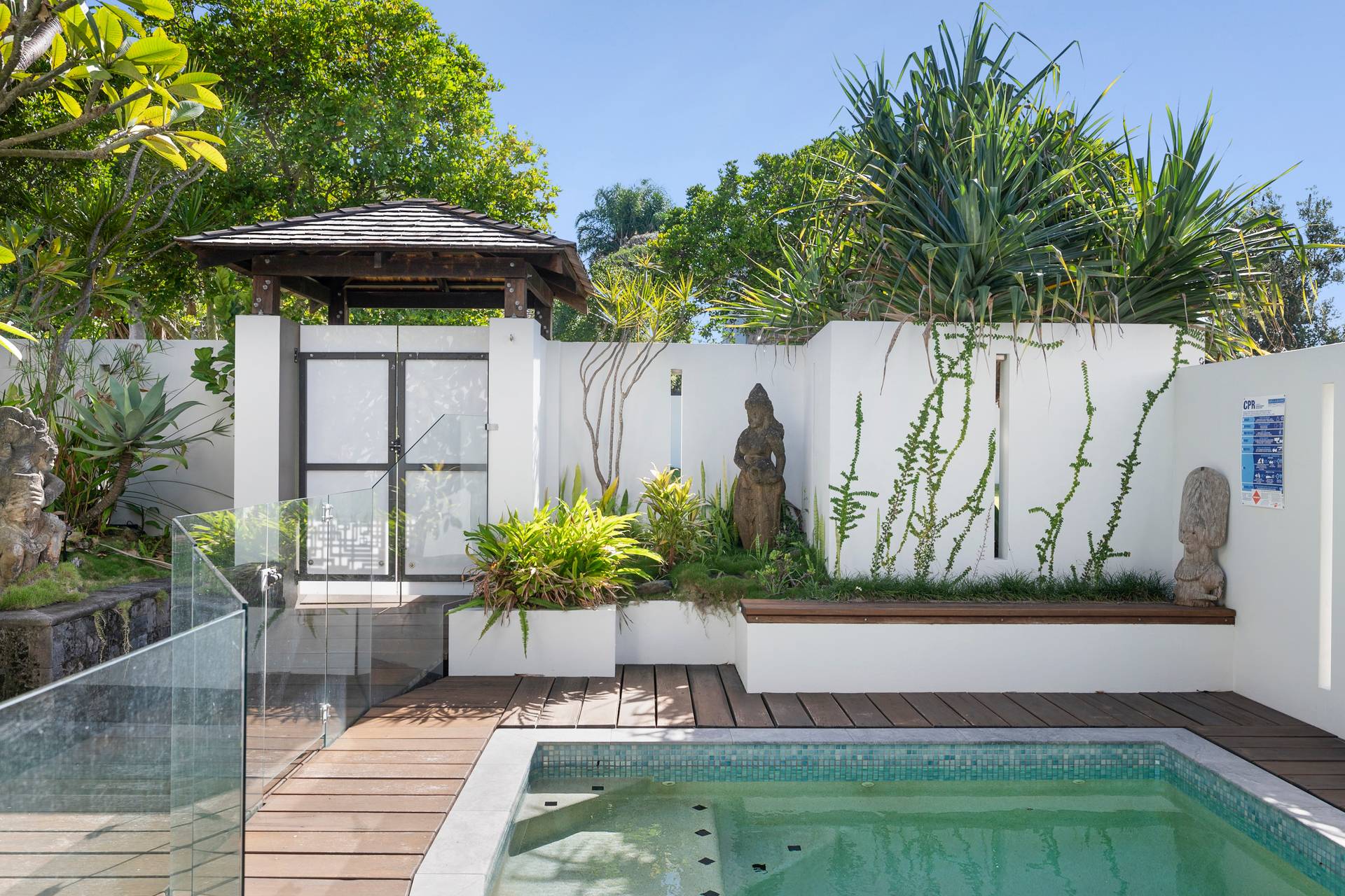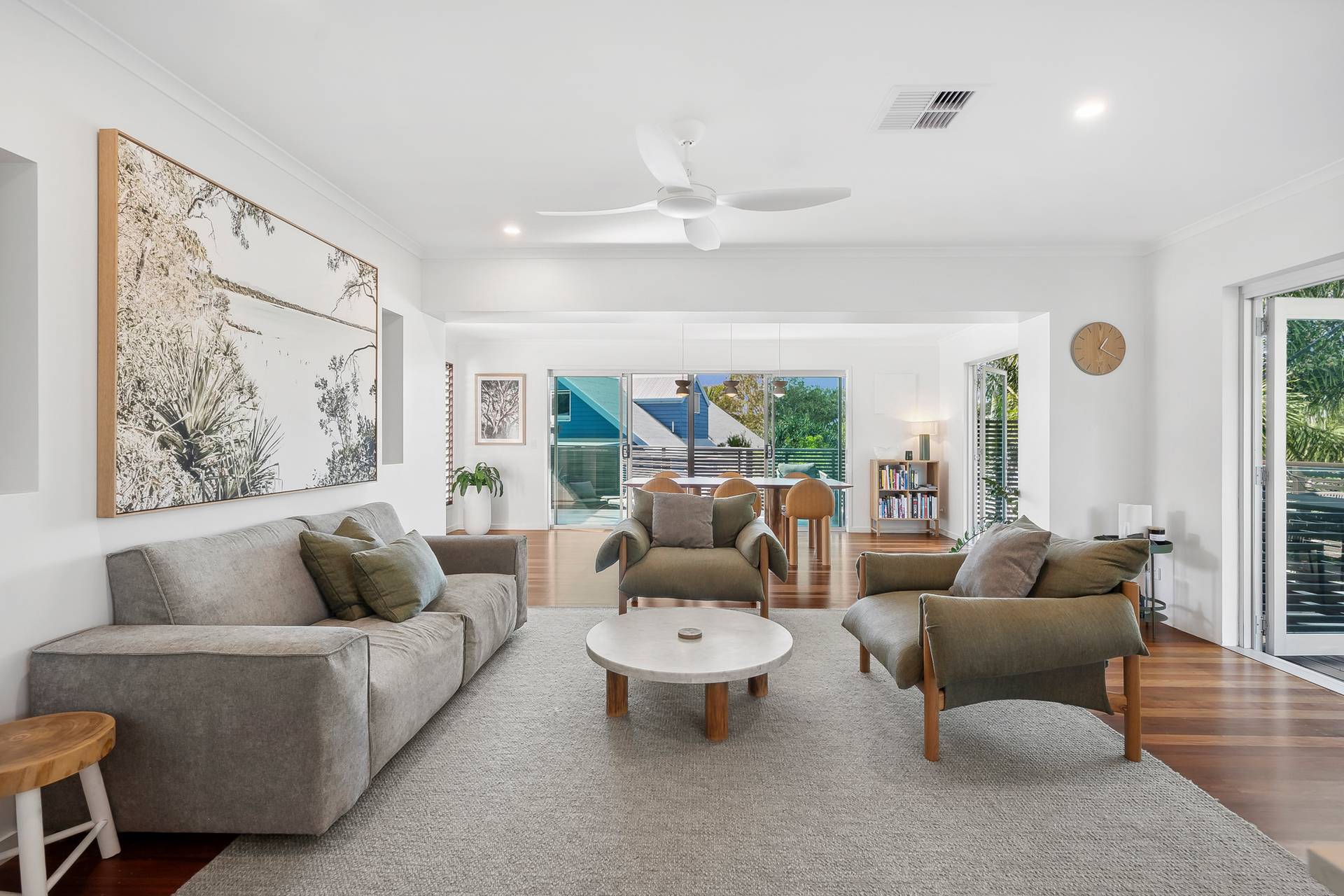 The secured front gate entry leads you to a tropical garden and central lap pool before entering the front door. Polished hardwood flooring in the main living area sets the tone of the home. Open-plan living flows to an outdoor entertaining deck with a fire pit, and French doors lead to a private deck ideal for outdoor dining while listening to the sound of the ocean. The kitchen serves as the hub of the home, featuring a central breakfast bar, European appliances, a butchers' pantry, and stone benchtops-a chef's inspired kitchen. The open living area combines a lounge and dining area that is one of three separate living areas that the home has to offer.