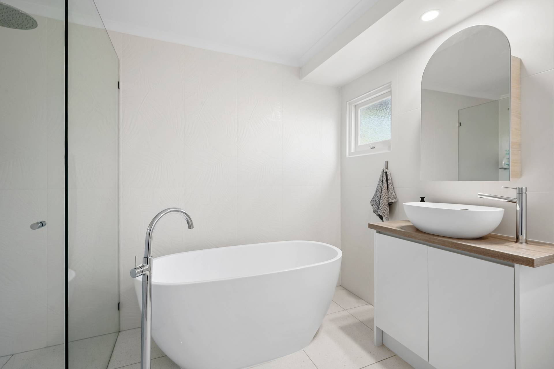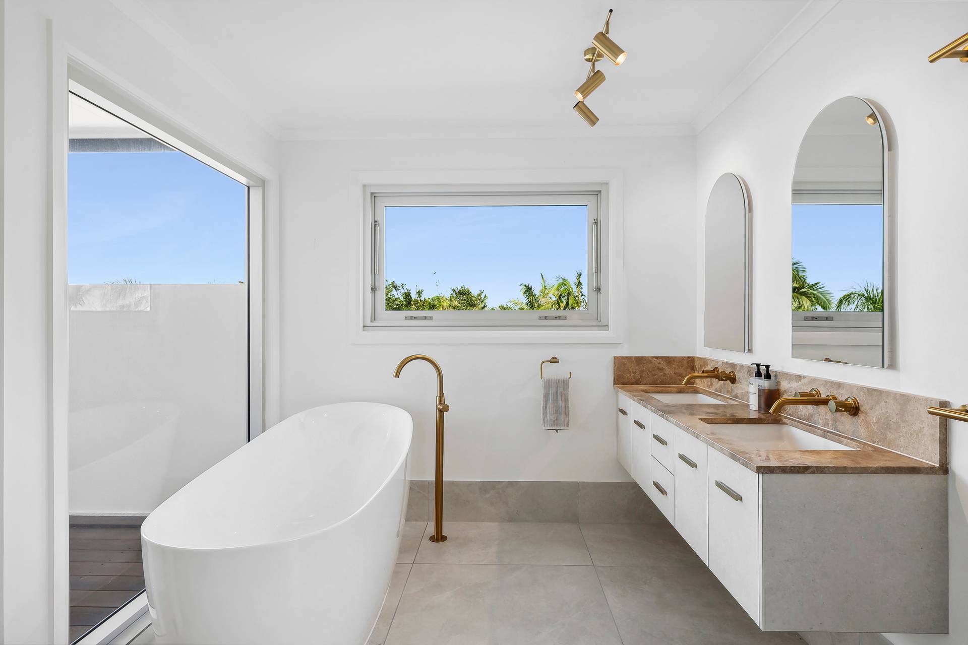Two bedrooms share a beautiful bathroom with a frameless shower and freestanding bath, while a cosy media room provides direct access to the front terrace with timber doors opening to a private garden. The master bedroom, located on the first floor, is a true indulgence-a spacious bedroom with a viewing balcony overlooking the ocean, a complete luxury ensuite with a double vanity, featured lighting, a double shower, and a freestanding bath. Not to mention, it boasts one of the biggest walk-in dressing rooms you will find, completing a true master suite.
