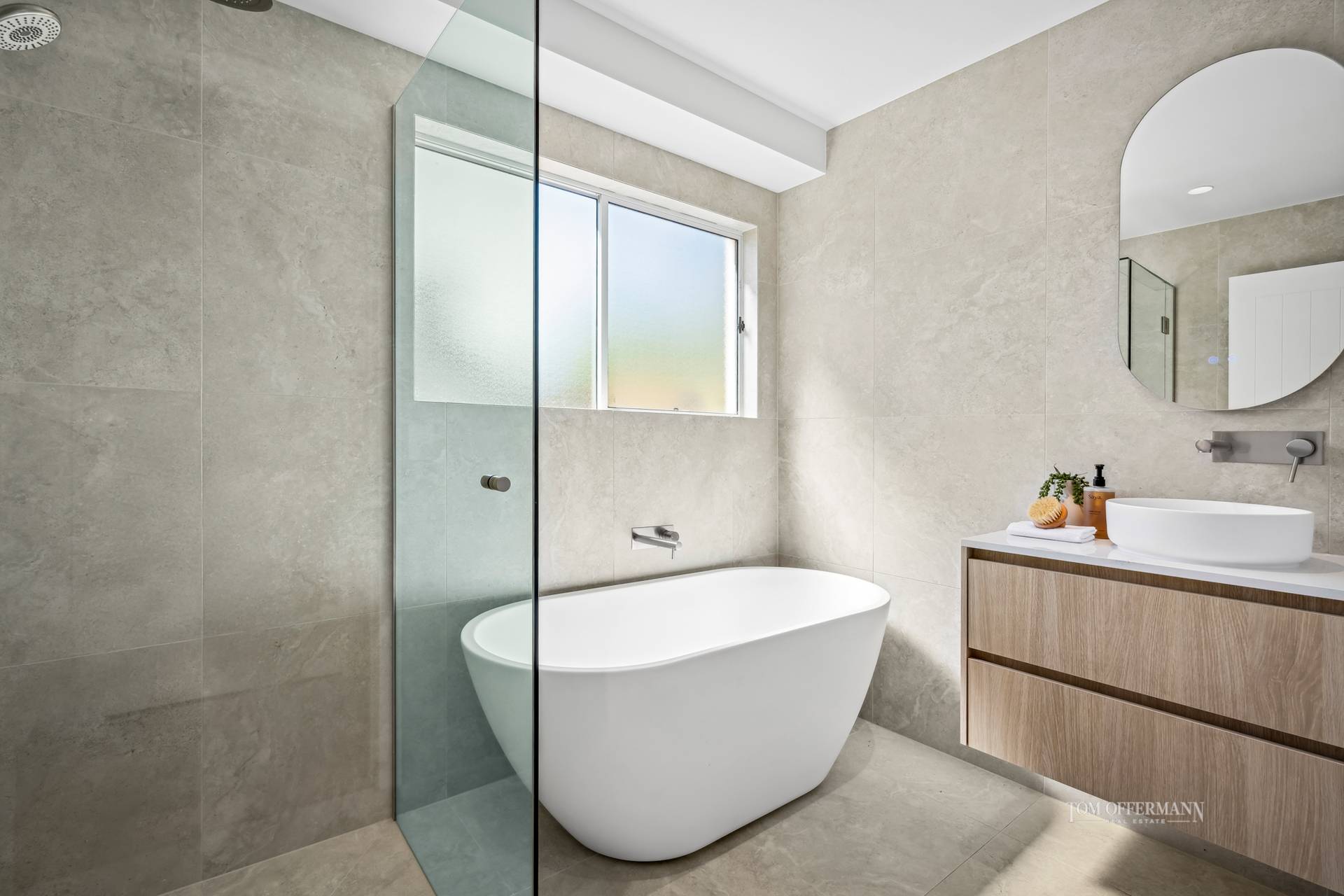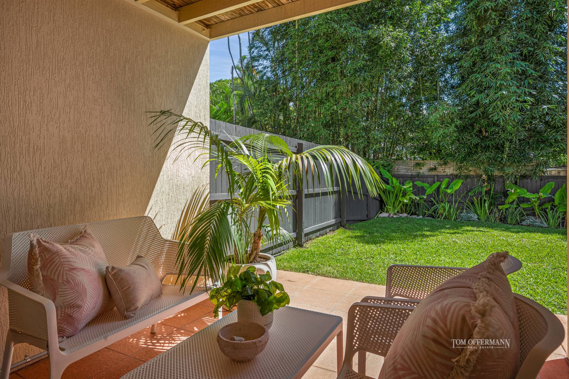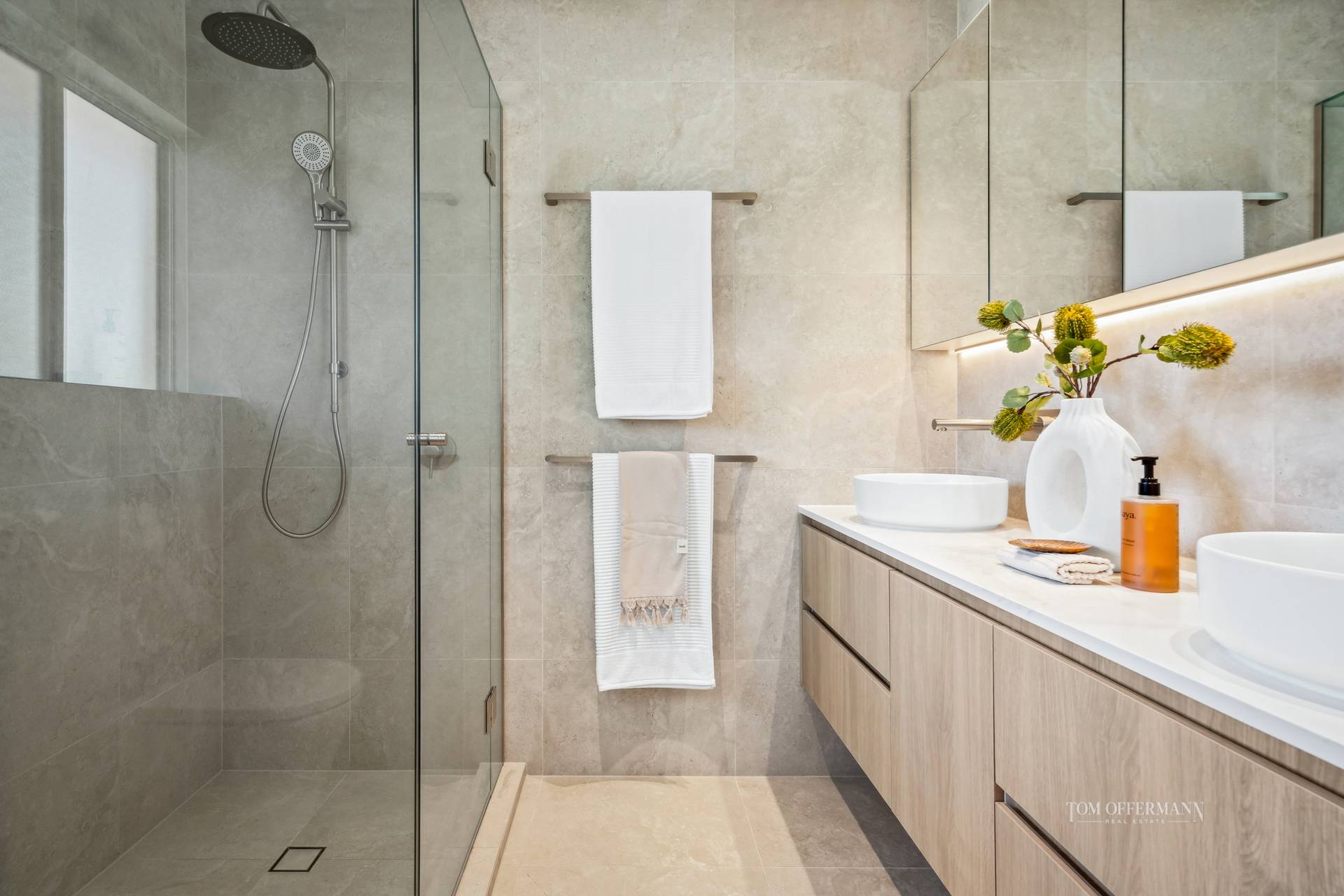 Two bedrooms on the ground floor have access to the undercover terrace, as well as the private tropical landscaped gardens. The main bathroom features a freestanding bath, sizable shower with separate toilet. Nearby is the laundry with stone topped custom cabinetry, also a store room.