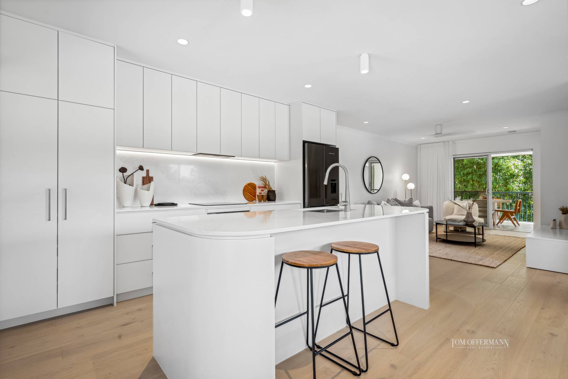 Adding to that proposition and taking centre stage is the custom designer kitchen with stunning curved stone-topped island breakfast bar. Floor to ceiling cabinetry and the latest high-end appliances which include a Fisher & Paykel 4-door fridge.