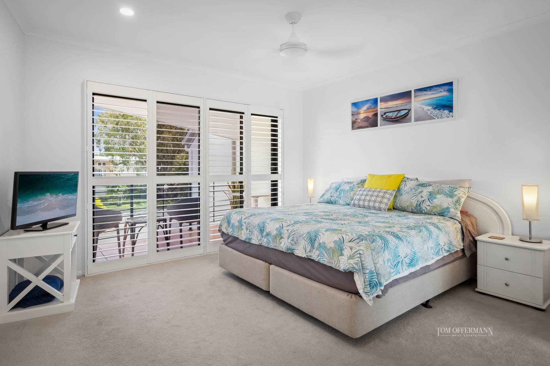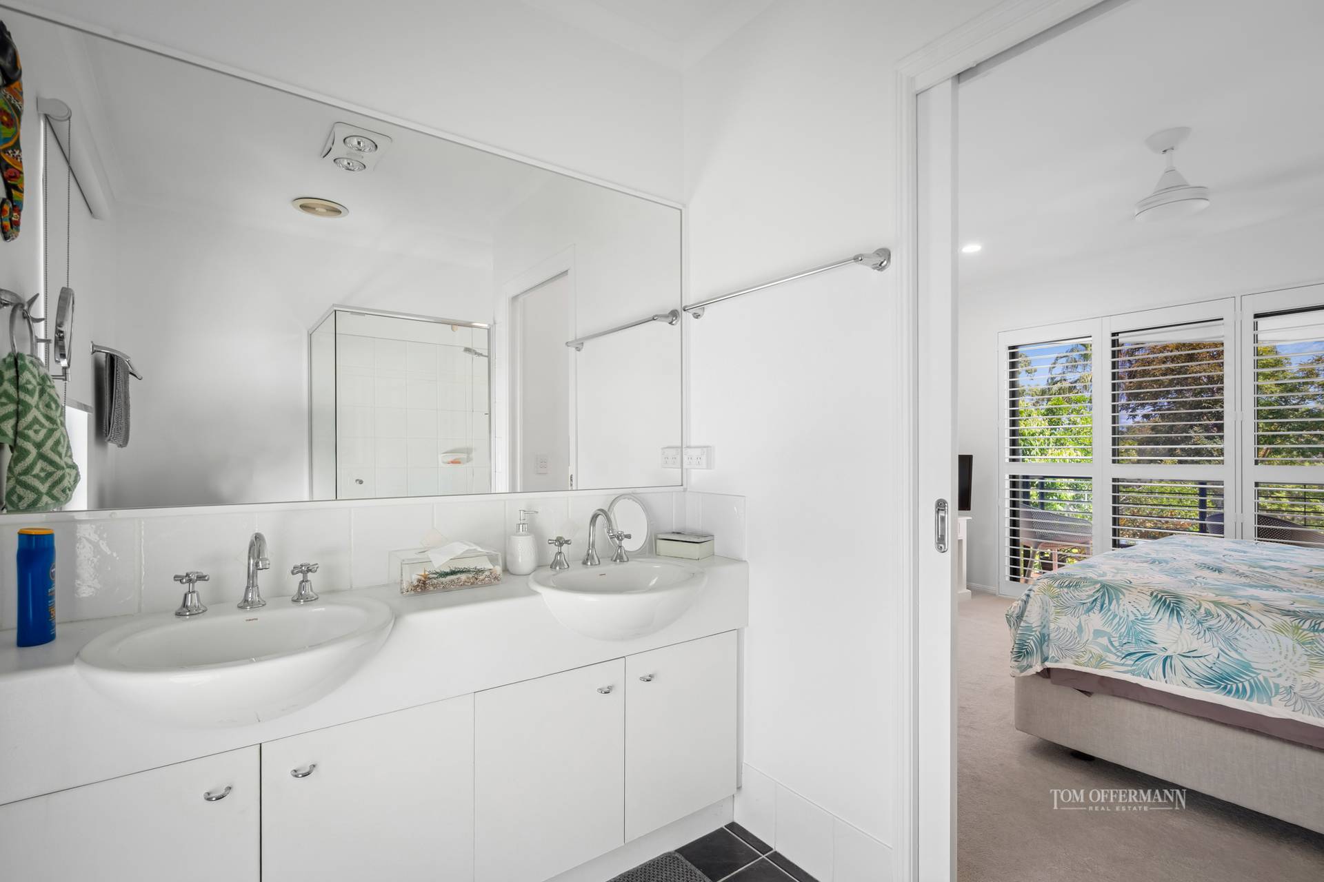 Combining beach inspired elegance with functional living, the open plan lounge and dining area is spacious and bright with an exceptional indoor-outdoor flow. Sleek cabinetry, stone benchtops, quality appliances, and an island bench make the modern kitchen a serene place to create meals while overlooking lush greenery.