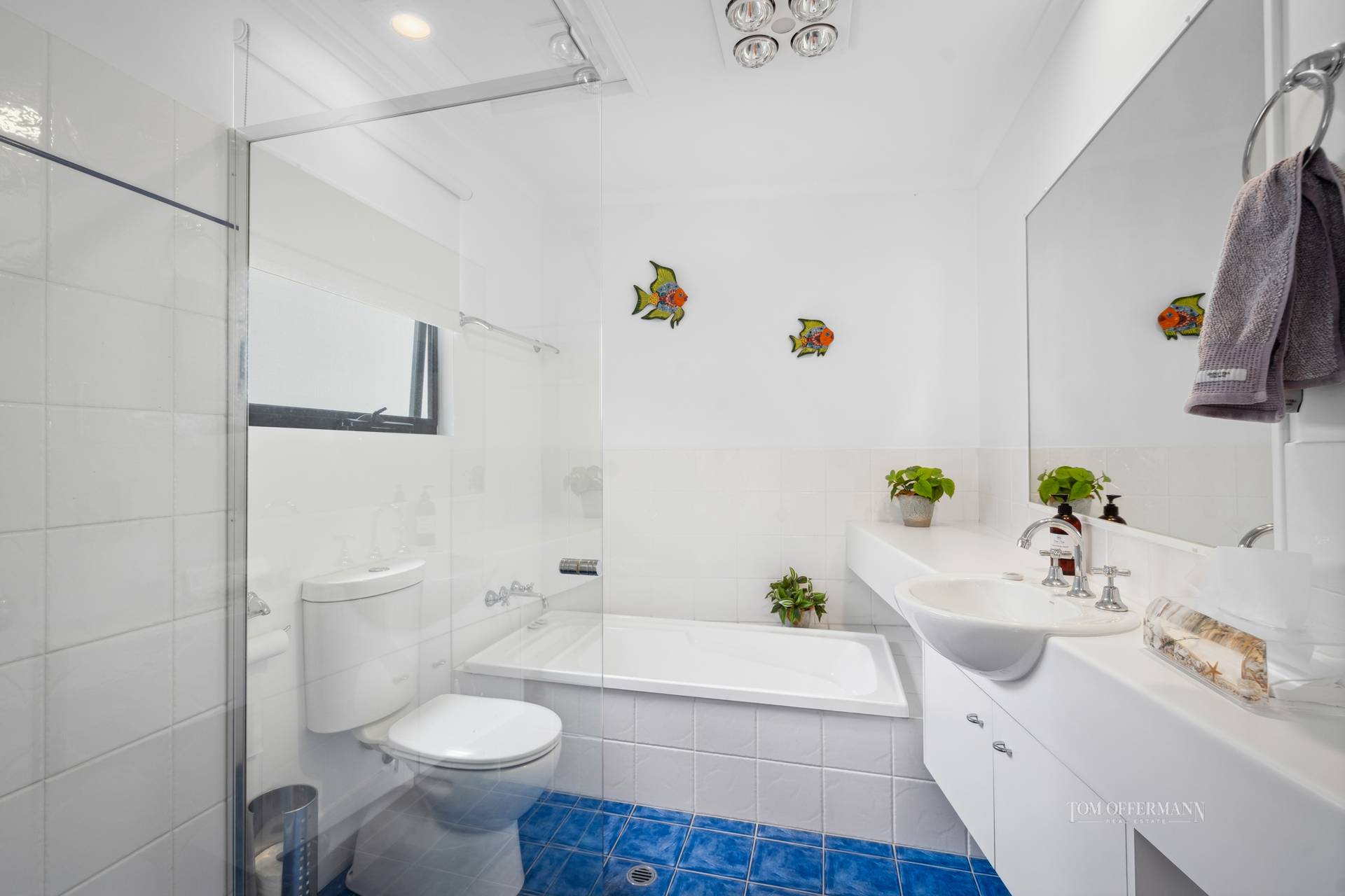 Upstairs, there are three bedrooms with built-in robes and two bathrooms including the superb main bedroom. Enjoy elevated views of the front garden from the main bedroom which has a private terrace, walk-in robe and a contemporary ensuite bathroom.