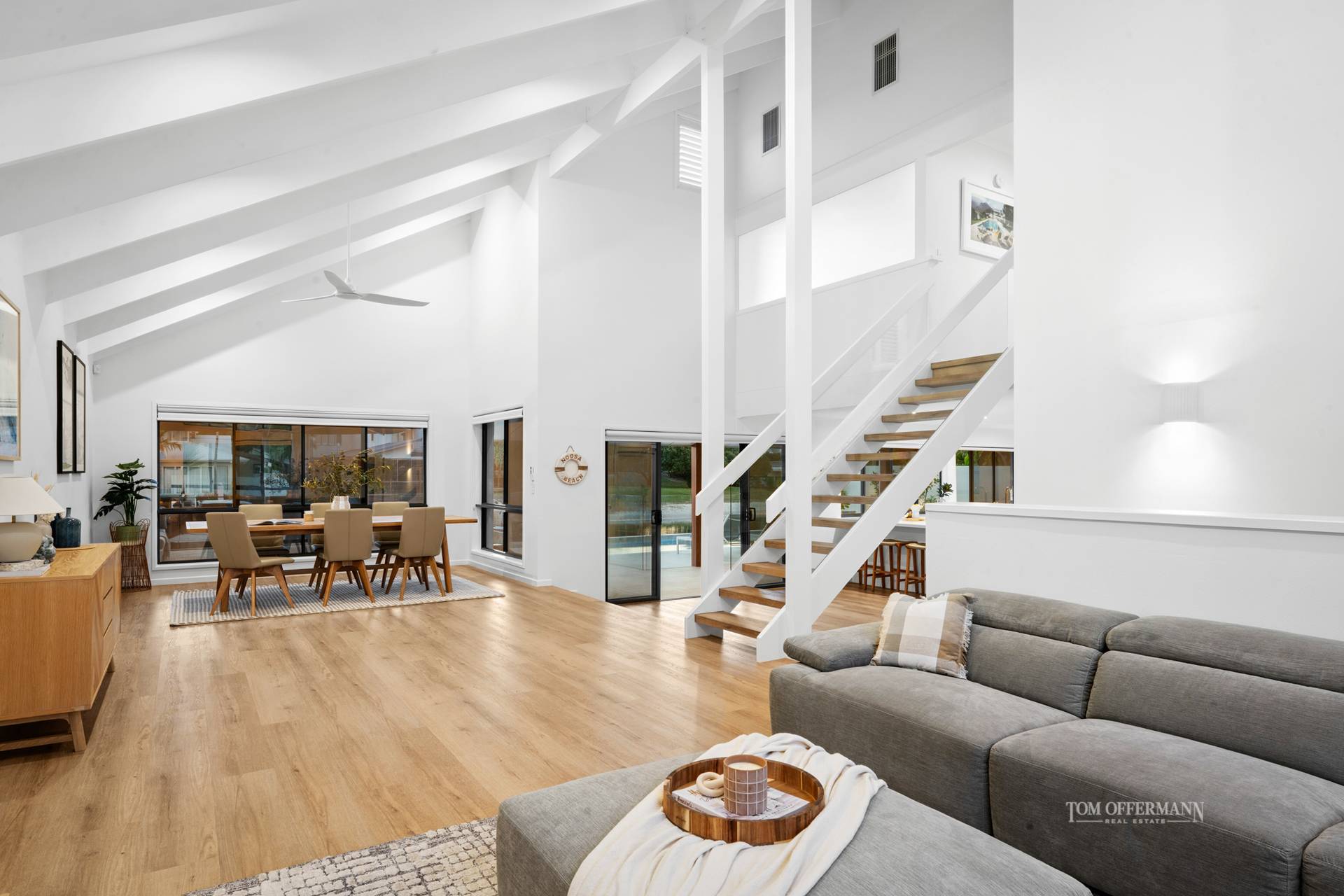 Push aside the door into the pared back foyer and look ahead. Engage with the structural simplicity, double height-plus raked ceiling, and white-bright recently buffed open plan living space, the length of the residence on the western side.