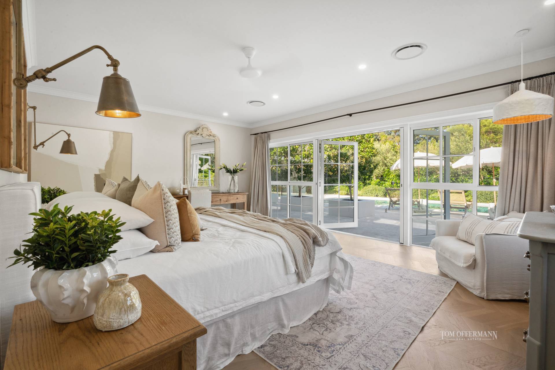 Sweet dreams are a certainty in all five super-sized bedrooms. The premier king suite retreat has French doors to the pool, brass wall sconces, walk-in robe and ensuite with grey granite floor tiles, Zellige wall tiles, freestanding bathtub, stone-topped two-basin timber cabinetry, drencher shower and separate toilet.