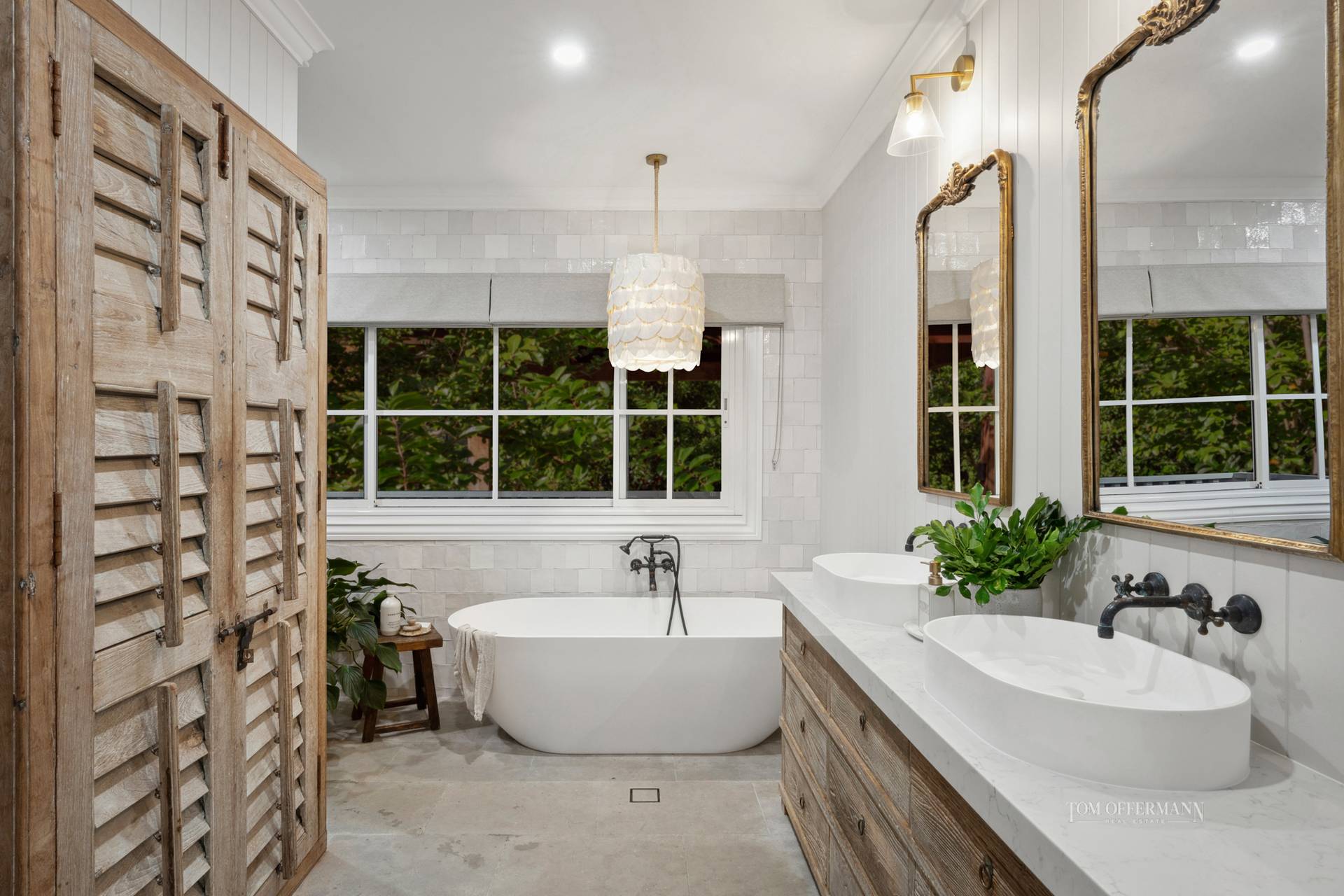 Along the hallway with fluted timber-doored storage are three bedrooms. All have built-in robes plus access open to the western terrace and gardens. They share a bathroom with bathtub and stone-topped two-basin cabinetry. The adjoining powder room has dramatic wallpaper, and cabinetry in cream and jade-hued bone.