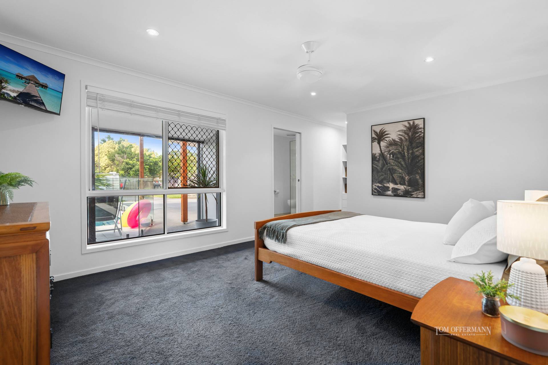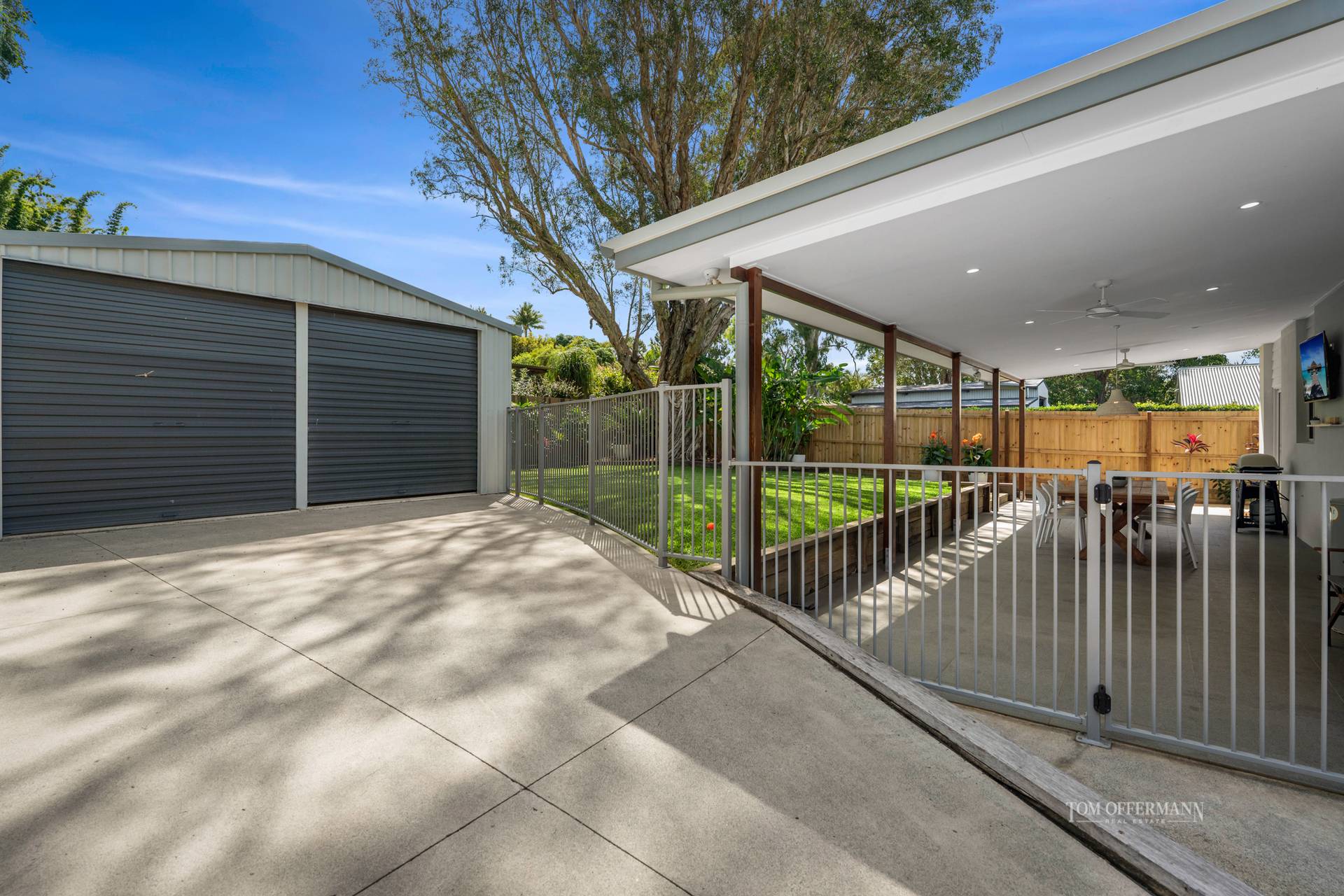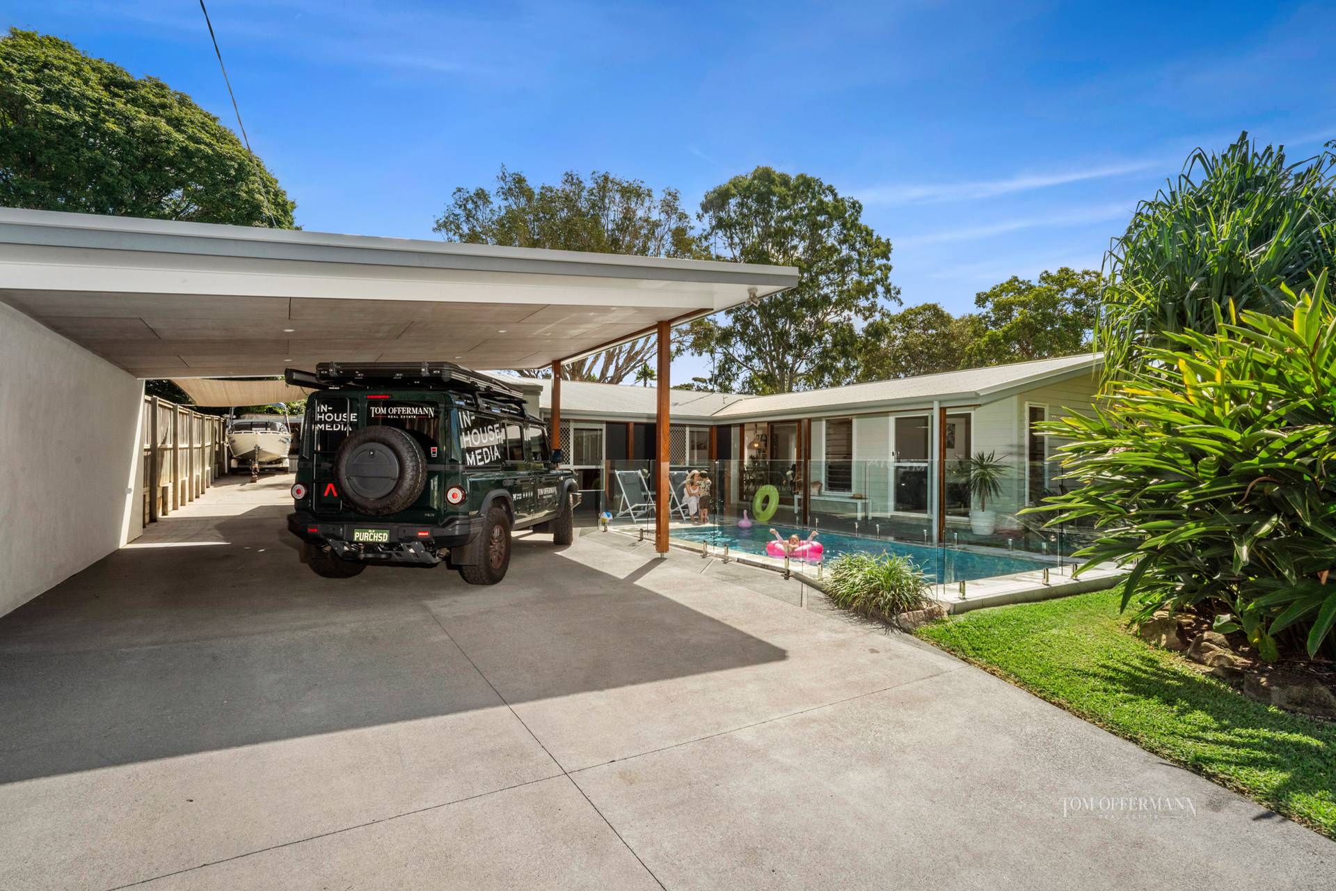 Thoughtfully designed for modern living, the property includes an automatic electric gate entry for privacy and security, a boat annex, and a high-clearance double carport with easy access to a double bay powered shed which is complemented by a giant paperbark tree that seemingly stands guard over the home.