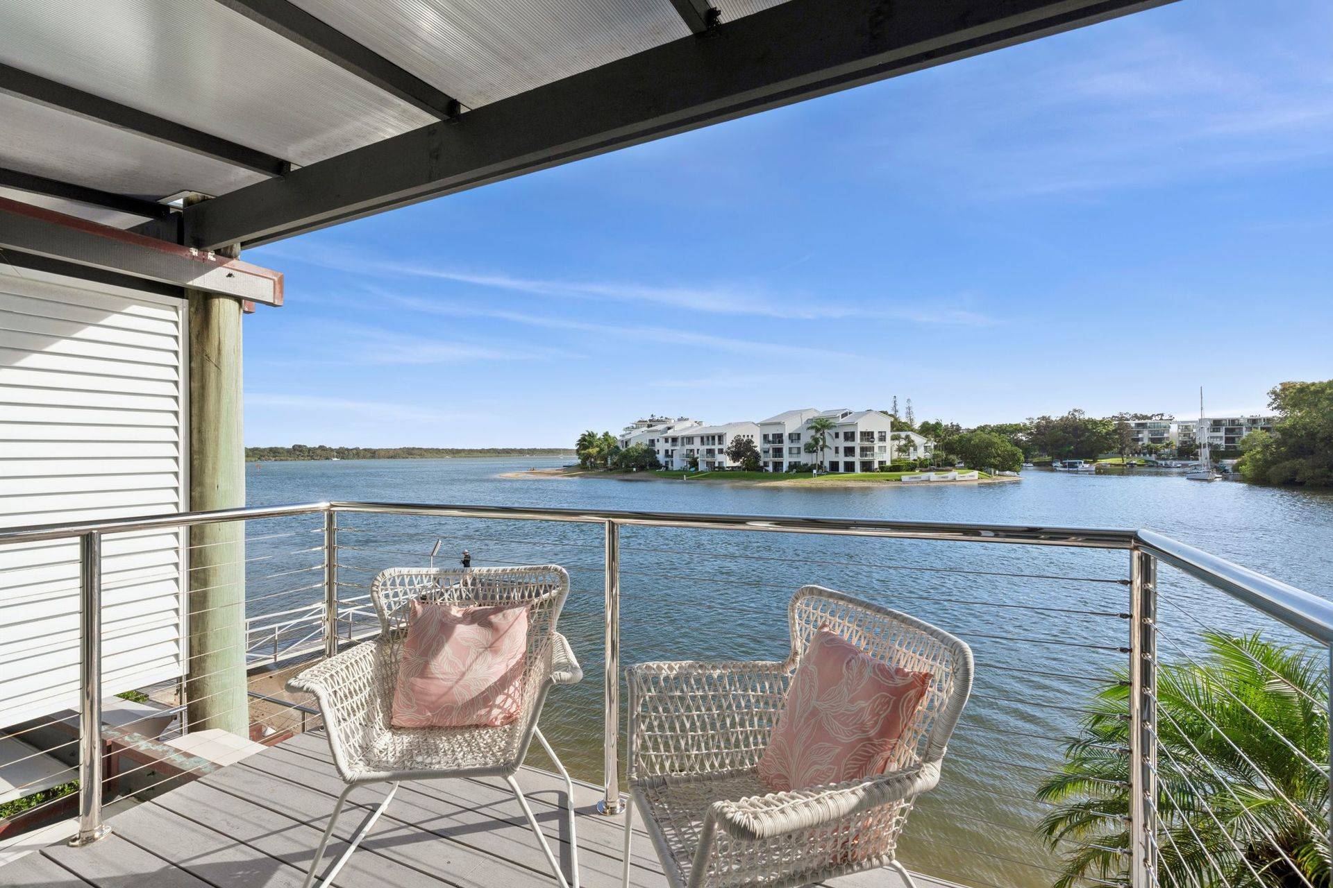 Timber-tread stairs with marine-ply balustrading, open out to carpeted bedrooms. Both have built-in robes and a chic ensuite/bathroom with frameless showers and marble vanity splashbacks. The king master has a balcony with splendid views of the Noosa River meandering the Noosa Sound waterways, the twin bedroom has a verdant outlook, and a loft could be a teen's 'hideaway'.