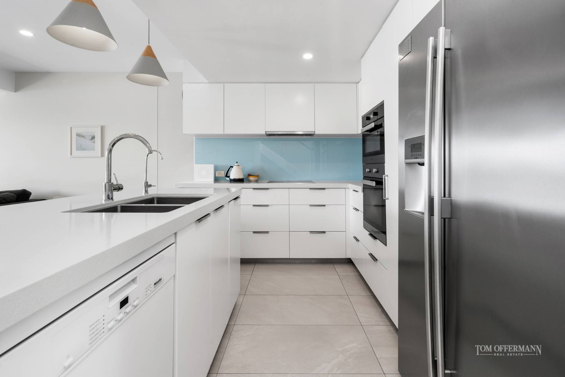 Whether sundowners, alfresco lunches or inviting friends for dinner, the L-shaped kitchen with island bench, stone-topped cabinetry, and sea-blue glass splashbacks, has every accoutrement you need, including the latest Miele appliances. Similarly, the laundry, which is next door to a powder room.