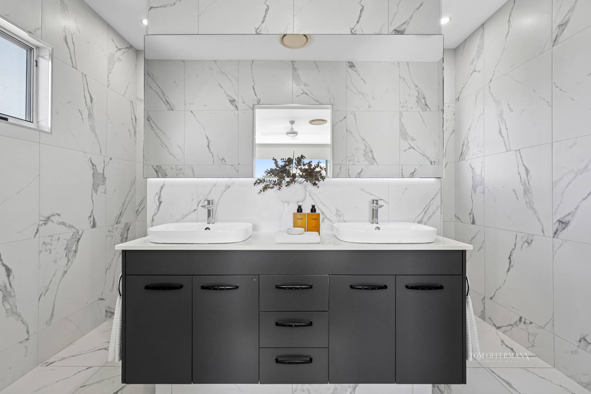 When it comes to sweet dreams, upstairs has three carpeted bedrooms. The premier suite has a walk-in robe, an ensuite with marble-effect wall and floor tiles, white stone-topped two-basin grey timber cabinetry, separate toilet and shower. Two bedrooms also on the northside have built-in robes and a bathroom with single basin cabinetry, styled as per the ensuite. A study zone with custom desk is in the mezzanine space.