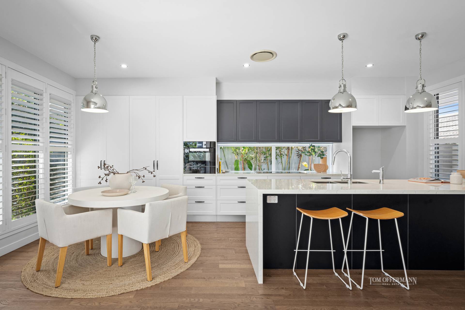 Given there are several options indoors and out for entertaining, the on-trend galley kitchen is commensurate. The white stone-topped white/grey cabinetry including semi-island breakfast bar has a pantry, wide drawers, a wide paned window 'splashback' to the garden, premium appliances including an induction cooktop and a wine fridge, also bell-shaped pendants including over the dining table, and plantation shutters.