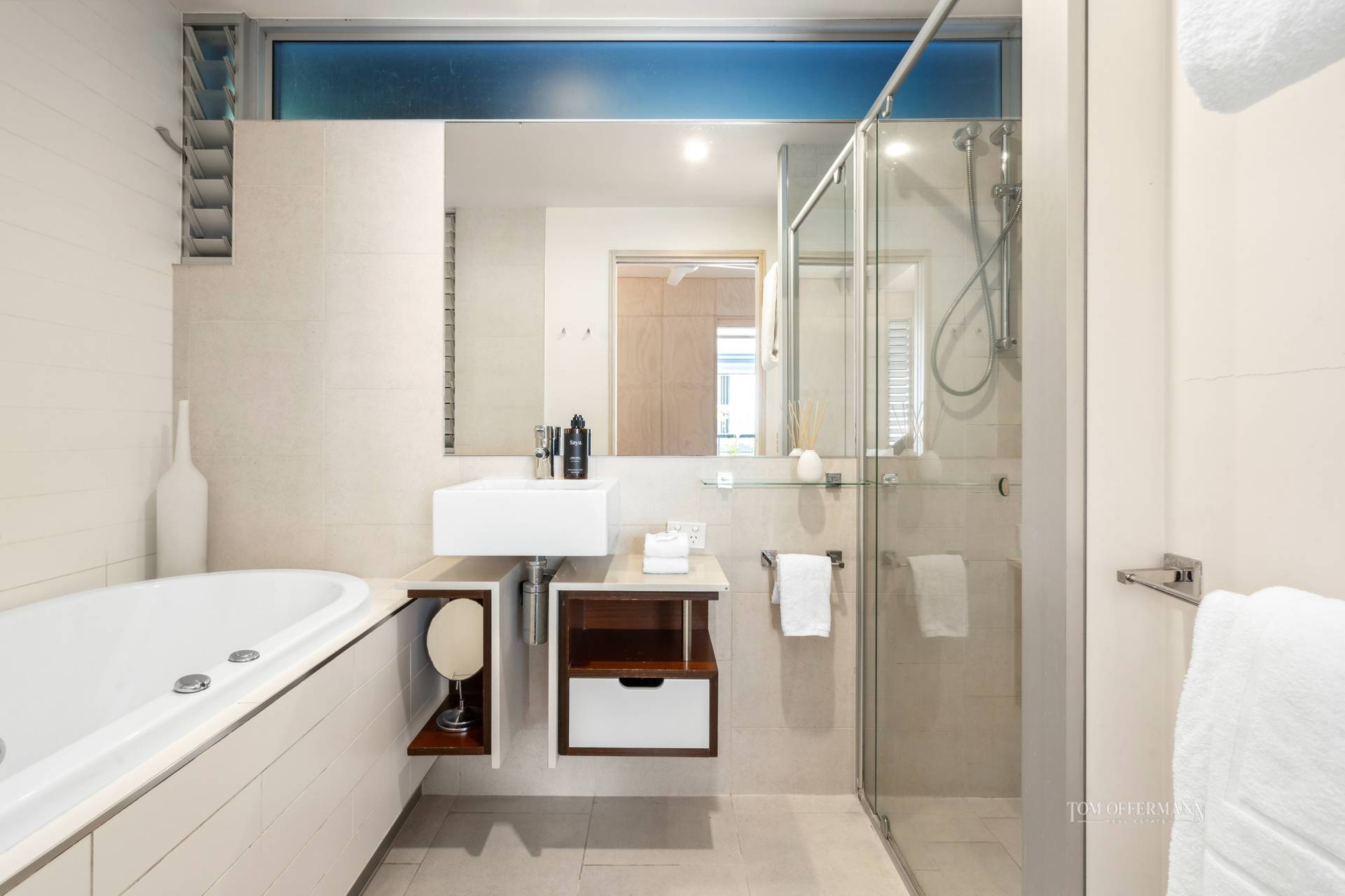 When it comes to dreamtime, the king master suite is a sigh-moment. It has a walk-in robe, and ensuite bathroom with shower and spa bath, plus it opens into the living space and looks out to the terrace, so easy to wake up with the birds. Adjoining is a laundry, also a powder room.