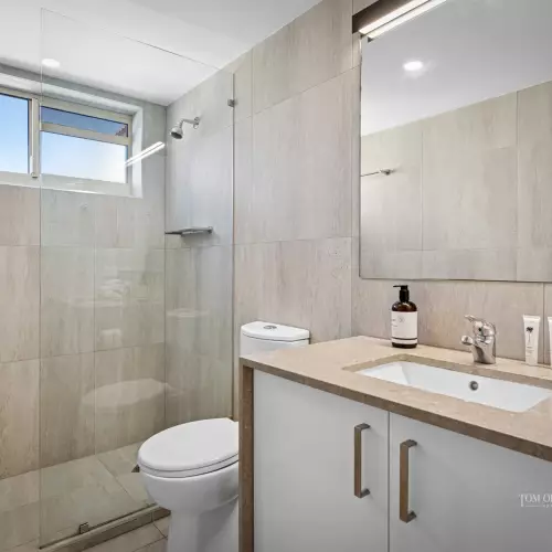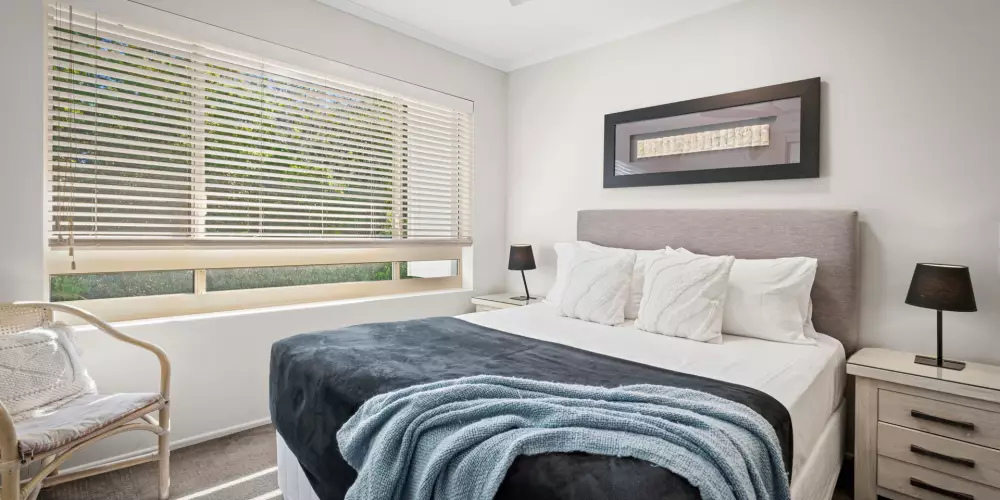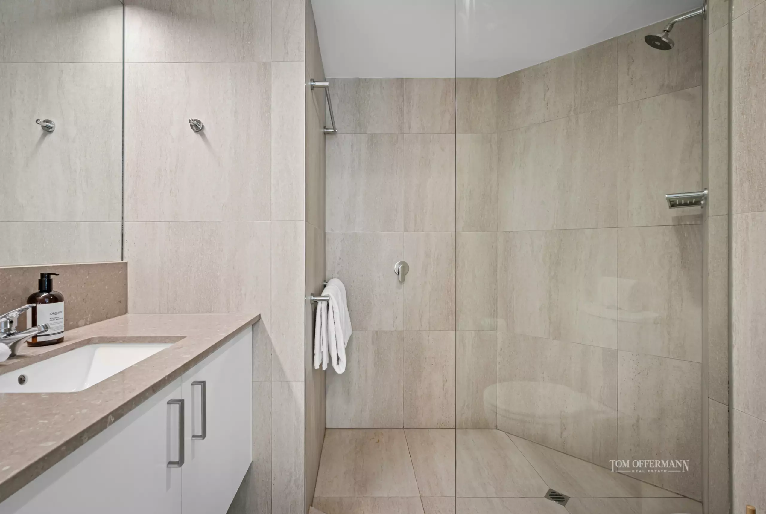 There are two carpeted bedrooms with built-in robes, also two bathrooms; one is ensuite. Both have natural stone wall and floor tiles; stone topped single basin white cabinetry; and a fully equipped laundry is adjacent. The single secure undercover car park also has a private lockable storeroom.