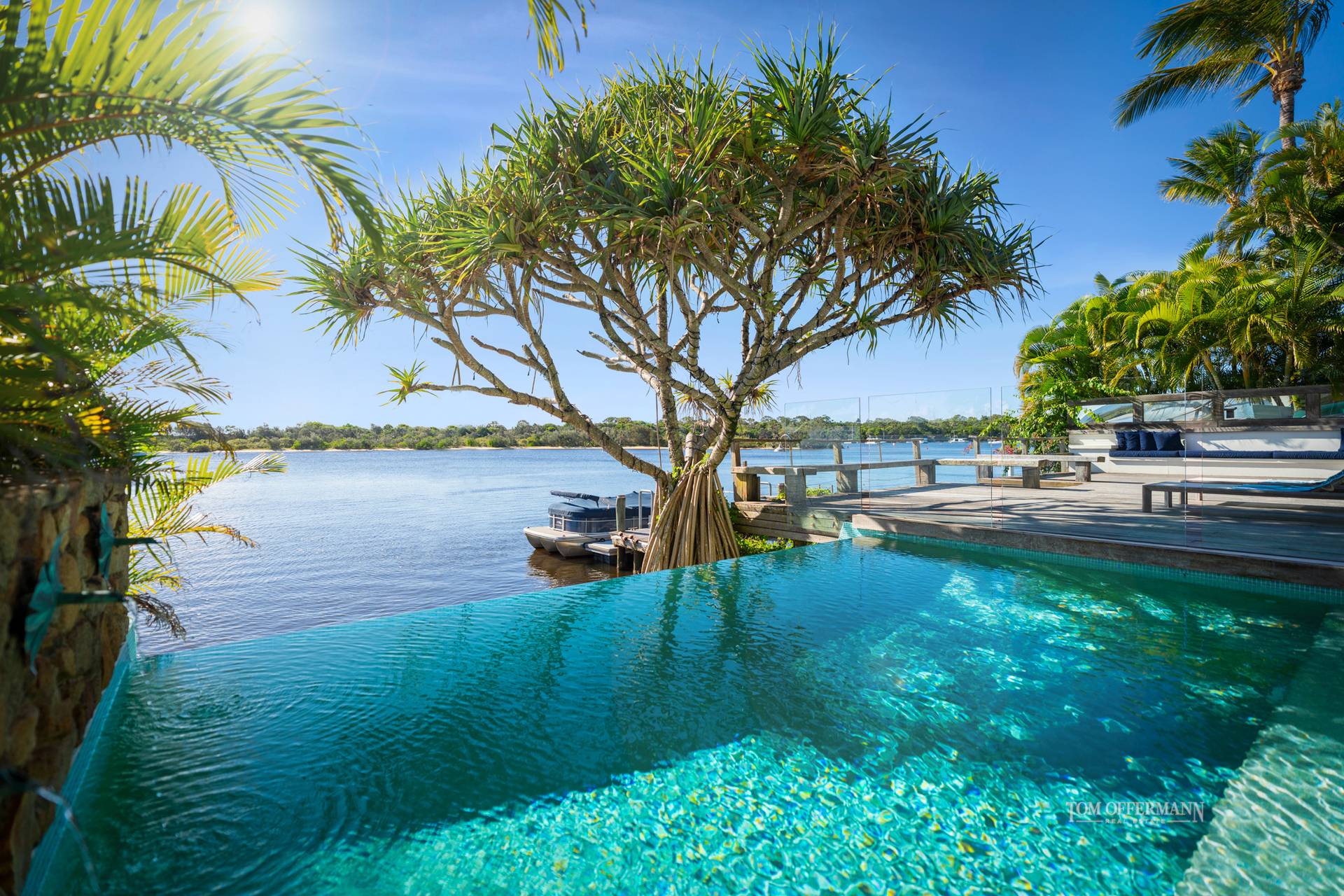 Blurring the lines naturally from indoors to out exemplifying the adage of living loving the good life every day, are disappearing sliders stretching the width of the northern side, divulging unimpeded connections to the capacious entertaining terrace with statement Pandanus, outdoor kitchen, dining and leisure furniture. Next level alfresco is the luminescent mosaic-tiled pool ostensively suspended and morphing into the river.