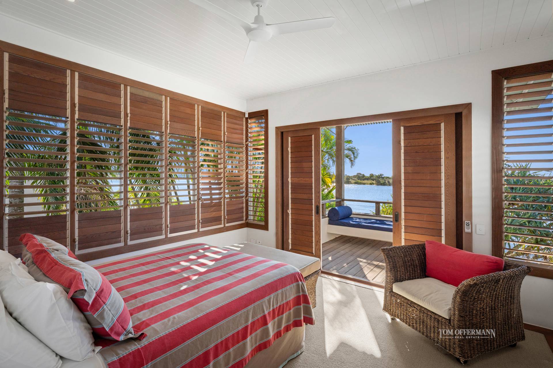 • Bedrooms: total 5; upstairs off mezzanine 2 w undercover terrace, daybeds & nth-facing river views incl premier suite retreat w walk-in robe & ensuite; eastside 1 w cabinetry/desk; west side - carpeted lounge w sofas & custom cabinetry; adjacent suite retreat w BIR & ensuite; ground level - custom design 4 bunks + BIR; 5th bedroom/study w WIR + adjacent store room; both share granite-tiled bathroom w plantation shutters & pebble lined bath; looks out to palm-filled garden