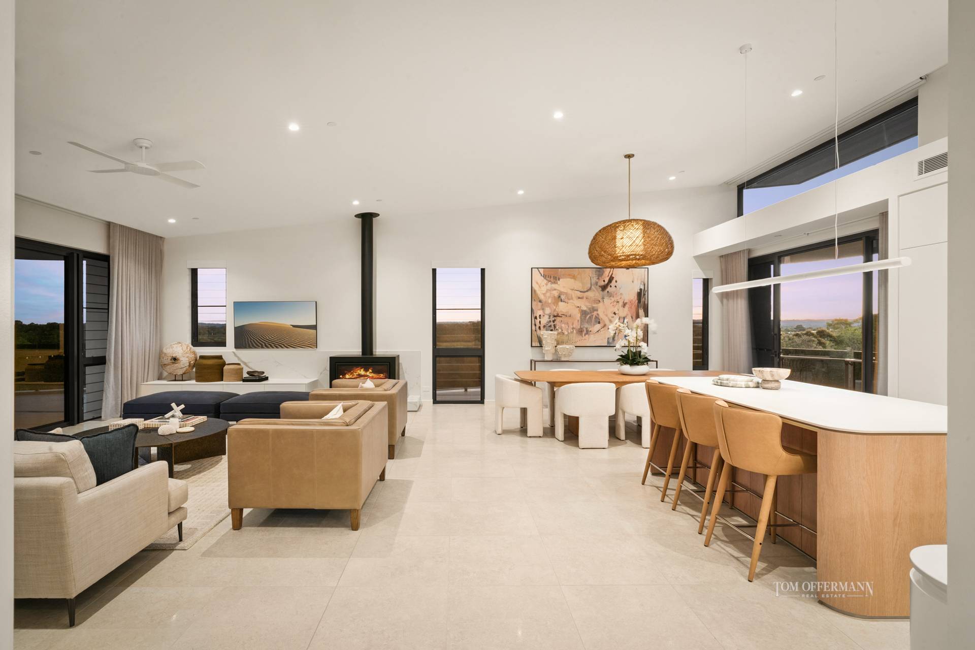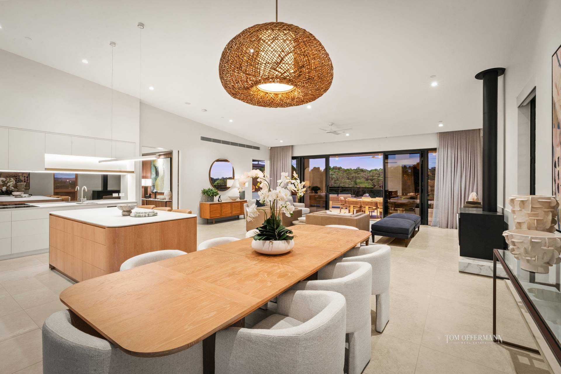 Balance and symmetry are accentuated by light-filled intuitive spaces, superlative finishes, a primarily neutral palette and lashings of sheen in the lofty ceilinged prodigious living areas. Sumptuous sofas, comfy armchairs, large art works, beautiful accessories and an eco-fireplace add splashes of class, similarly the curvaceous dining table and chairs.