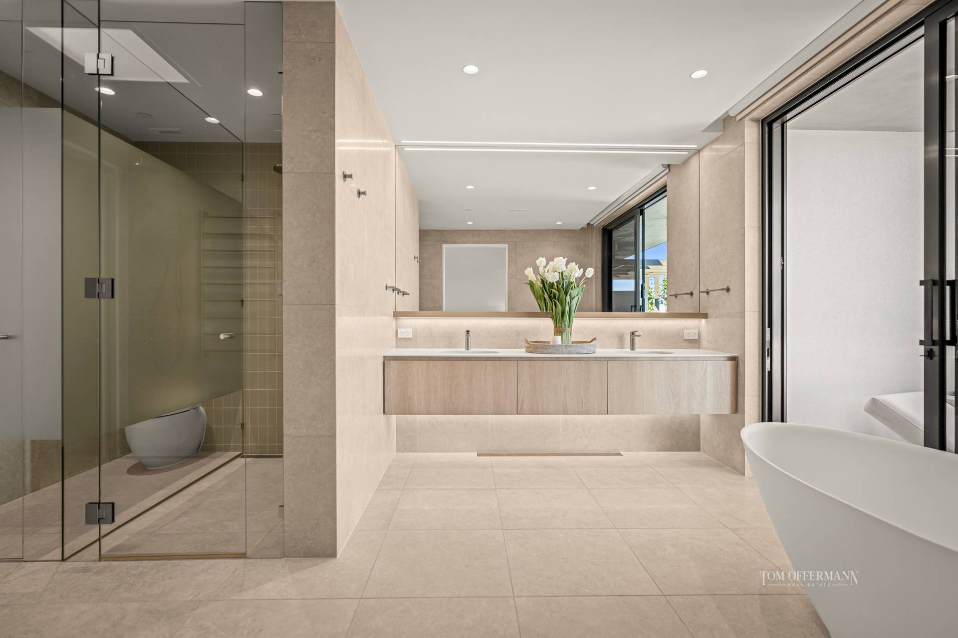 Sunshine shadow dances over the natural stone-toned floors as the extensive use of disappearing glass maximises the coalescence to alfresco, albeit the substantial 300m2 terraces with custom seating, elevated gardens, outdoor kitchen with barbeque, also striking dining and lounge furniture.
