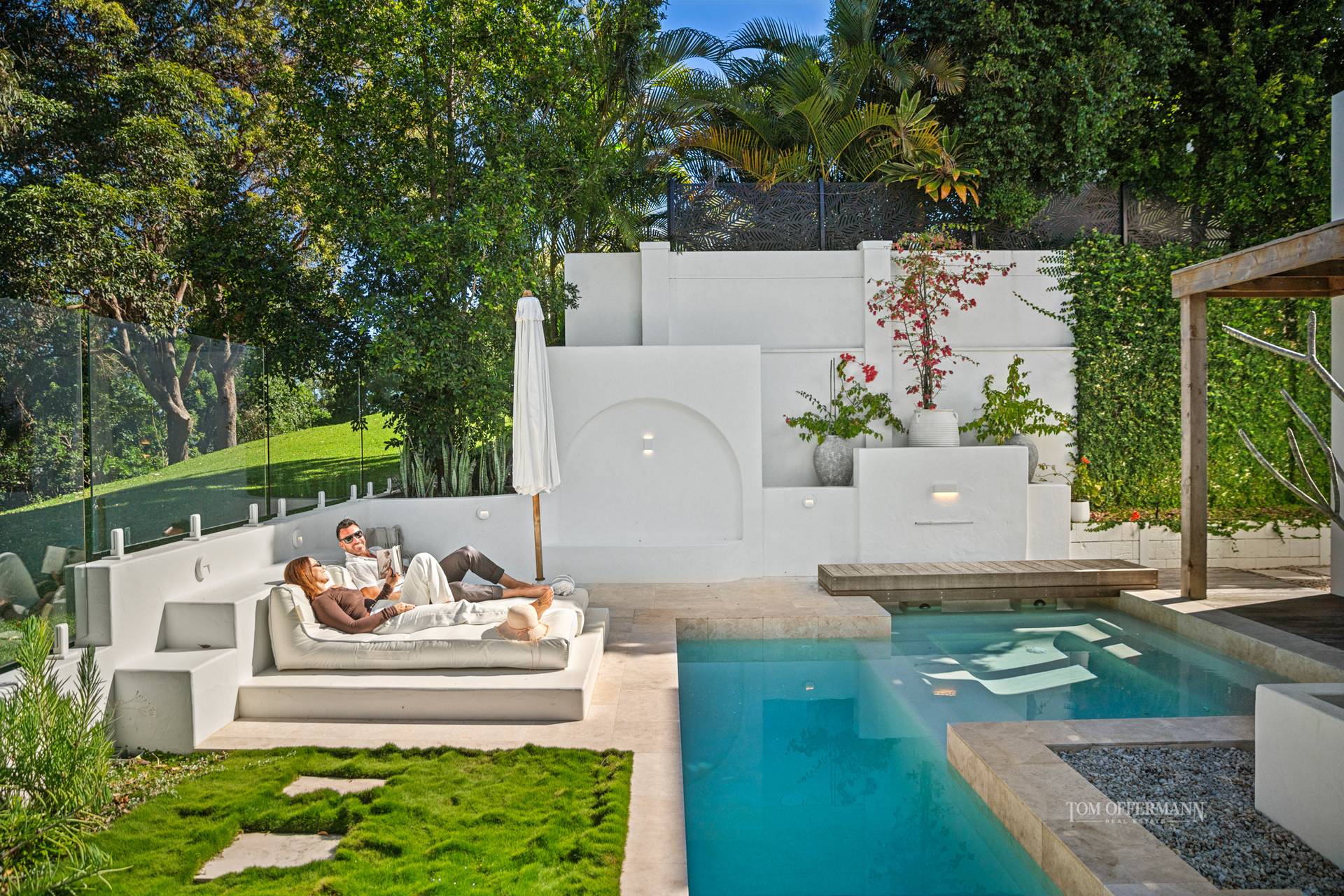 Thanks to disappearing banks of glass, natural light invites itself indoors to shadow dance over the endless oak floors. Meanwhile effortless elegance morphs alfresco to coalesce with the terrace. Custom 'floating' sun lounges and elevated gardens accent the lengthy iridescent pool and walkway across to the eucalypt-fringed lawn.