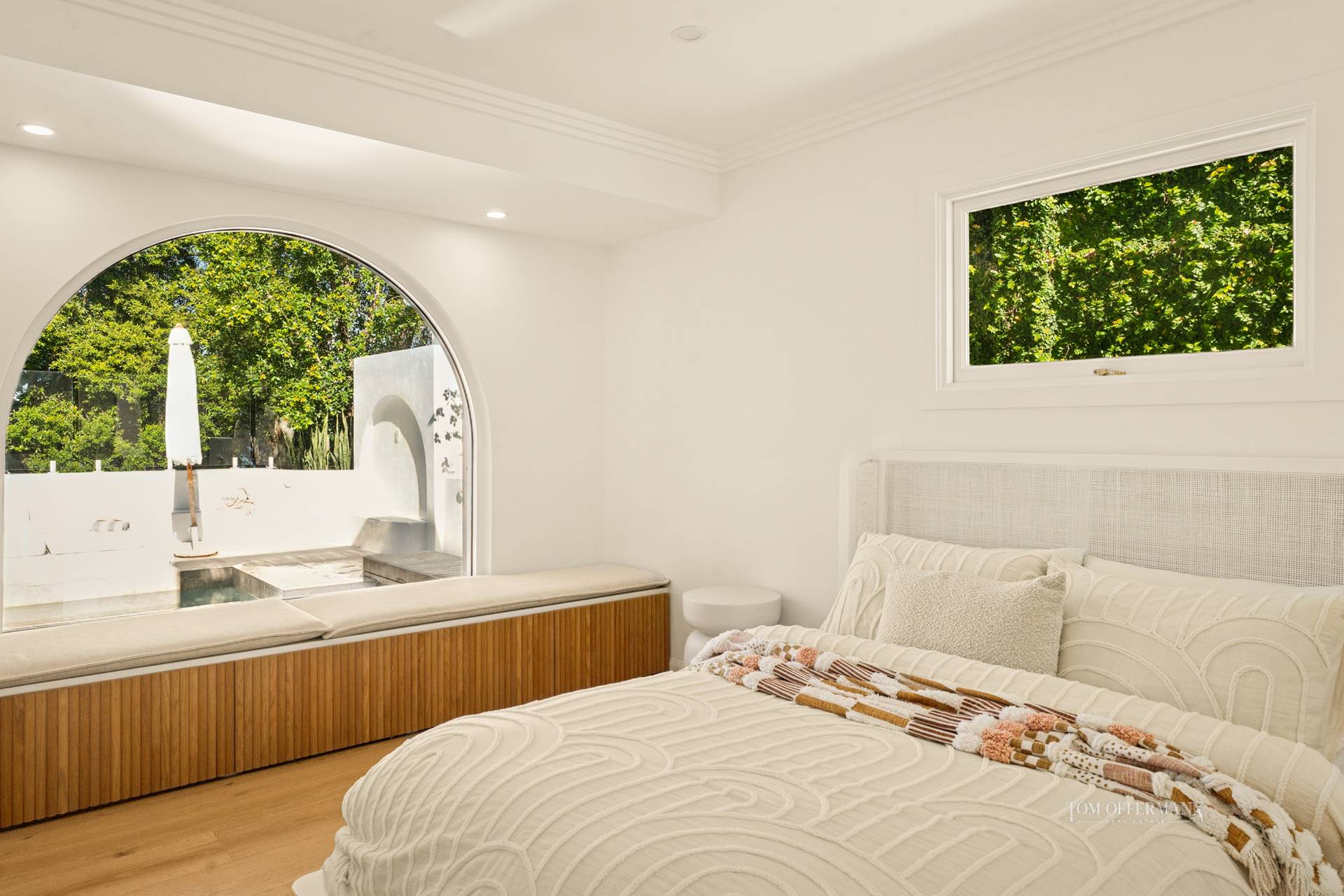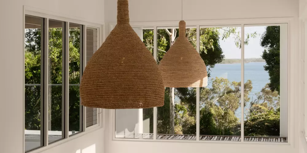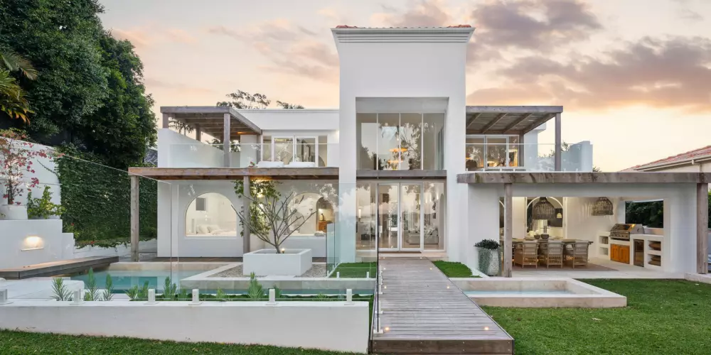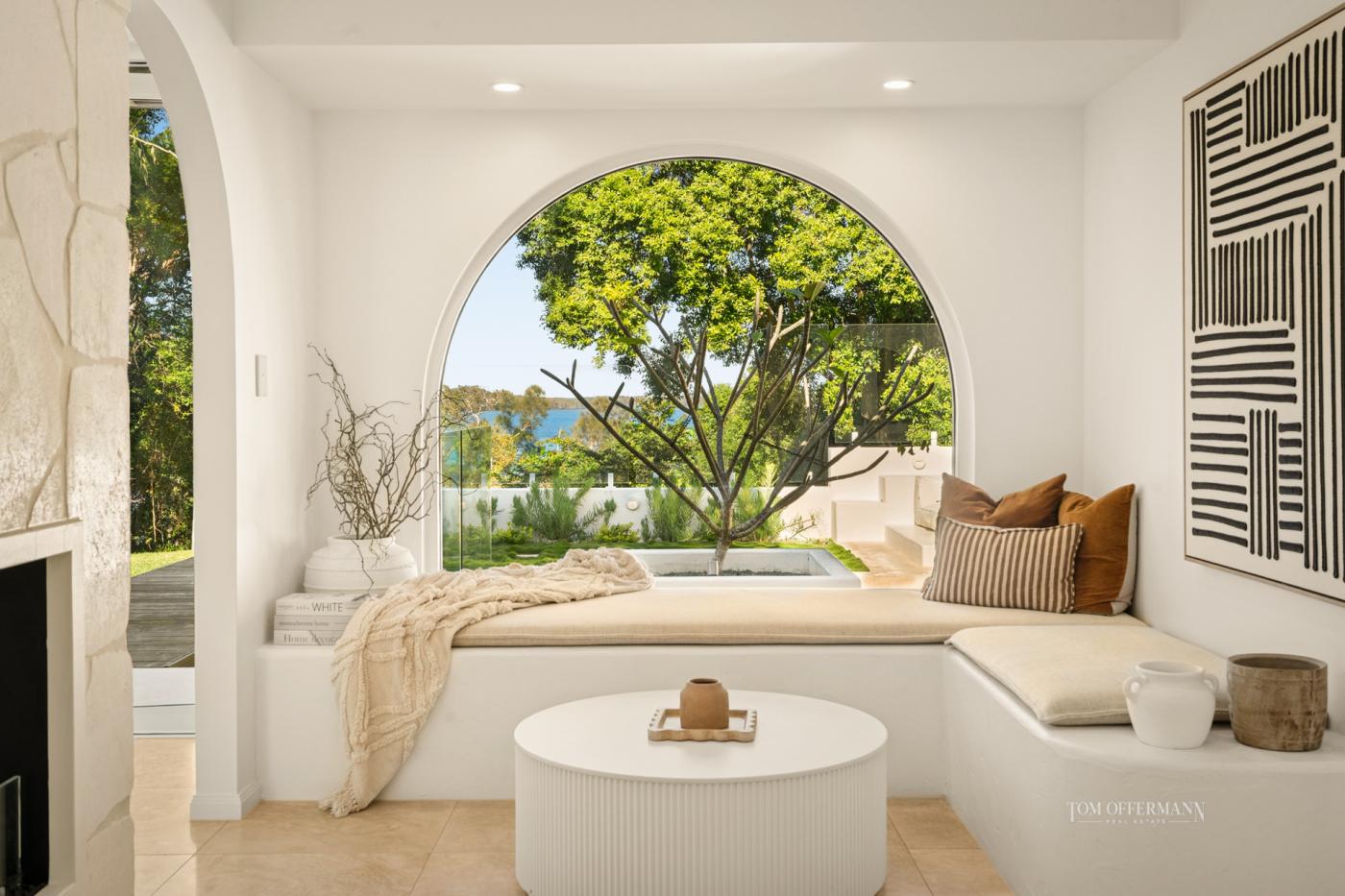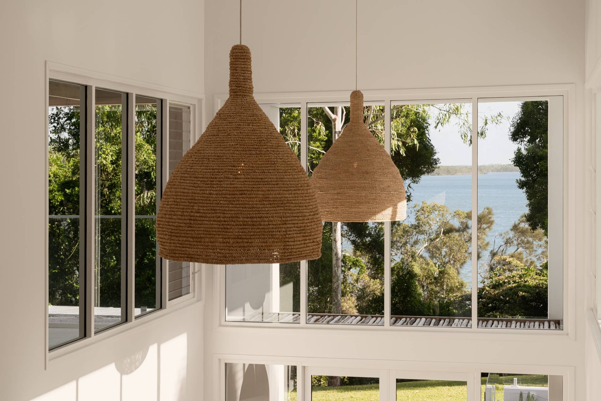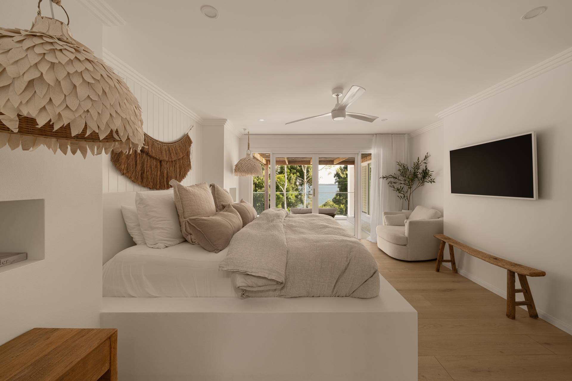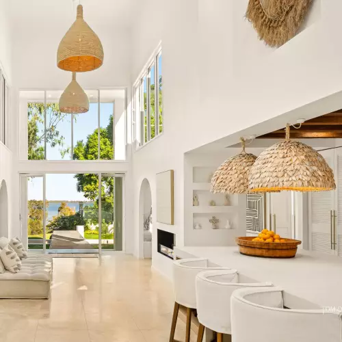 Be instantly besotted by multiple living spaces on the ground floor including a dedicated dining room. Tactile milky-white micro-cement has been used extensively, similarly natural textured and raw elements such as reclaimed timber beams. There's a two-way eco fireplace and making statements all over the show stopper are seriously striking pendants in hand woven fibres of coconut shell, palms and leaves. And wherever you look, ravishing curvaceous lines are featured in custom joinery and echoed in furniture choices.