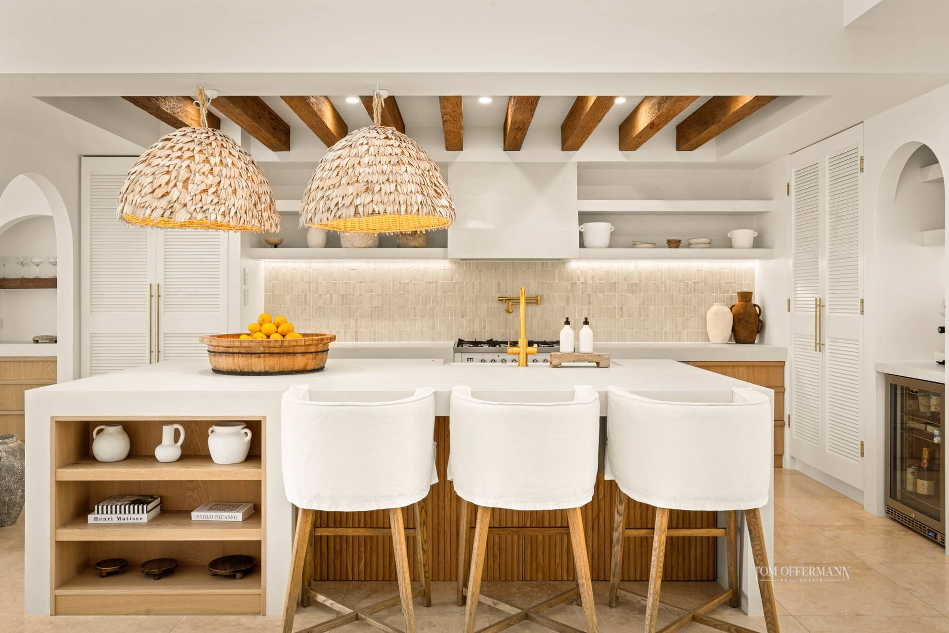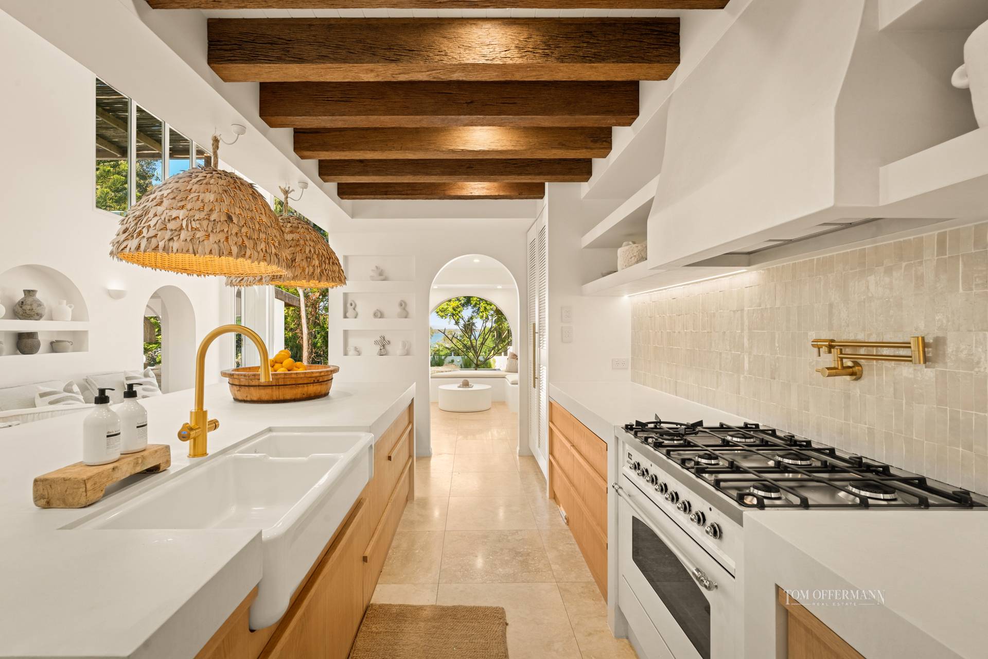 Entertaining options are obviously numerous and with such a well-designed deluxe custom kitchen, culinary aficionados will be in their element. Framed by custom louvred doors and natural textures including custom micro-cement topped Tasmanian oak cabinetry, pendant-adorned island breakfast plus separate coffee bar. The splashback features handcrafted mosaic tiles and there's a veritable array of the latest appliances such as a Ilve oven and six-hob gas cooktop. Outdoors is a barbeque and bar fridge.