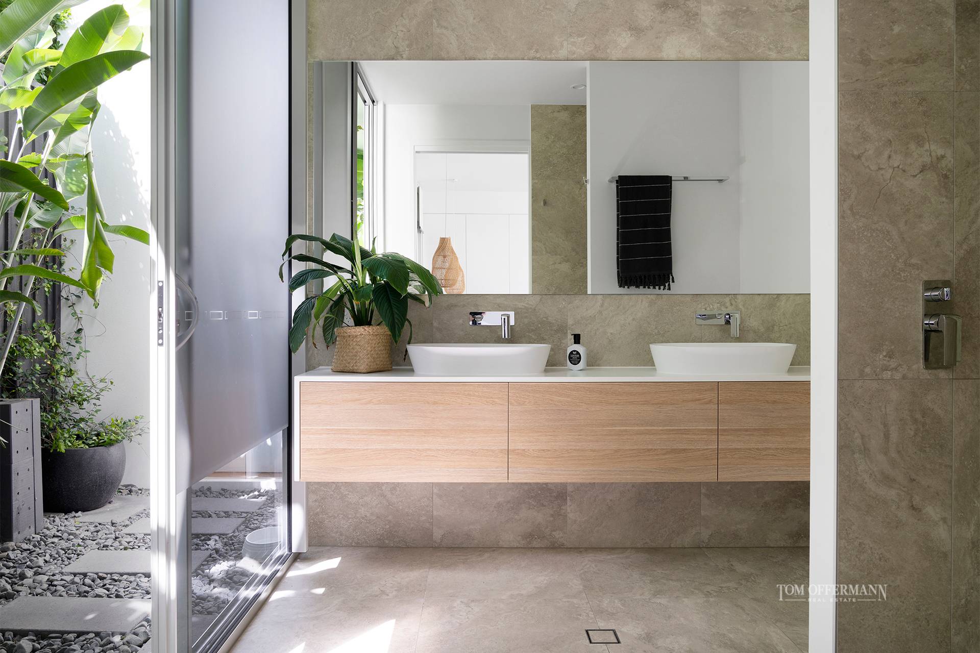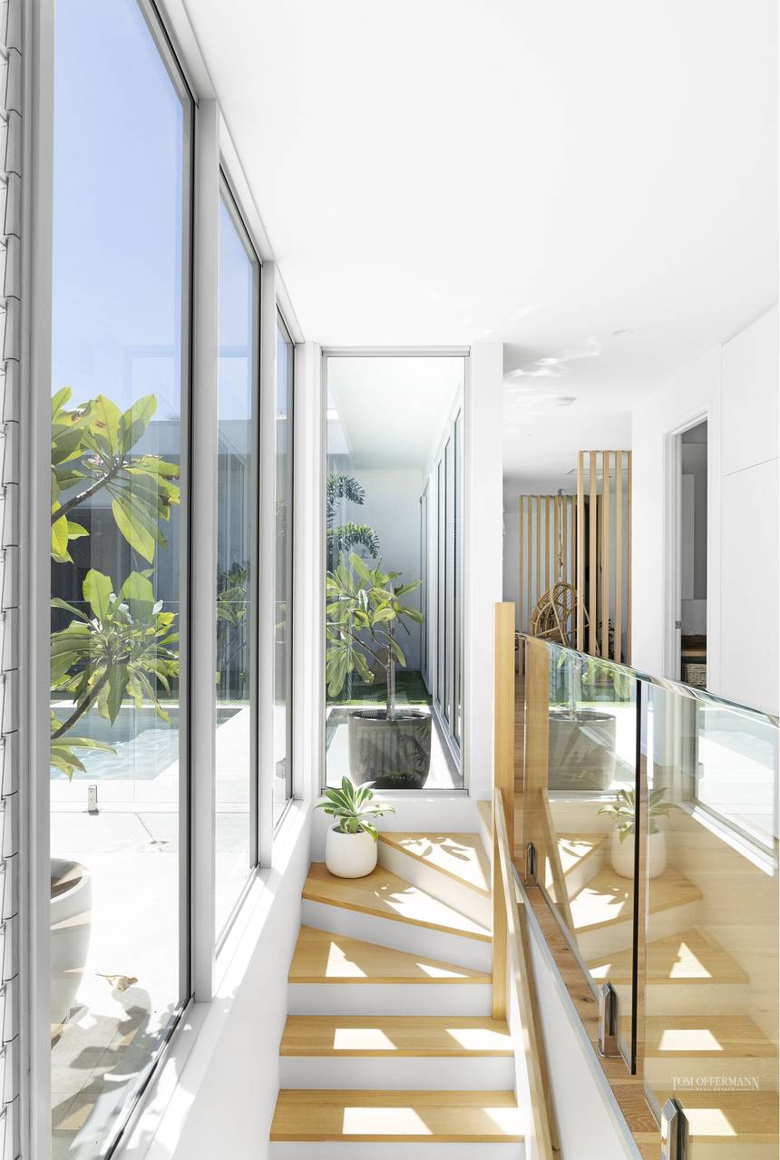 First impressions, from eye-catching mature palms and pandanus, a brise soleil façade using a raw palette of materials to stupendous glass doors opening into an elegant high ceilinged entry foyer, the reasons become obvious.