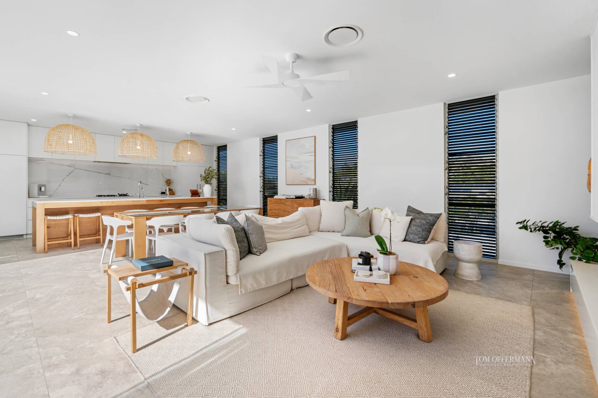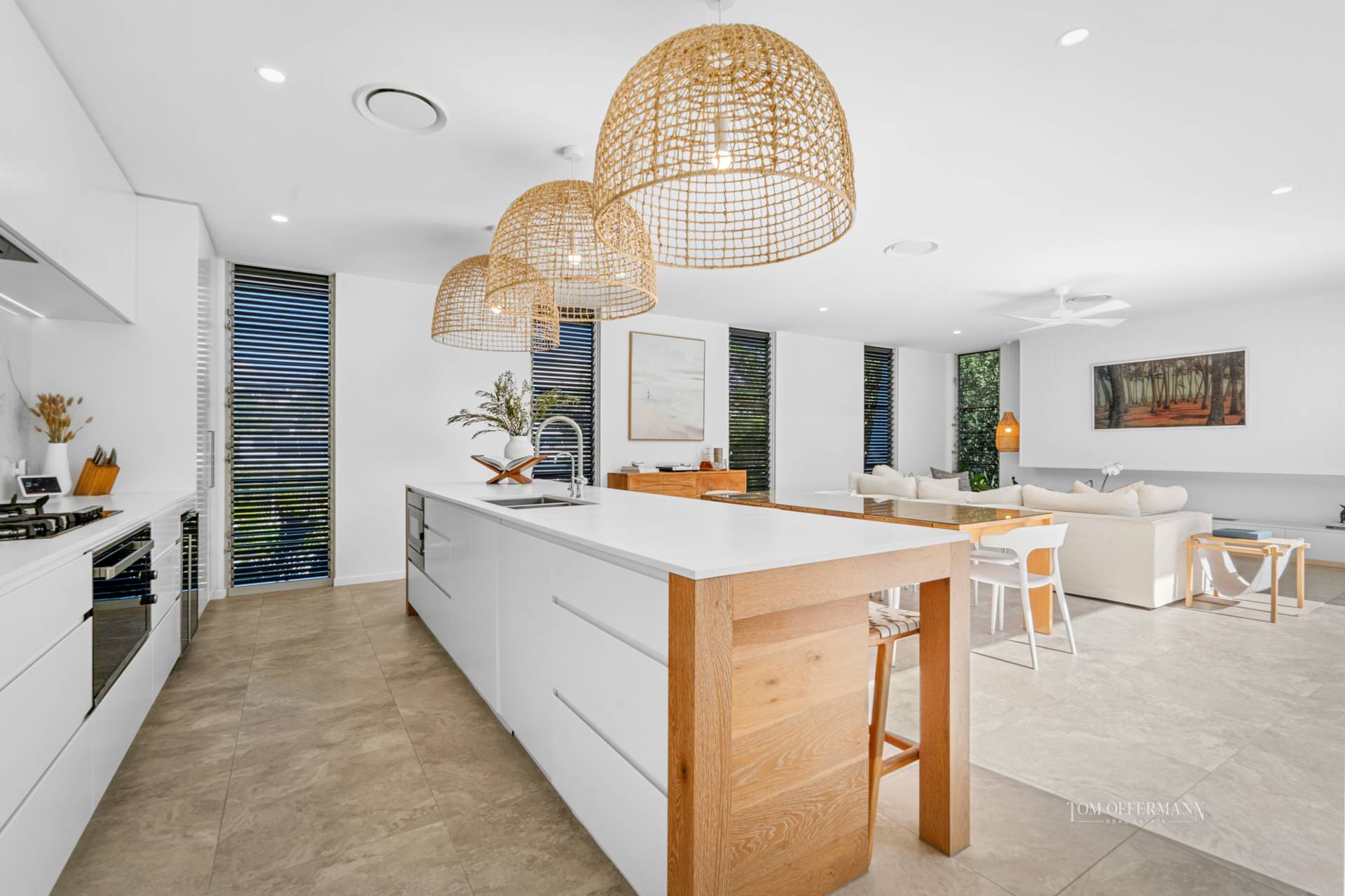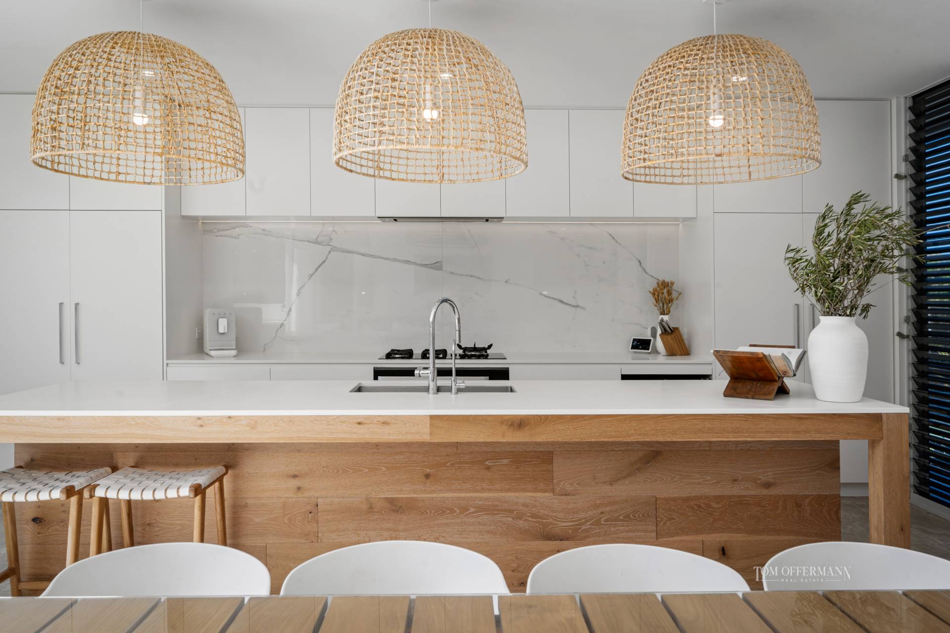 The latest in custom kitchens has a pastel creamy stone topped cabinetry including lengthy island breakfast bar with over-sized rattan pendants, marble splashback and commensurate are premium appliances such as De'Longhi oven and gas cooktop, Siemens fridge and Miele dishwasher both integrated.