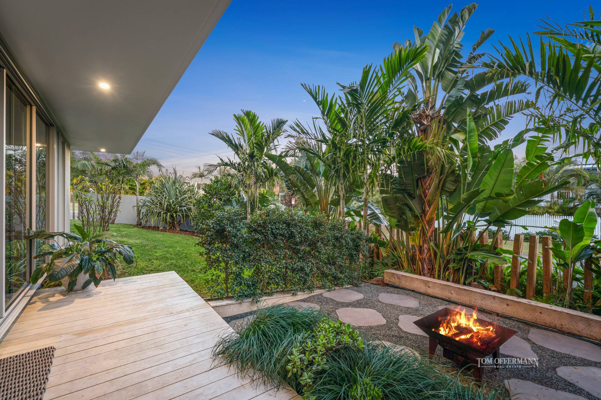 • Exterior: 6.3kW solar; front garden w palms & pandanus; downstairs terrace undercover w firepit, garden w palms; side street entrance w room for boat/caravan