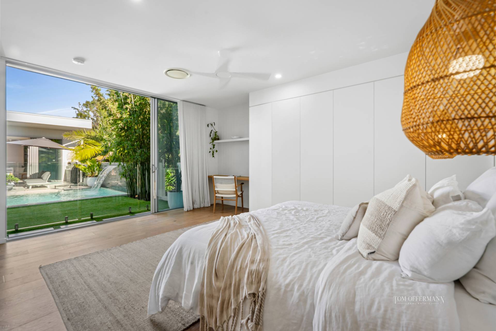 Admire endless beautiful oak flooring; look ahead to the awe-inspiring luminescent pool with a bridge and water wall. It steals the limelight by taking centre stage to the overall U-shaped design which also incorporates vast panes of glass on three sides, banks of louvres and disappearing doors.