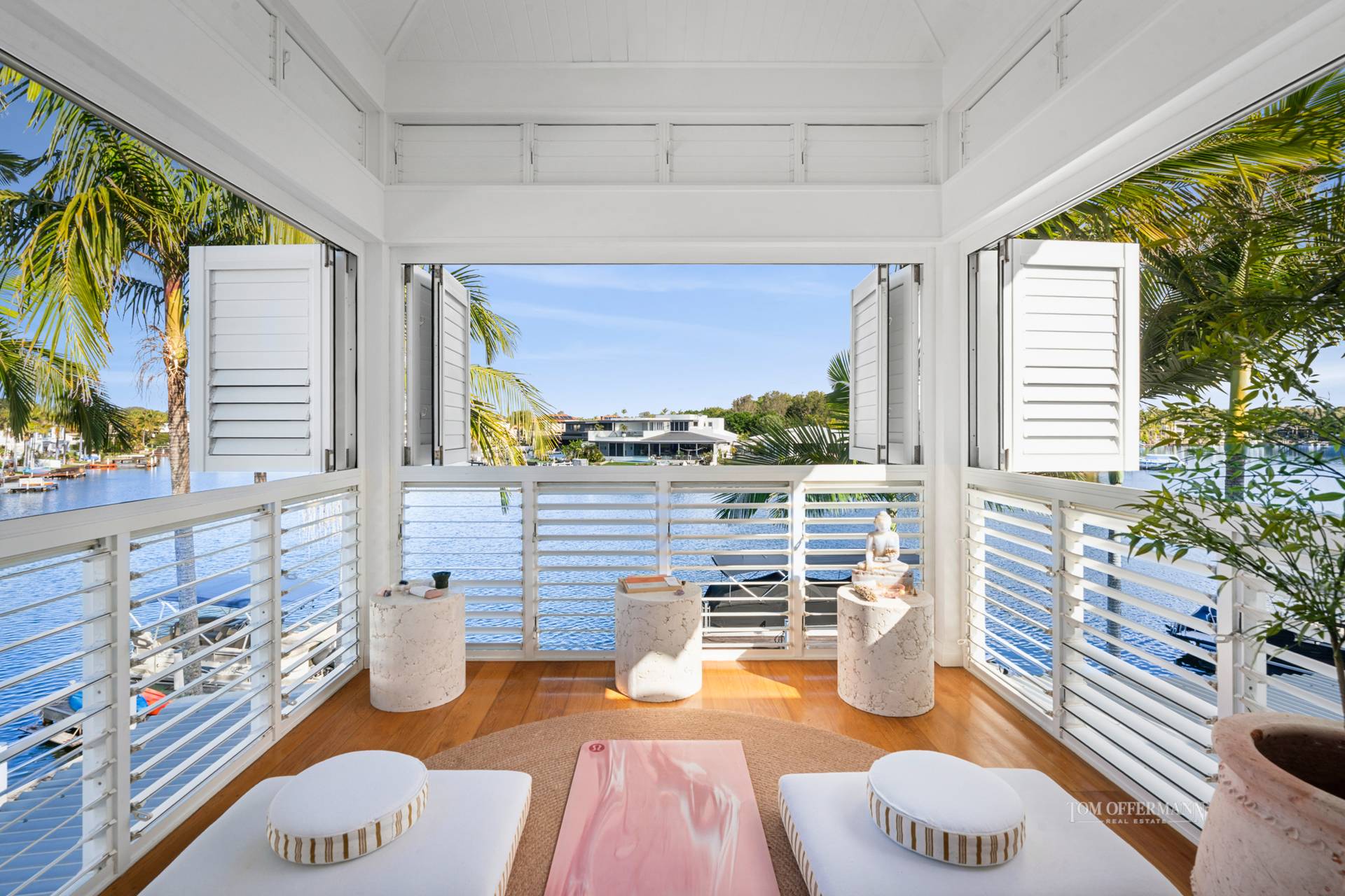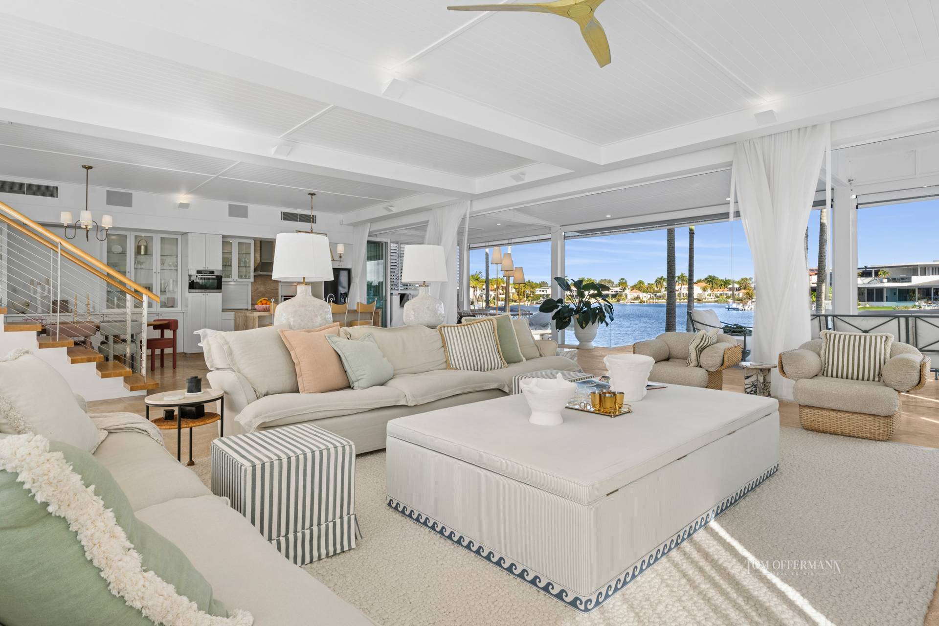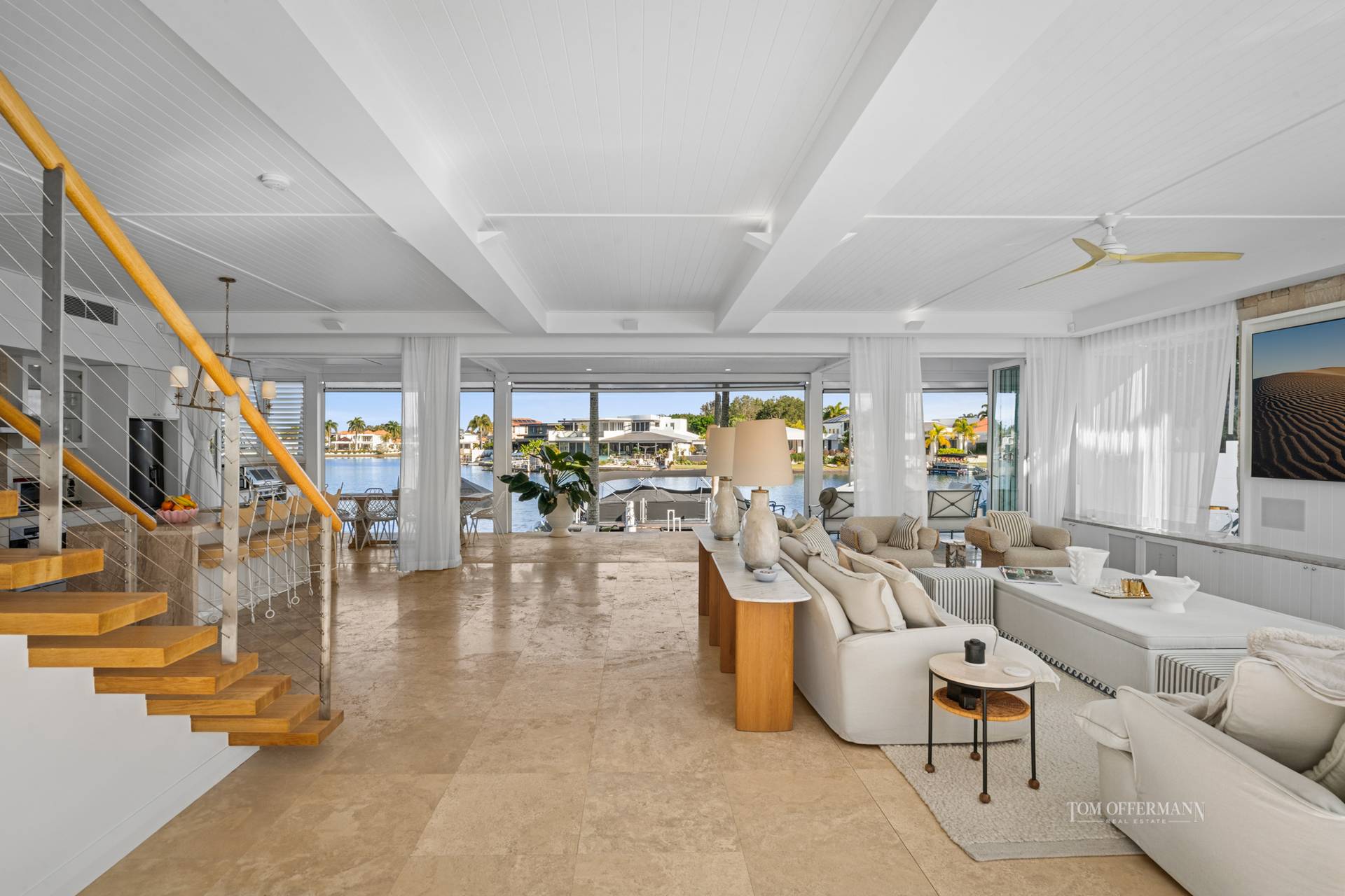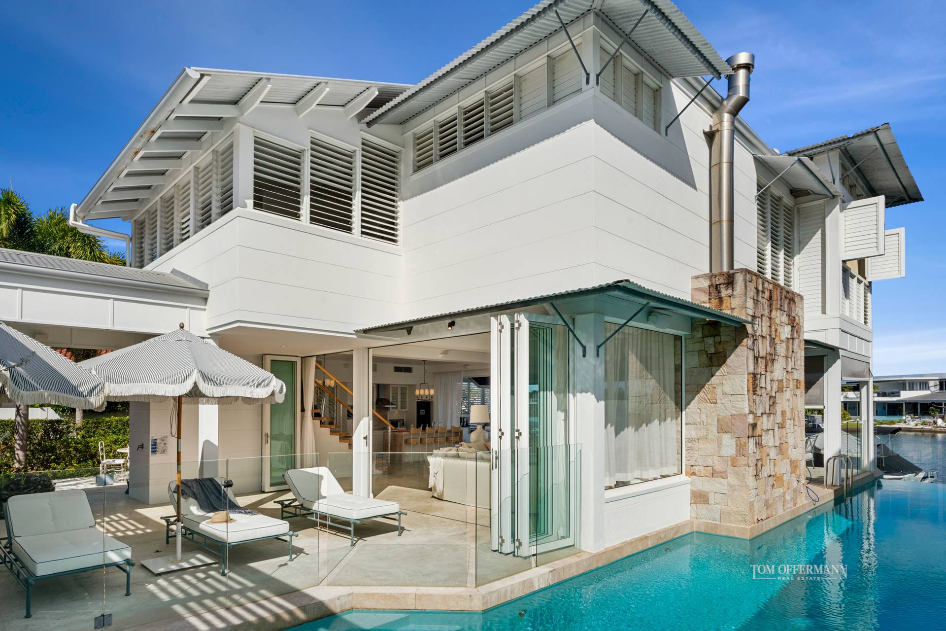 - Living Spaces: art frame TV in custom cabinetry featuring sandstone + day bed w pool outlook; disappearing doors nth to pool terrace + sth width of house open to main terrace w outdoor kitchen/BBQ; outdoor louvres; plentiful space for casual dining & leisure; approx. 180 views of wide waterways; few steps to lawn & jetty w 4 x statement fox tail palms