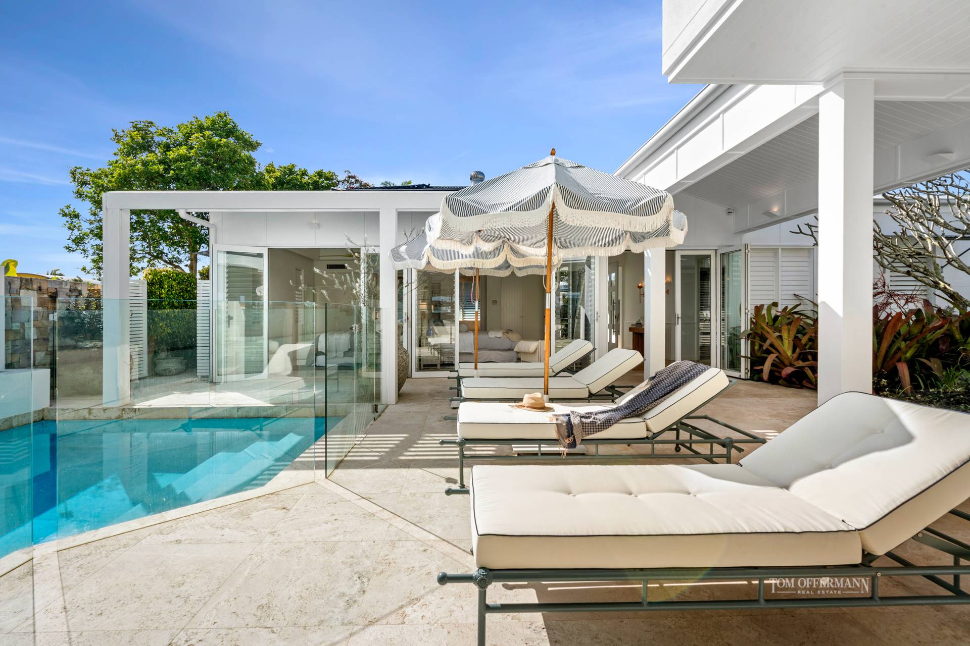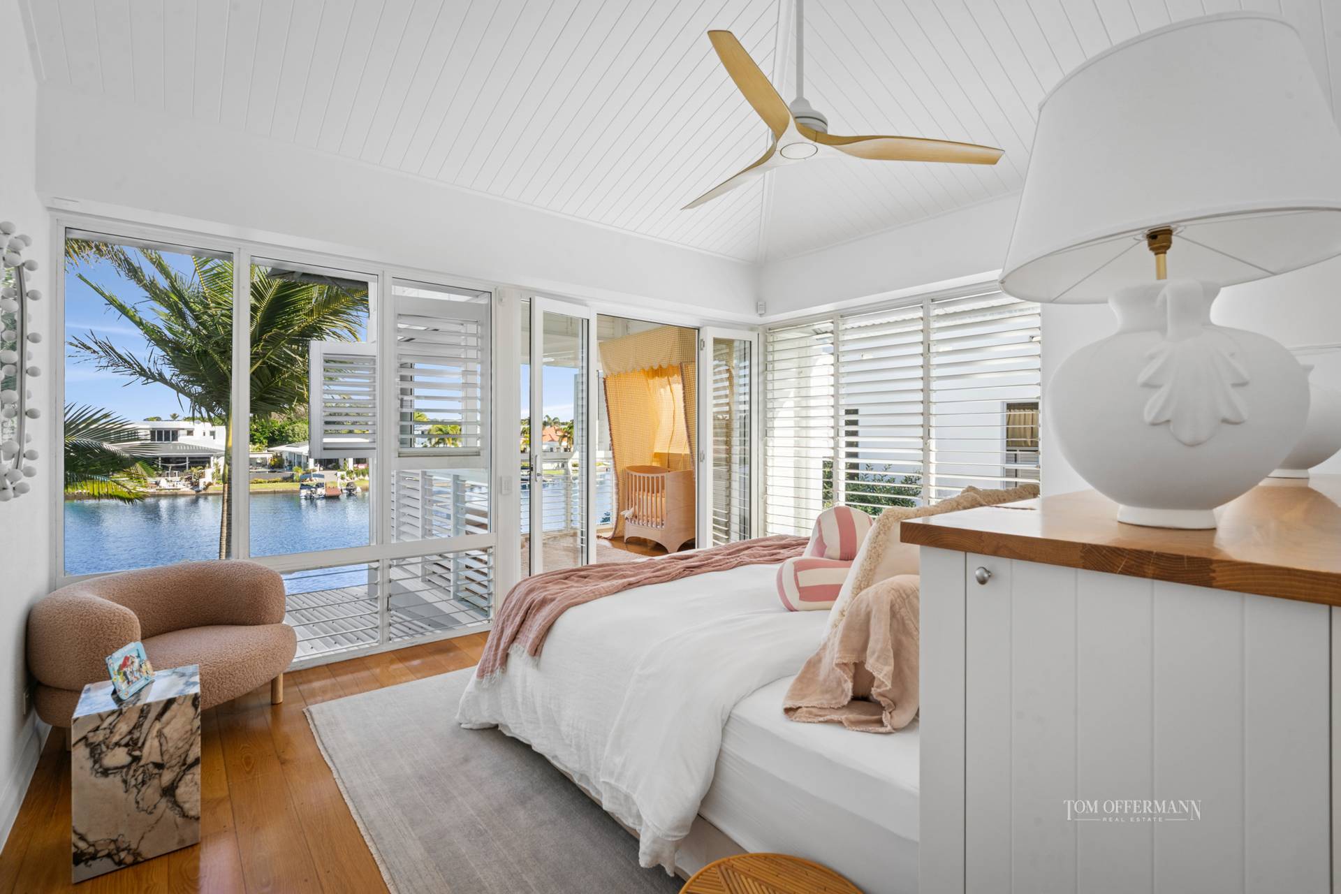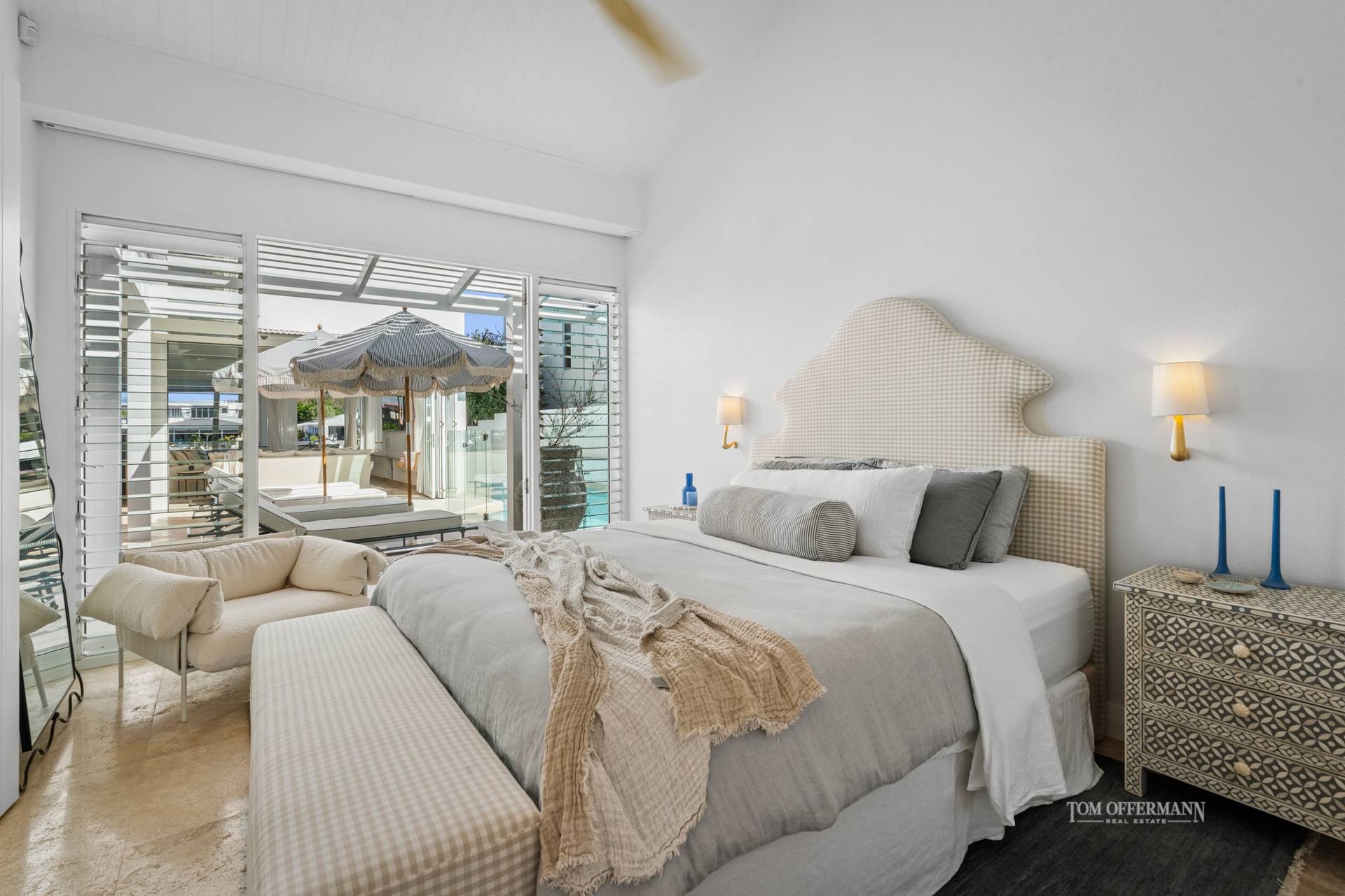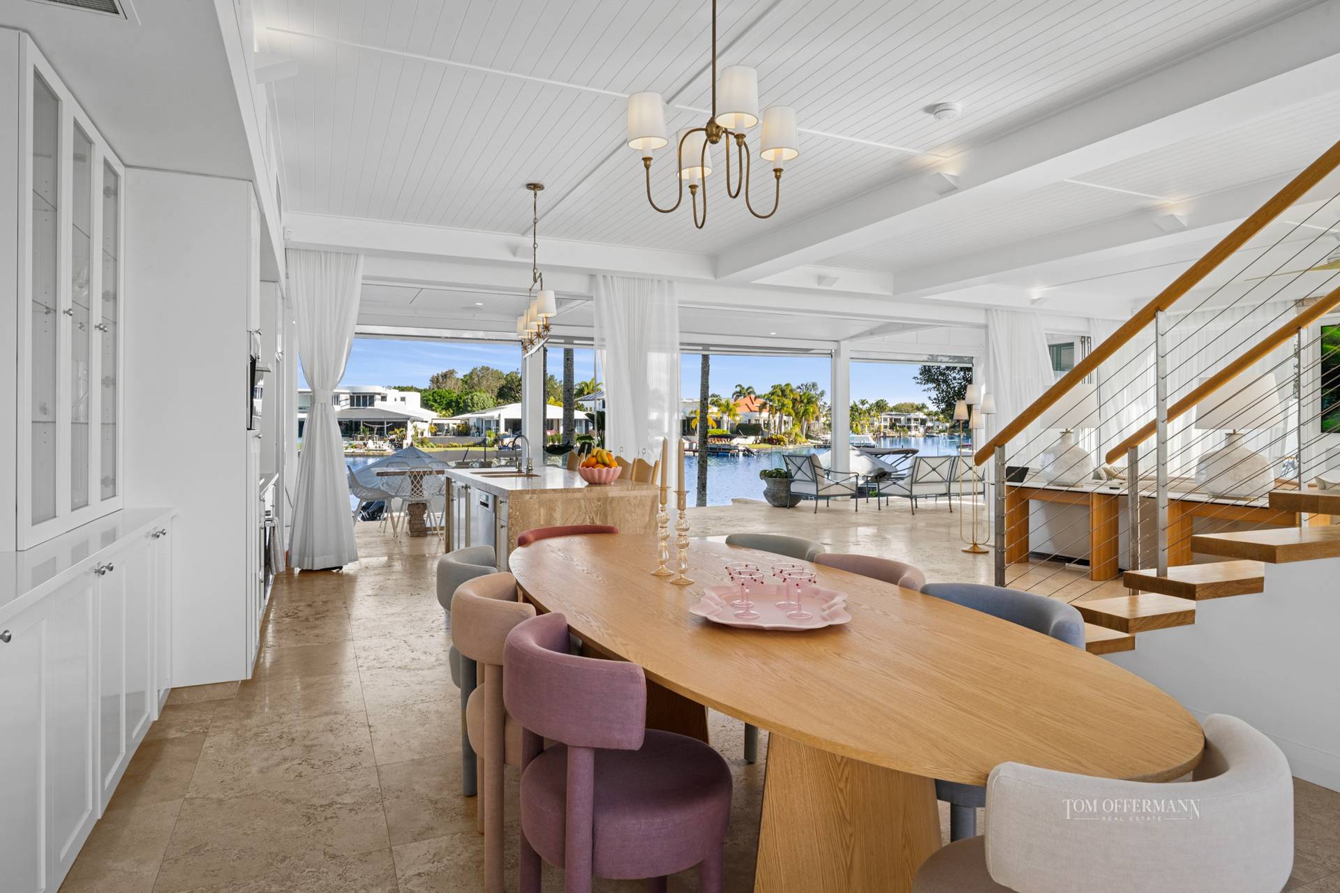 - Living Spaces: art frame TV in custom cabinetry featuring sandstone + day bed w pool outlook; disappearing doors nth to pool terrace + sth width of house open to main terrace w outdoor kitchen/BBQ; outdoor louvres; plentiful space for casual dining & leisure; approx. 180 views of wide waterways; few steps to lawn & jetty w 4 x statement fox tail palms