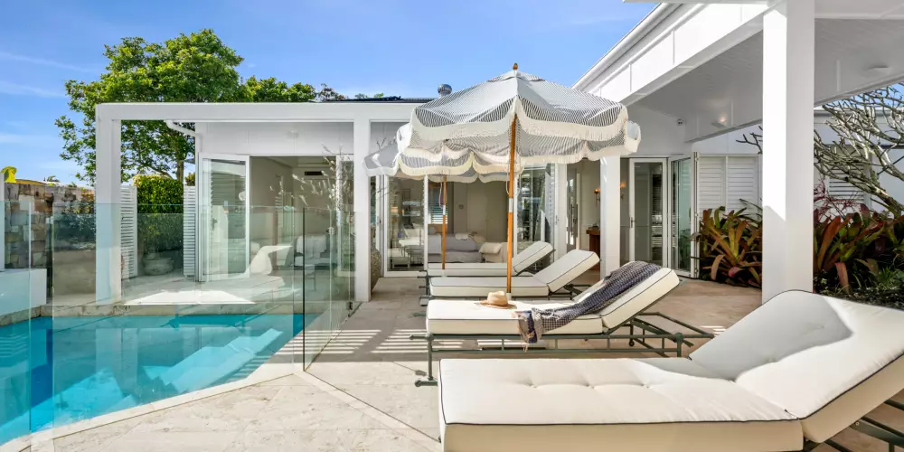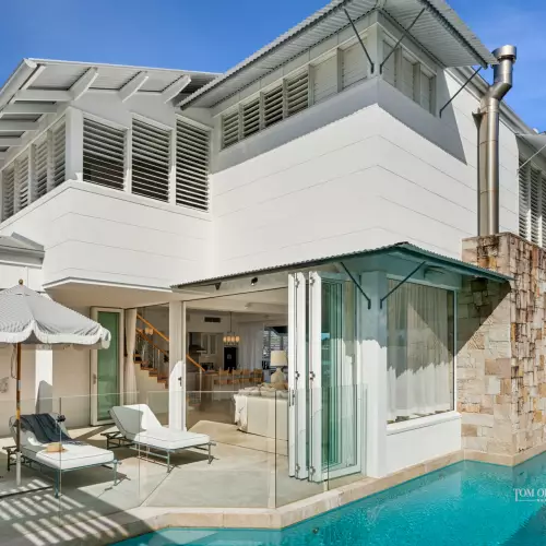 When it comes to next level bliss zones there are four bedrooms. Upstairs with raked VJ ceilings and wispy linen sheers, are two premier king suites and sunrooms with banks of louvres and overlooking the waterways, with built-in robes, custom bedheads, travertine ensuites plus a lounge on the northside. Two premier-style suites downstairs have built-in robes, travertine ensuites and one has a bathtub. Both have direct access to the sun terraces and pool. Nearby is the laundry room.
