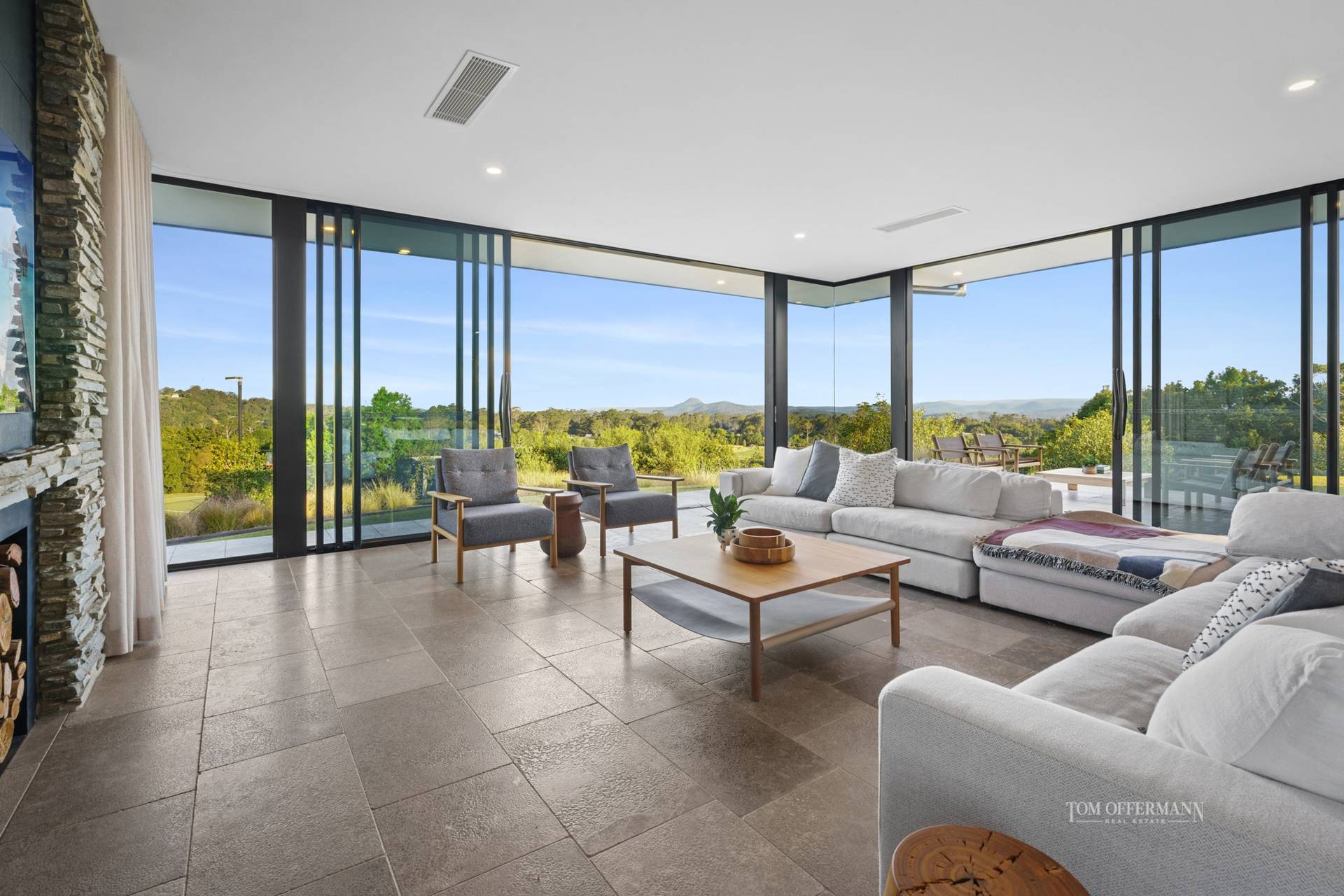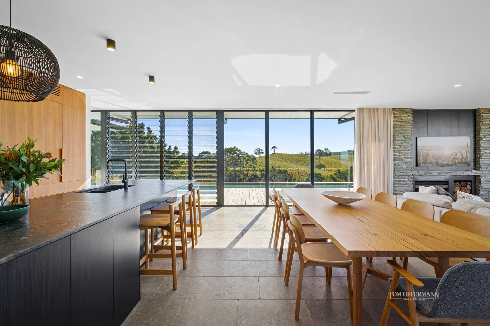Step inside this hinterland home and be instantly captivated, with expansive living and dining zones, where walls of glass dissolve boundaries and bring the outside in. Grey limestone tiles and waxed blackbutt floors feature underfoot, while a ceiling-height natural limestone fireplace anchors the space in understated grandeur. Vast terraces spill from every room, each one designed to soak in the coveted north-easterly aspect.