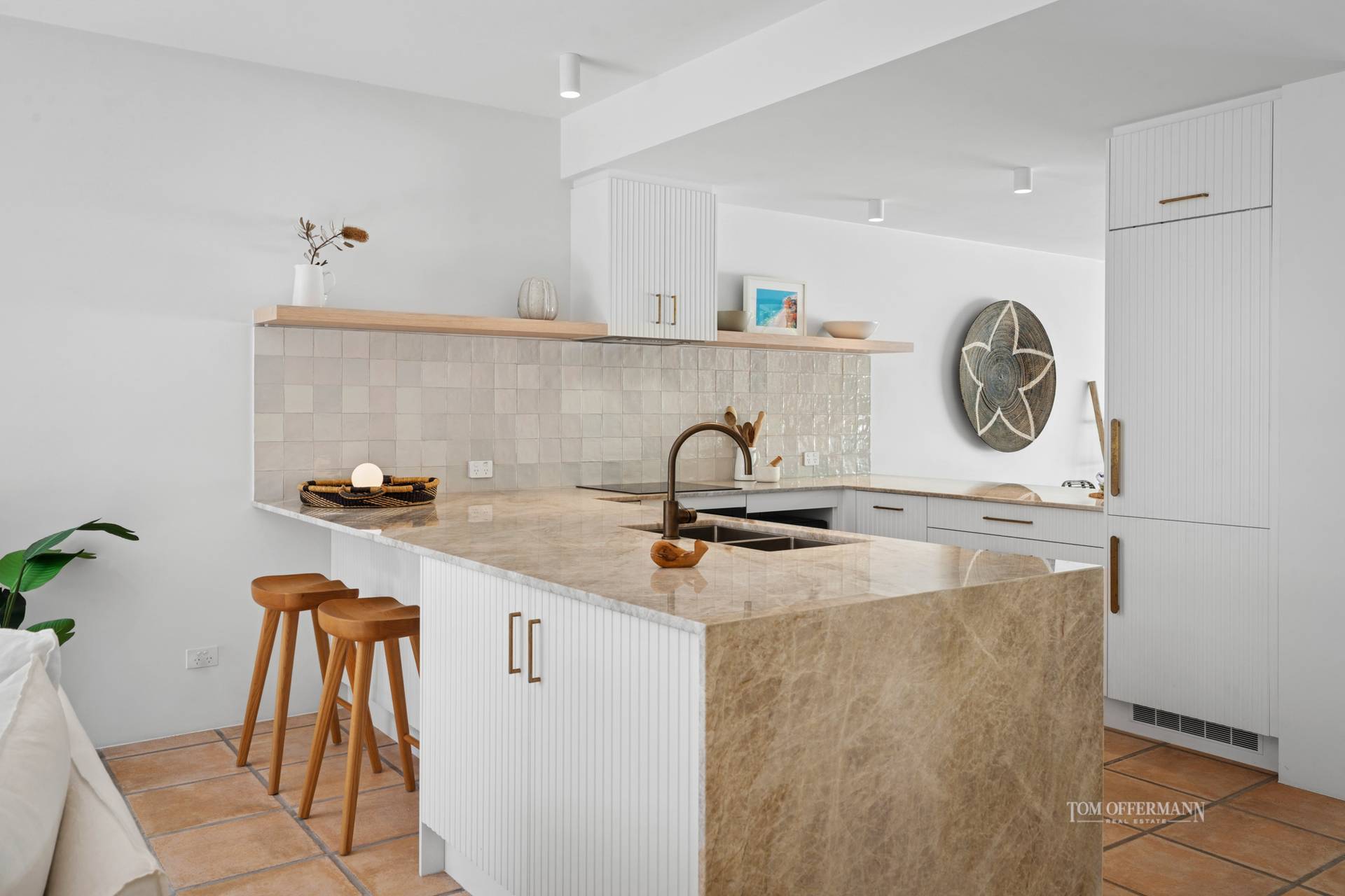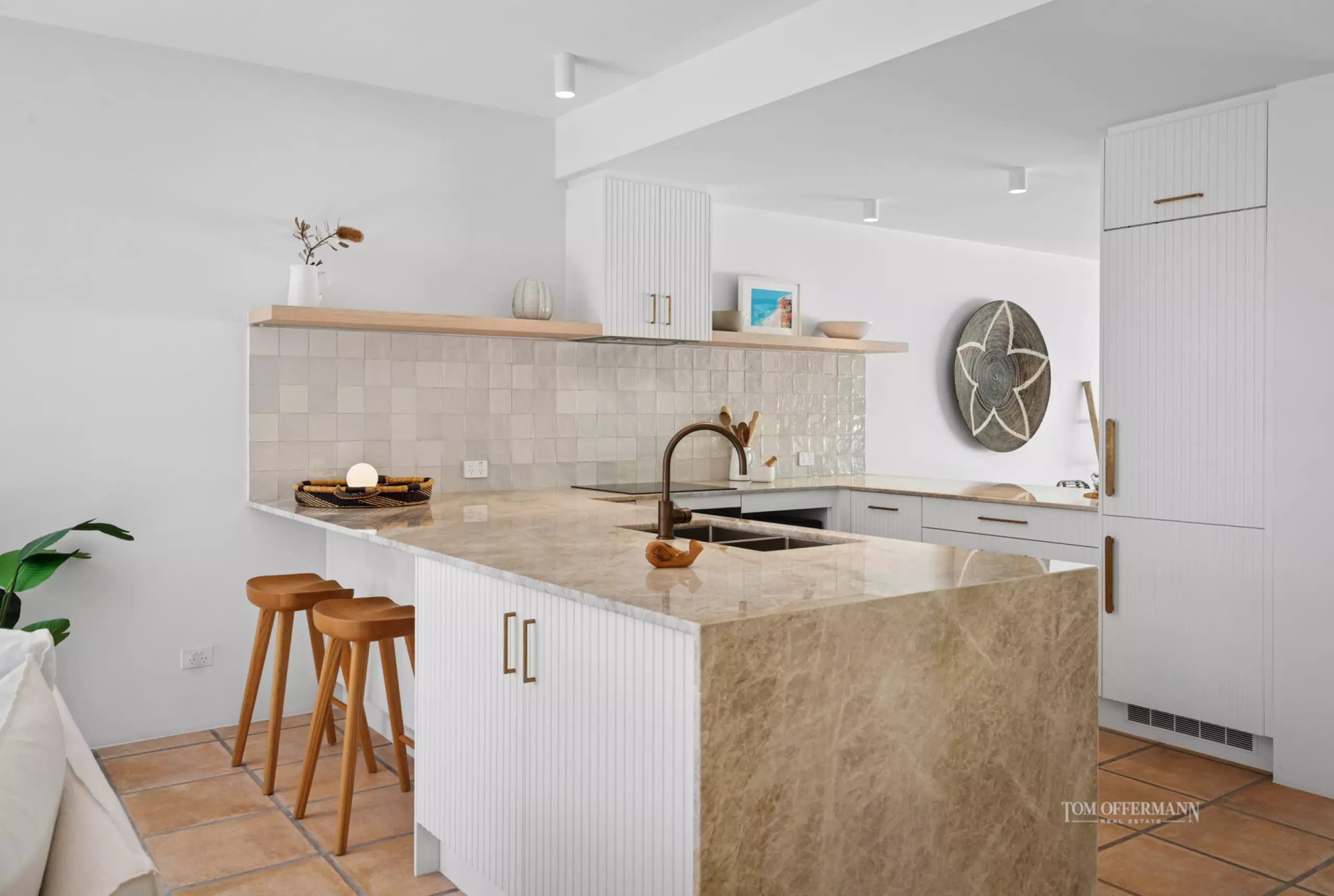 · Living/Dining/Kitchen: pastel terracotta tiles throughout/U-shape kitchen w Taj Mahal marble-topped fluted timber cabinetry incl 3m semi-island breakfast bar & servery; brushed aged brass tapware; mosaic-style splashback; all new high-end appliances incl Bosch oven & integrated dishwasher, Fisher & Paykel induction cooktop & fridge/freezer; Hisense fridge under servery