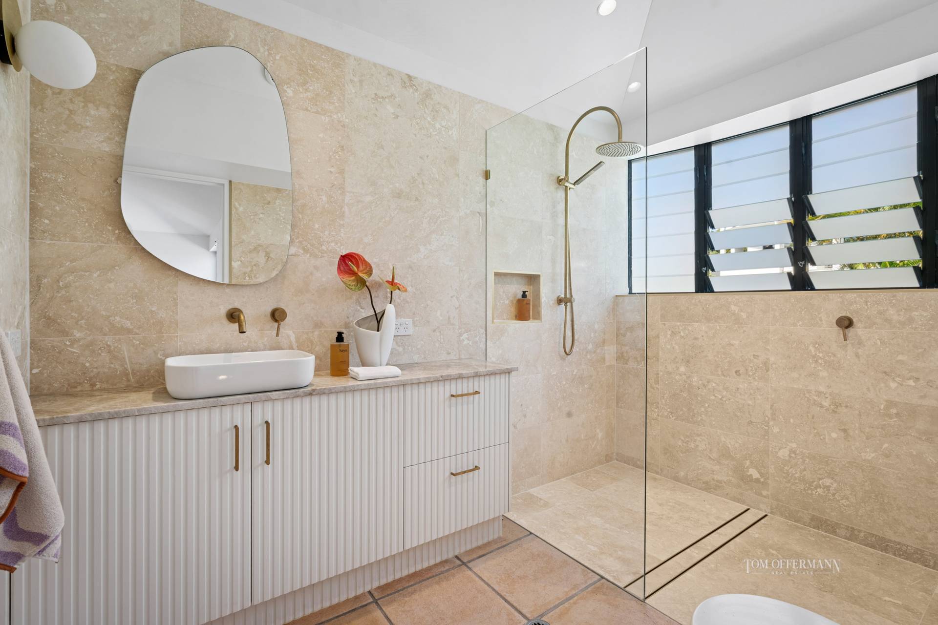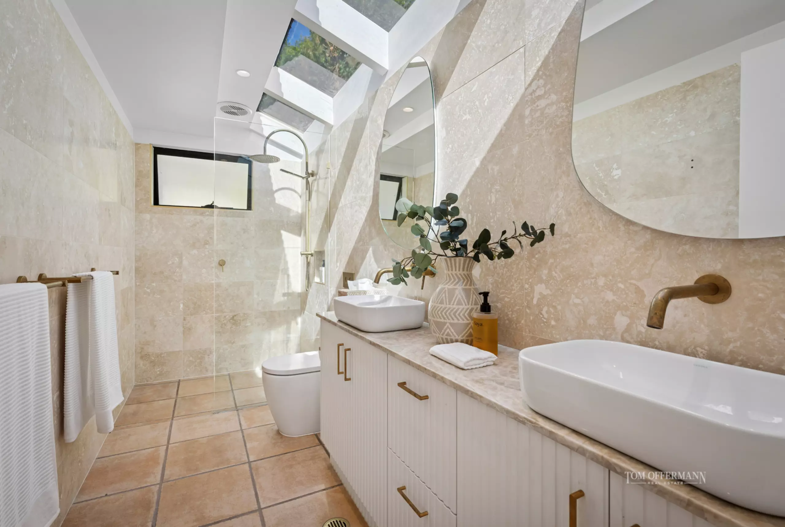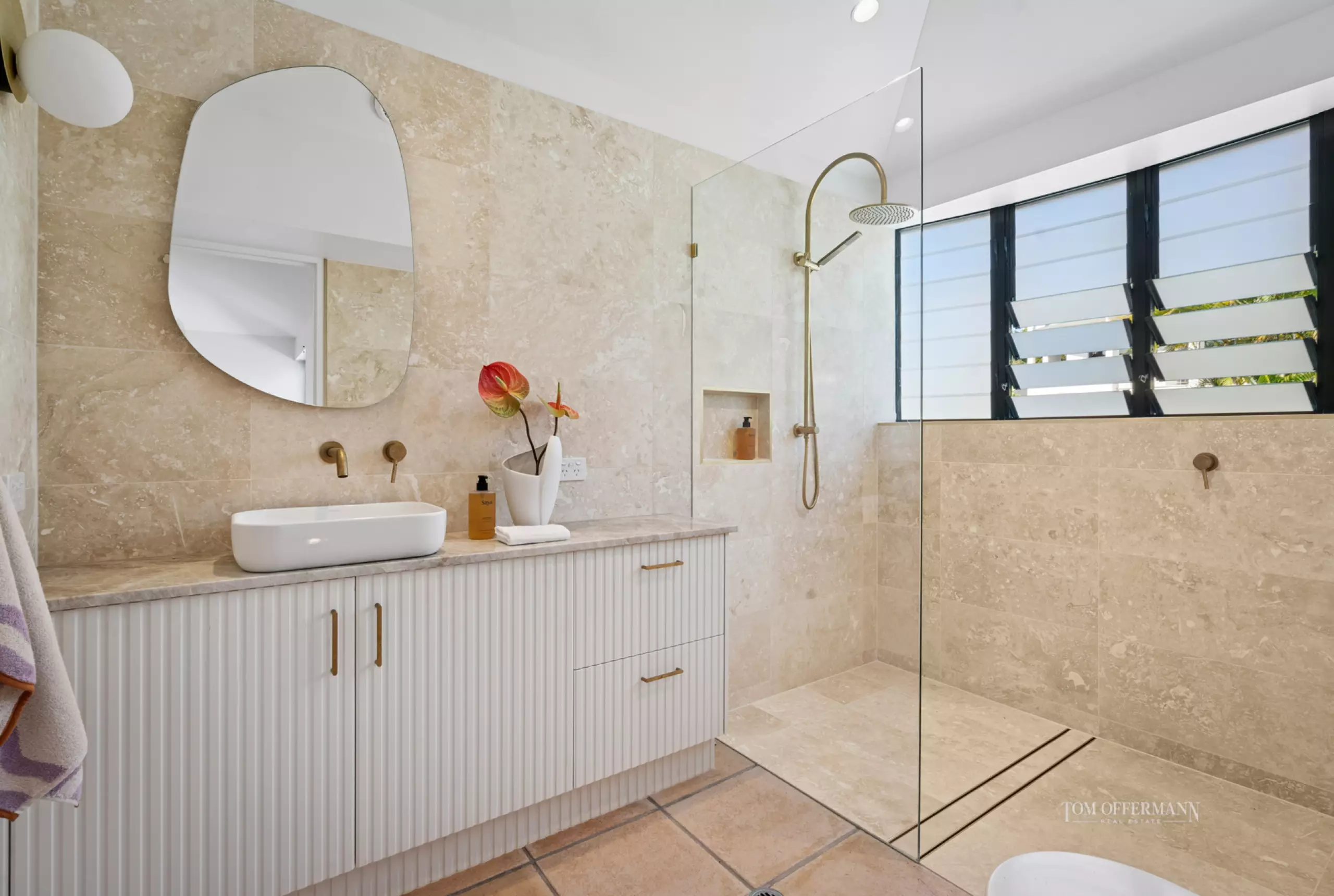 · Bedrooms; 3 all carpeted; premier suite retreat mid ground level; curved walls/angled ceilings; WIR w fluted timber robe doors; travertine-tiled ensuite w stone-topped 2-basin fluted timber cabinetry; light sensitive/demister oval mirrors; skylight; drencher shower; brushed brass tapware; upper-level raked ceilings & curvaceous features; 2 bedrooms w BIRs & bathroom w louvres overlooking garden styled as per the previous rooms