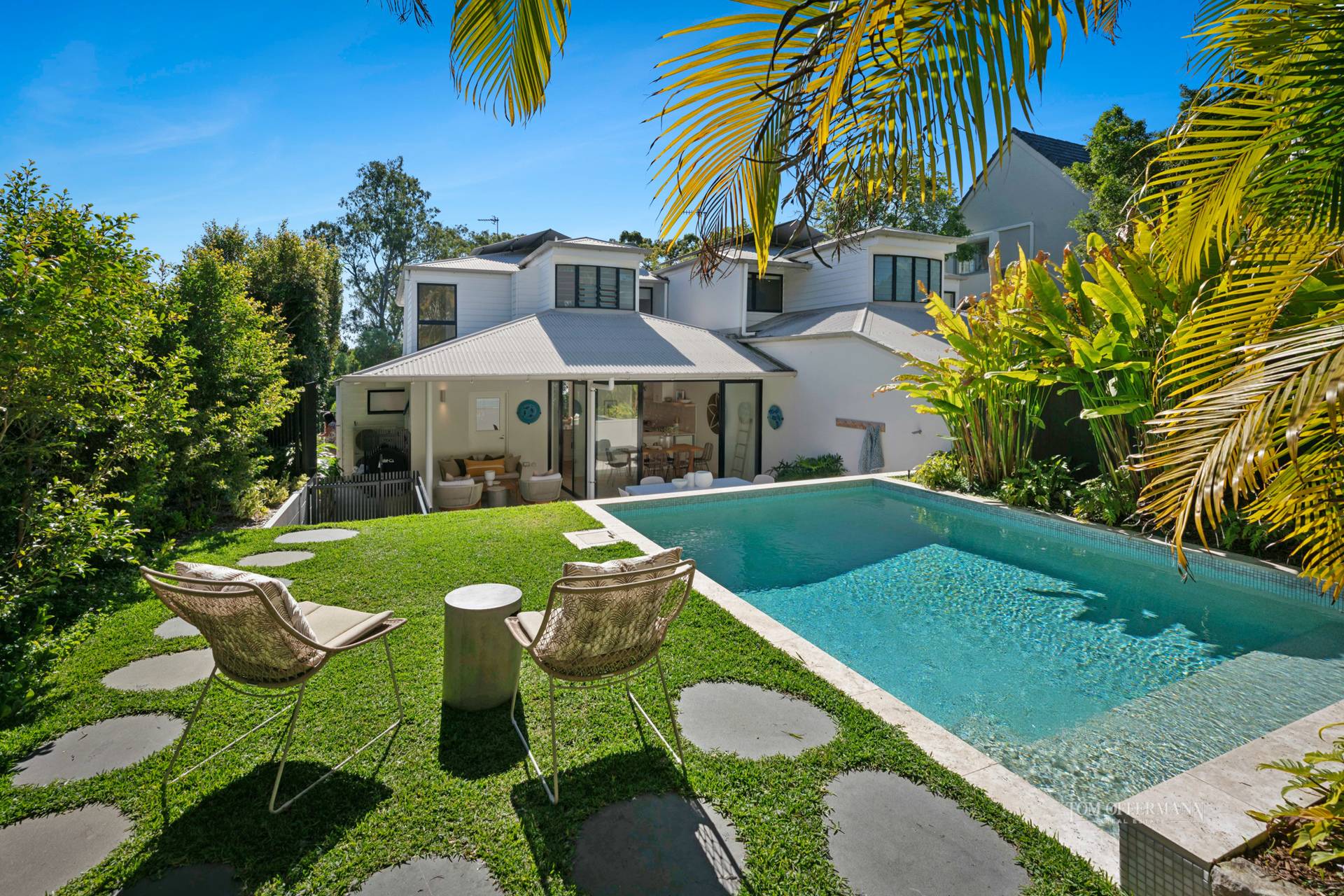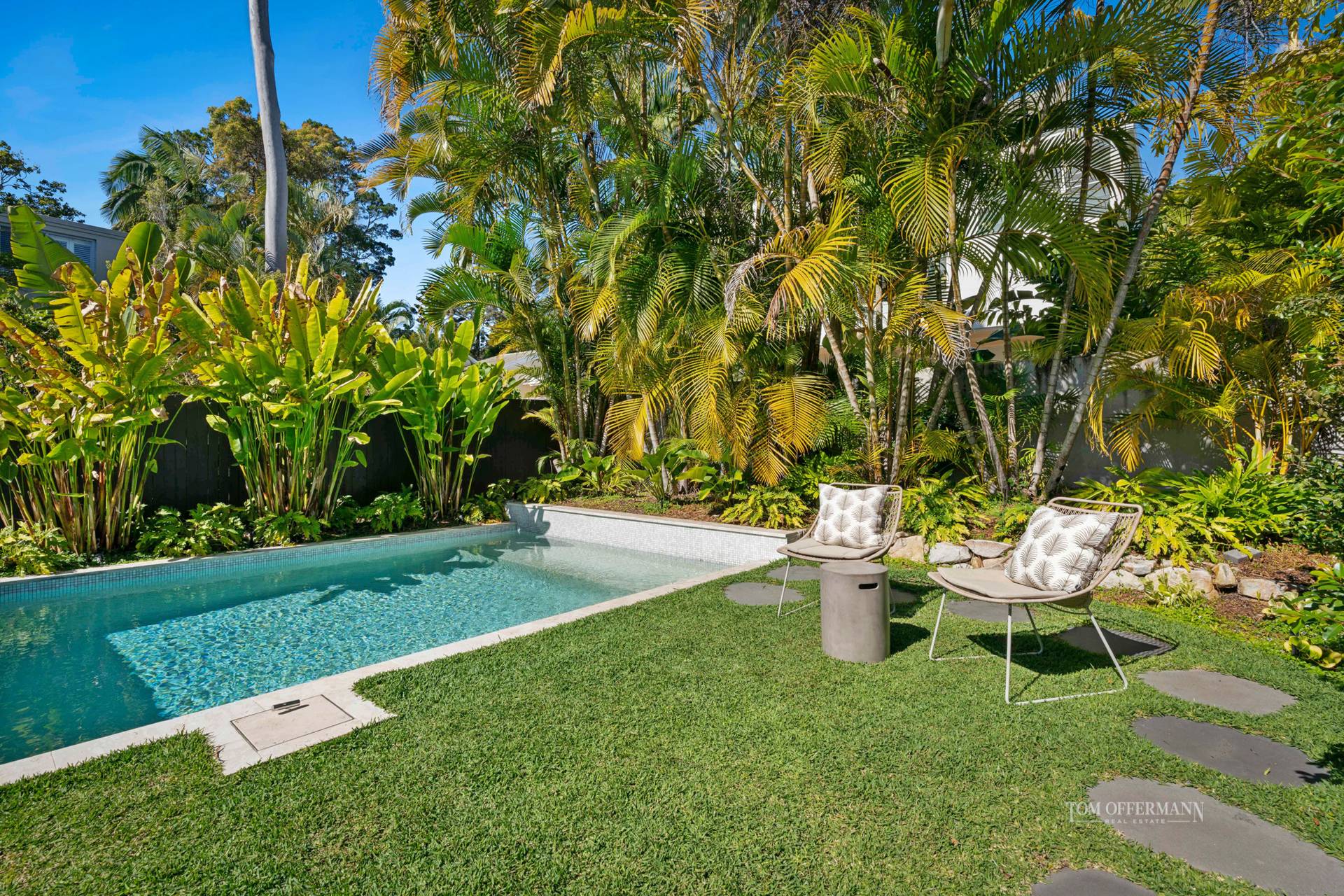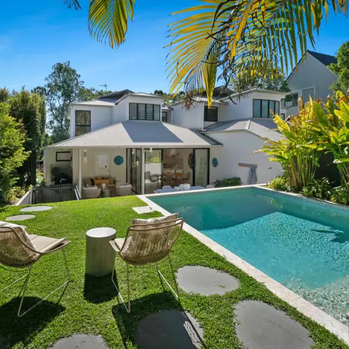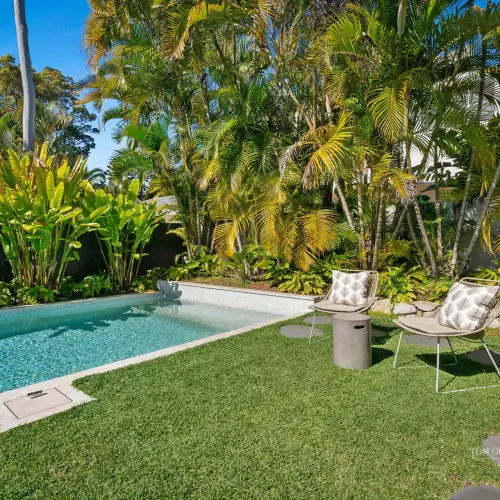 Entertaining is effortless, with two distinct alfresco zones. To the front, the covered terrace is an ideal setting to watch the sunset across the bay. To the rear, the indoor - outdoor living area dissolves into an alfresco dining terrace and leisure zone, with a stunning mosaic-tiled pool and a lush lawn framed by heliconias and golden cane palms. It's a private tropical haven, just moments from the ocean.