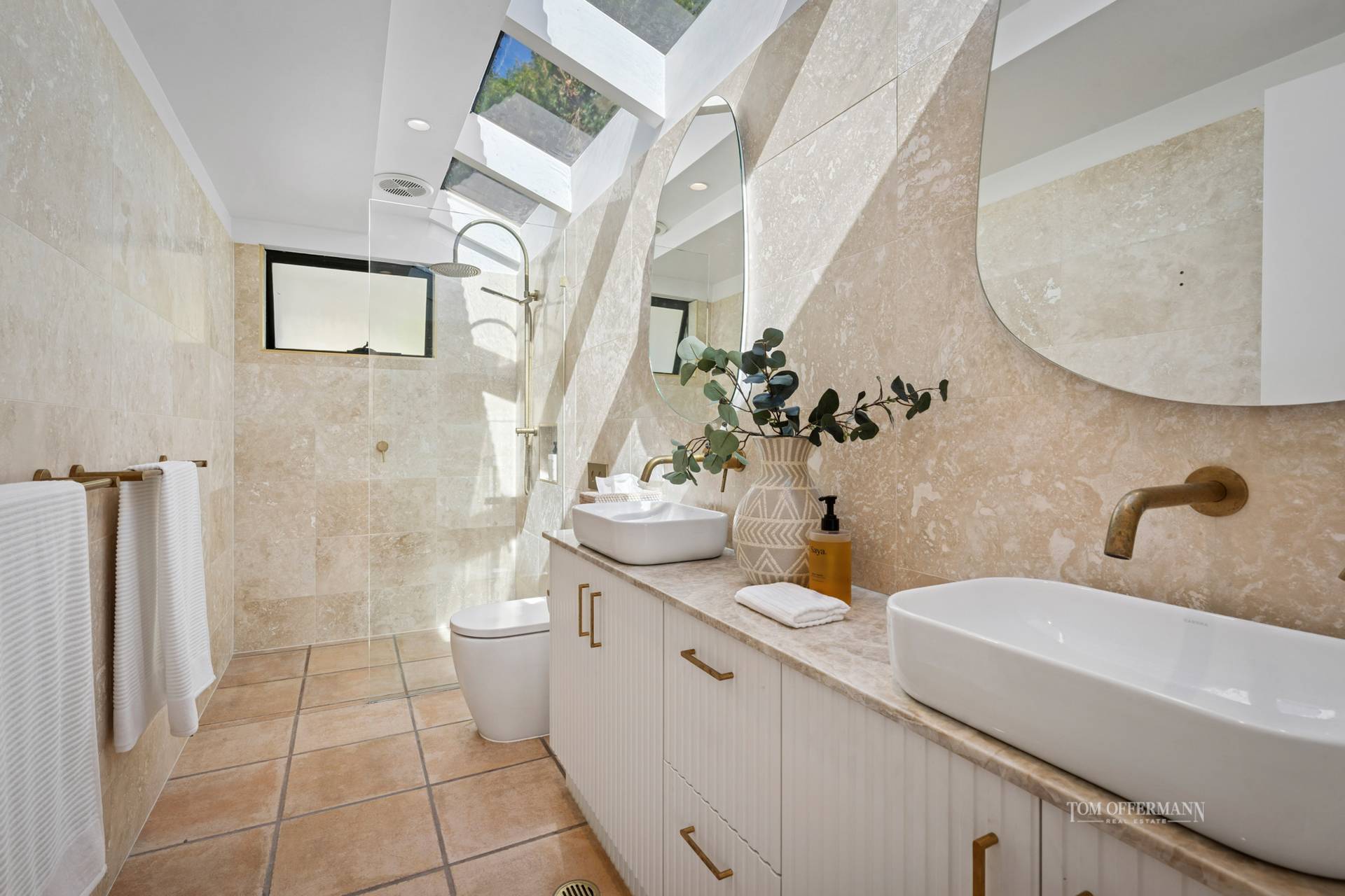 The master suite is a private sanctuary, perfectly positioned to capture the northern light. Curved walls and soaring ceilings evoke a sense of calm and space, while the ensuite - finished in travertine and crowned with a skylit glass roof - whispers quiet luxury at every turn.
