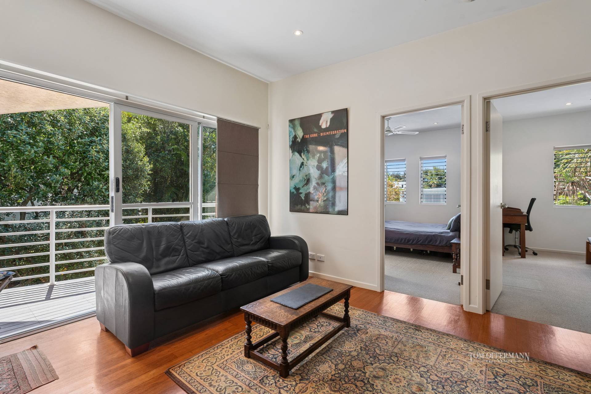 Note the high ceilings, banks of plantation shutters and multiple disappearing doors are reminiscent of a classic holiday beach house, and natural light invites itself indoors to shadow dance over endless beautiful spotted gum flooring.