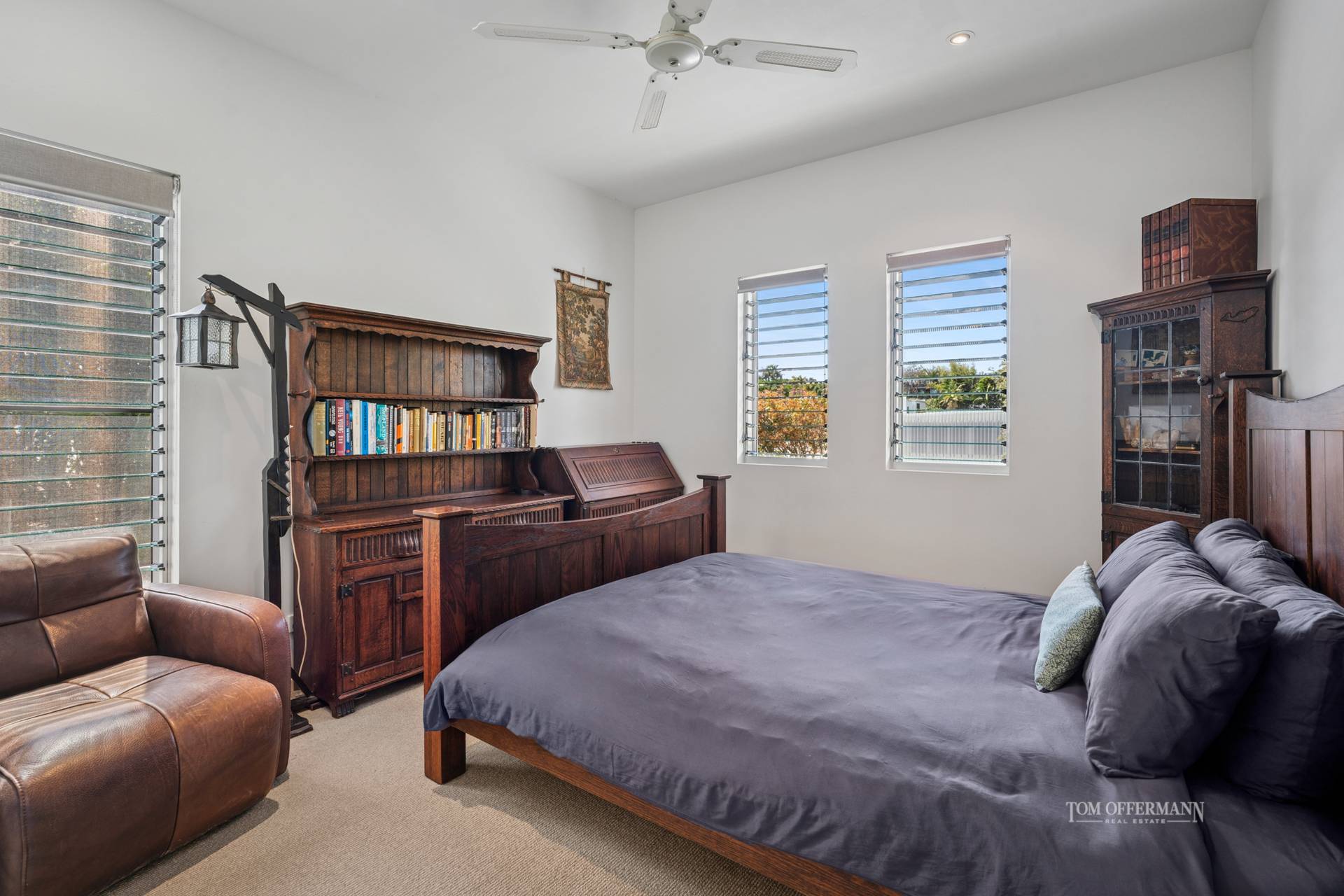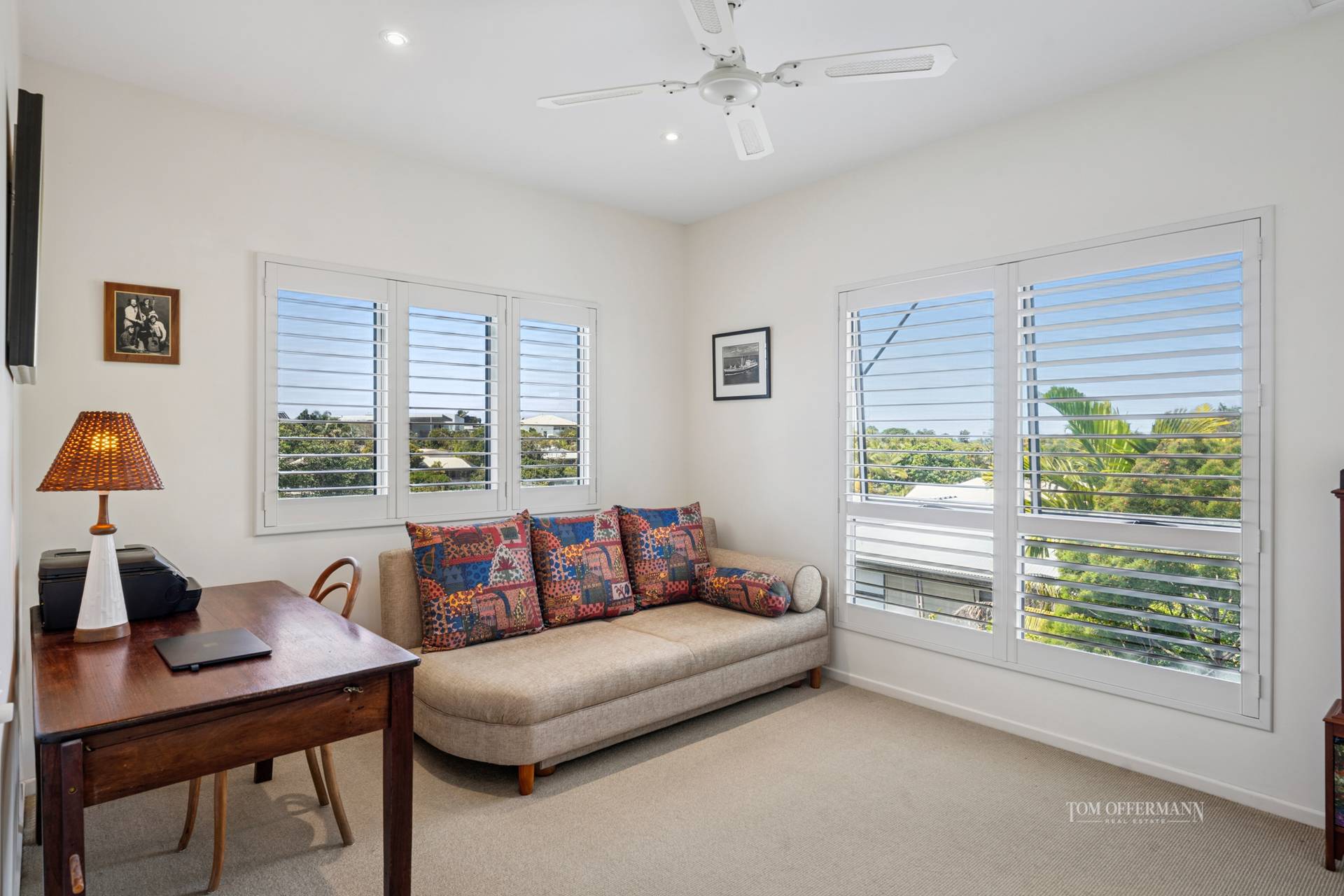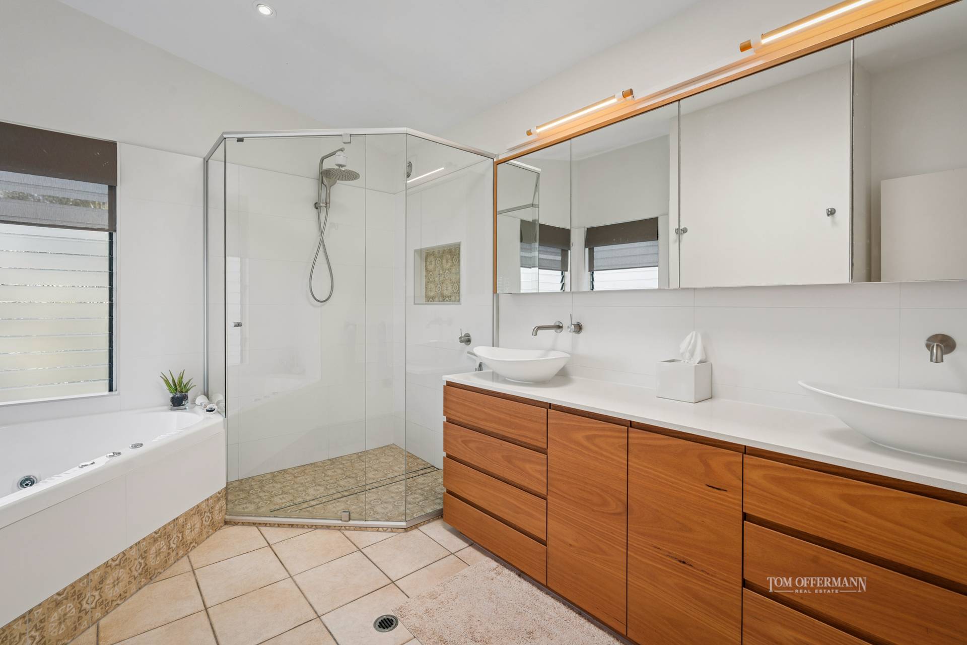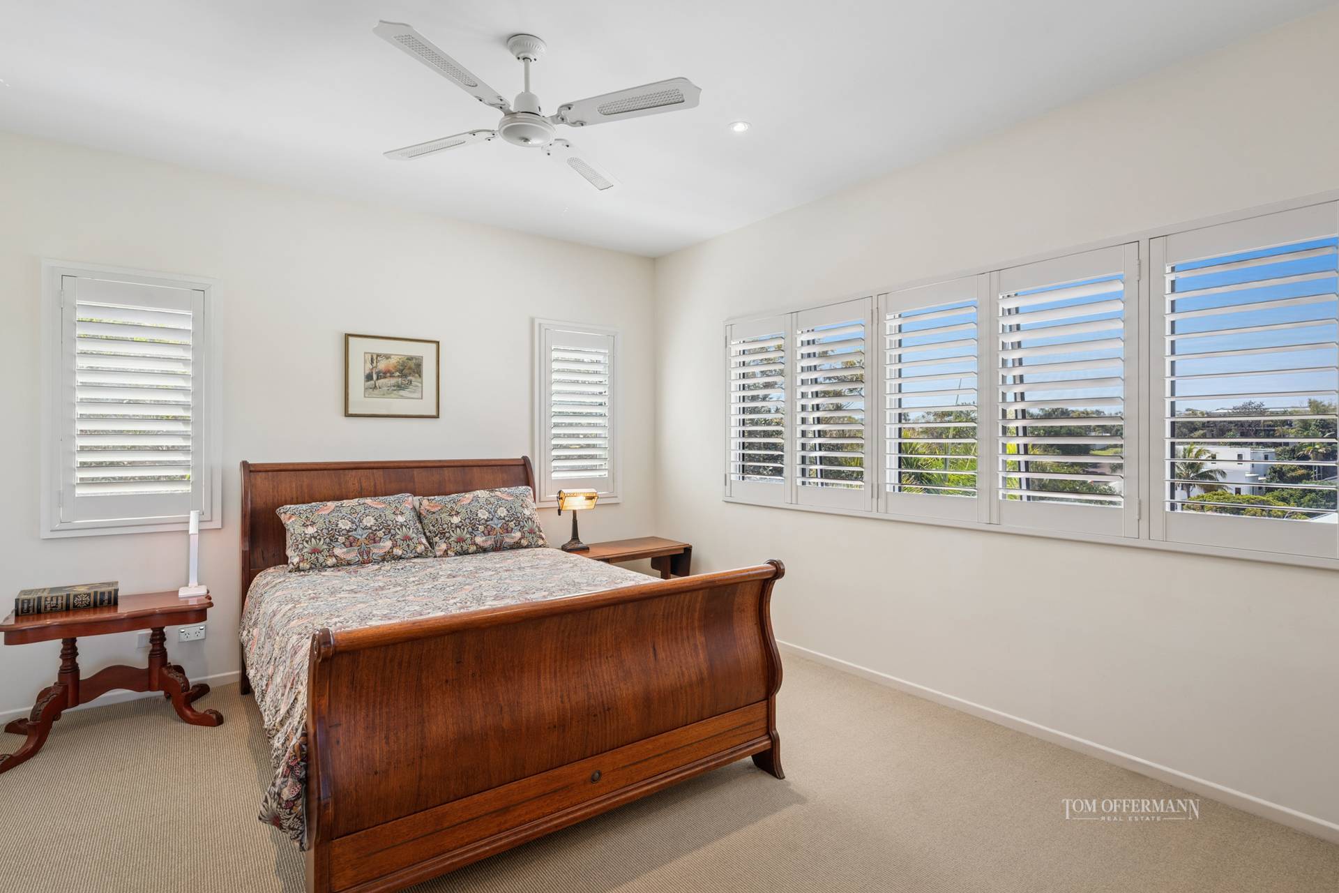 There are four carpeted bedrooms. On the second level is the premier suite with walk-in robe; adjacent is a bedroom with built-in cabinetry. The bathrooms have been totally refreshed with white stone two-basin topped Tasmanian Blackwood cabinetry, shower and bath. On the first level the two bedrooms have built-in robes, and a central living/leisure space with an undercover terrace is on the westside. The bathroom has single basin cabinetry, shower, separate toilet and a linen storeroom.