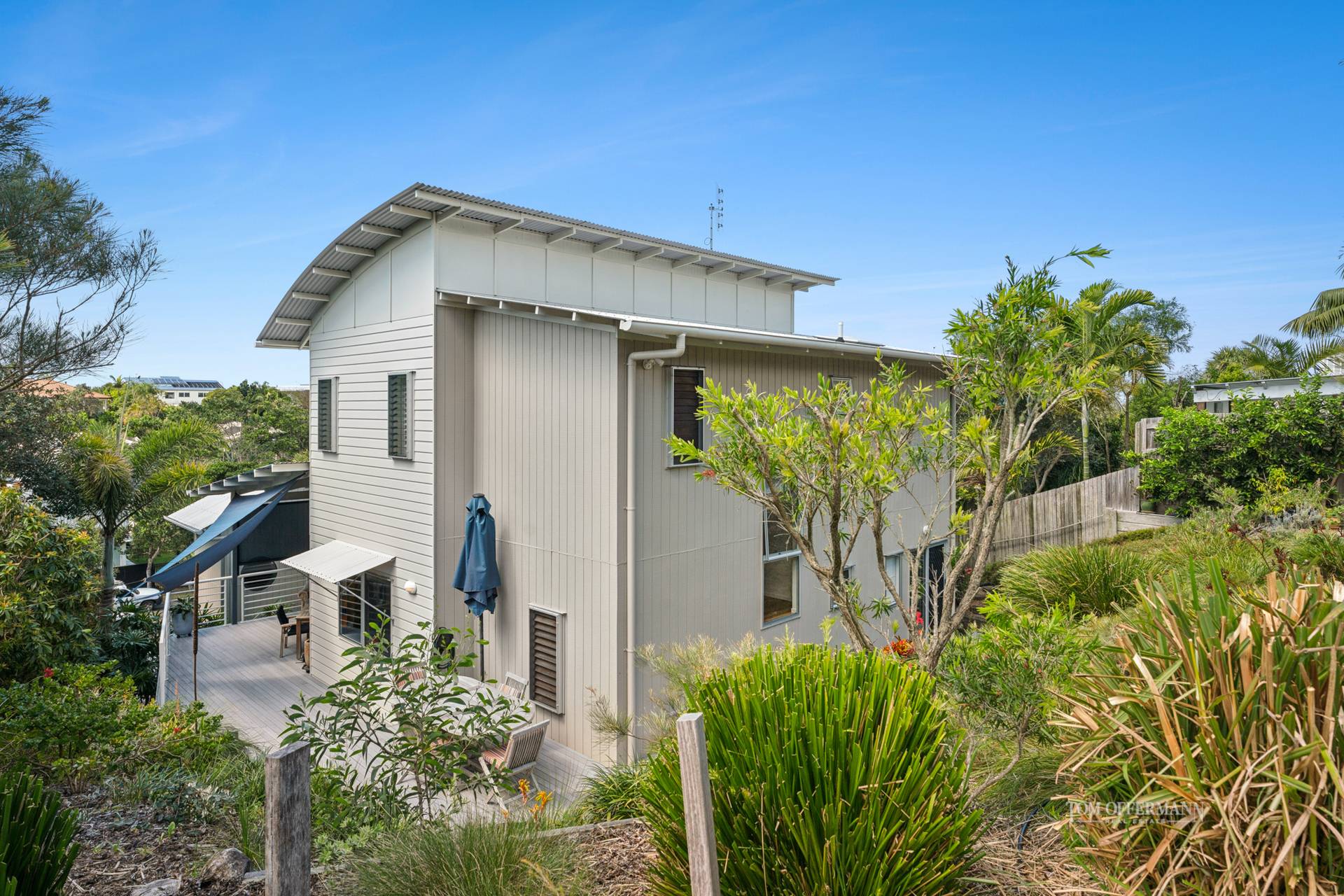 When it comes to wonderful surprises, it is not all about surf breaks at dog-friendly Castaways Beach and being a mere four-minute walk to toes-in-the-white squeaky sand. It's also about appreciating a distinctive beach house design and custom build seemingly poised within a sand dune with curved roof, weatherboard exterior and over generous everything, including numerous terraces to capture those salty breezes and sizzling sunsets.