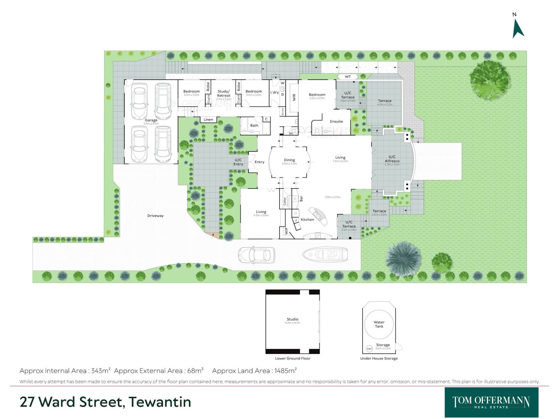 • Terraces: 4.3mx7m curved main u/c off living w BBQ niche; 2mx3.3mm u/c off main b/room & ensuite + abutting 4mx5.2m lower
