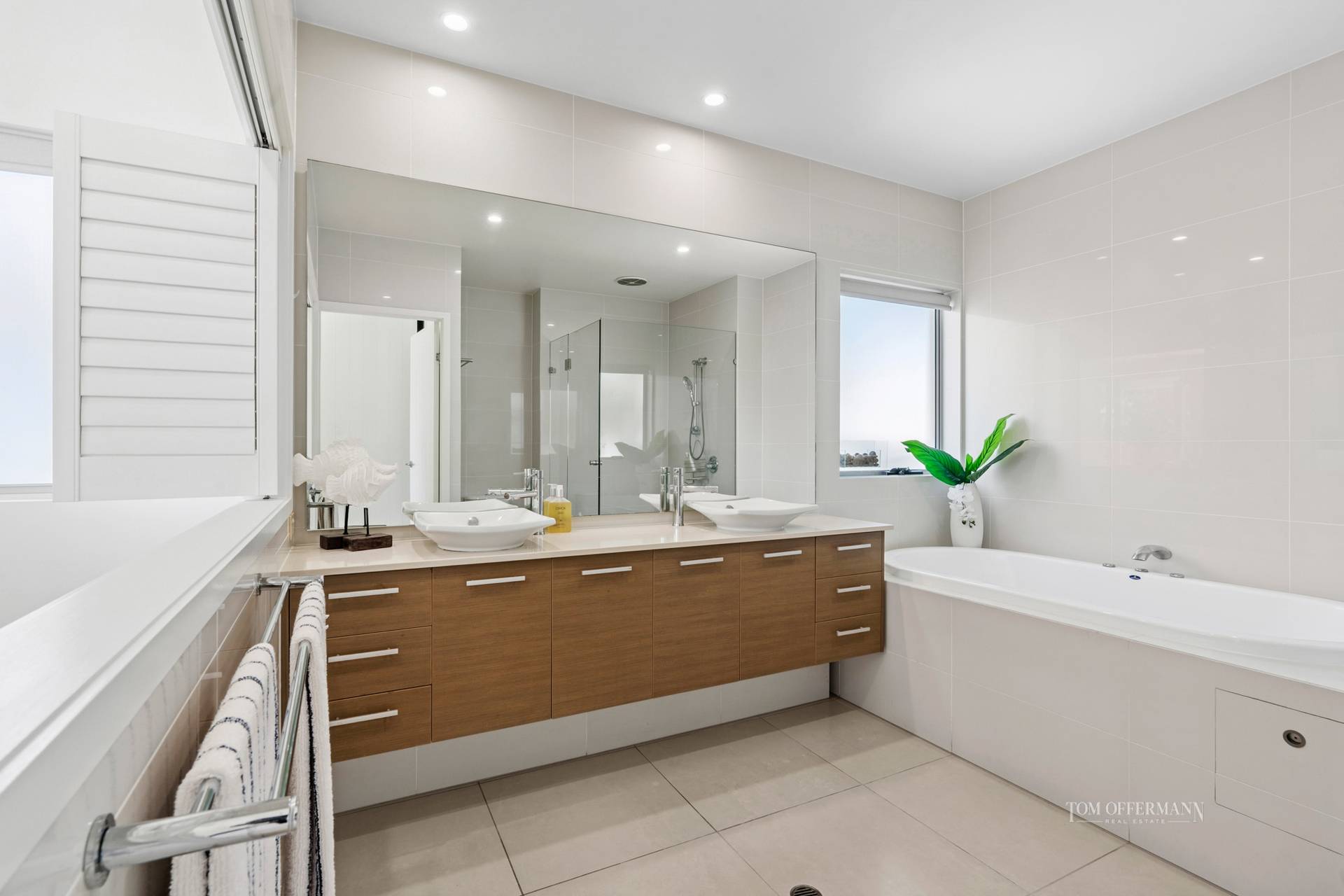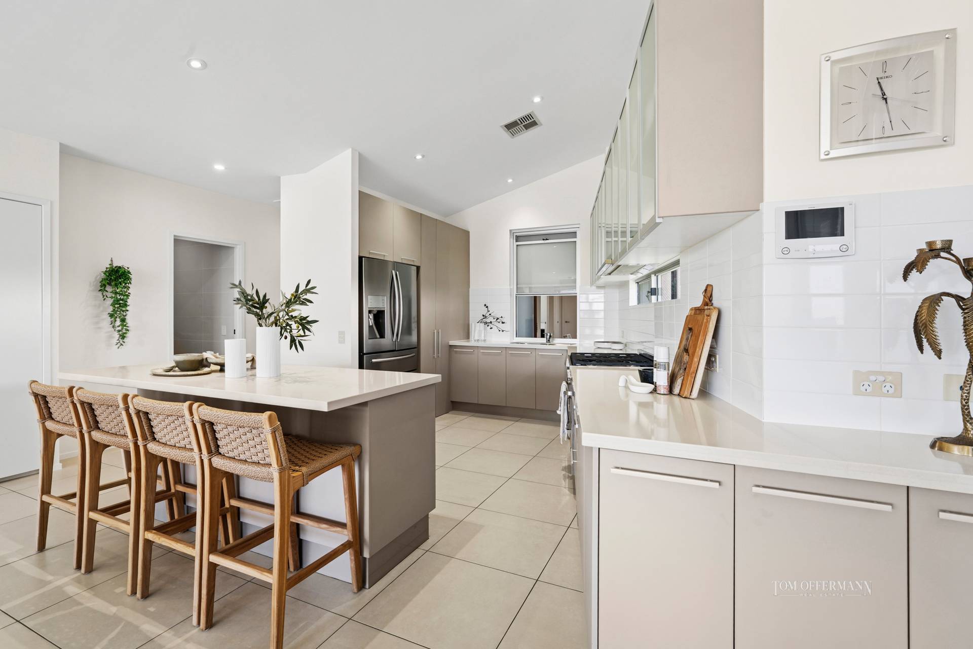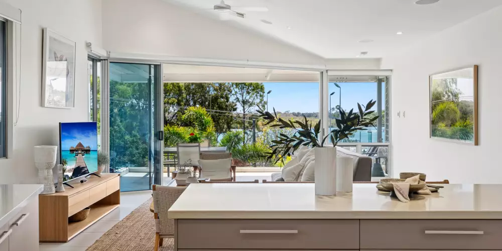 Admire the clever design cues, contemporary detailing and lofty ceilings, and how right natural light invites itself in via banks of disappearing doors, before spilling in a dappled kind of way, over creamy tiles in the expansive living and dining spaces.