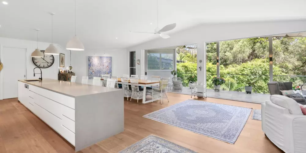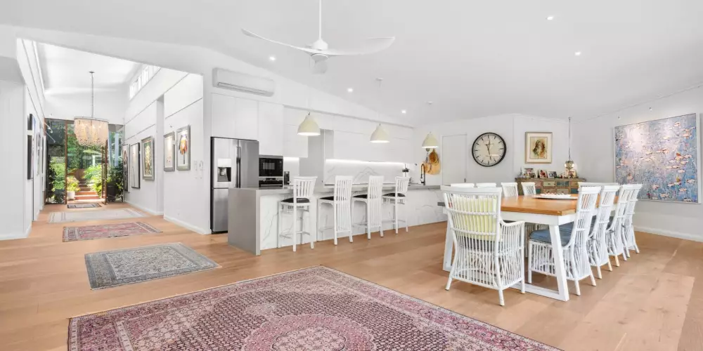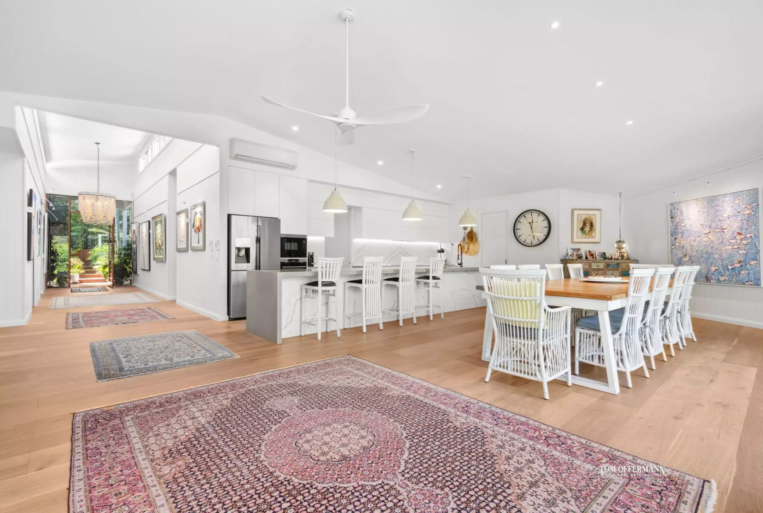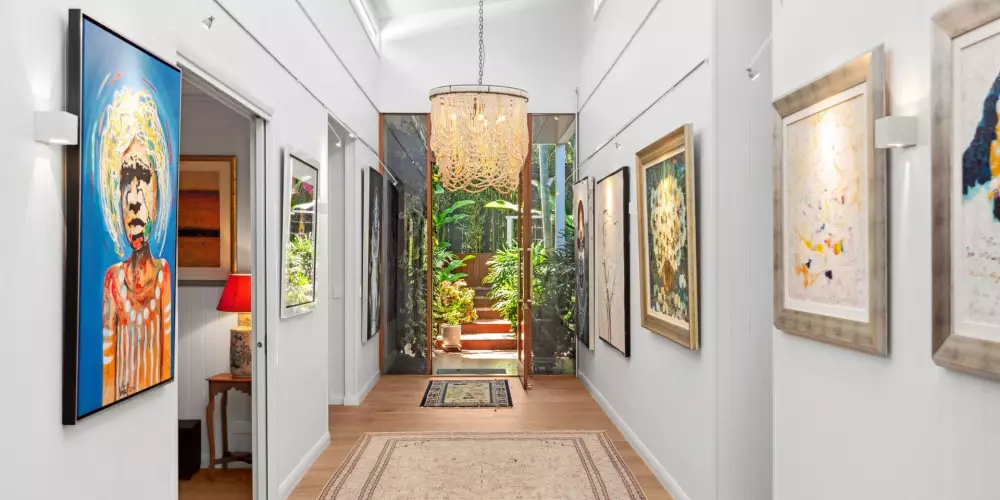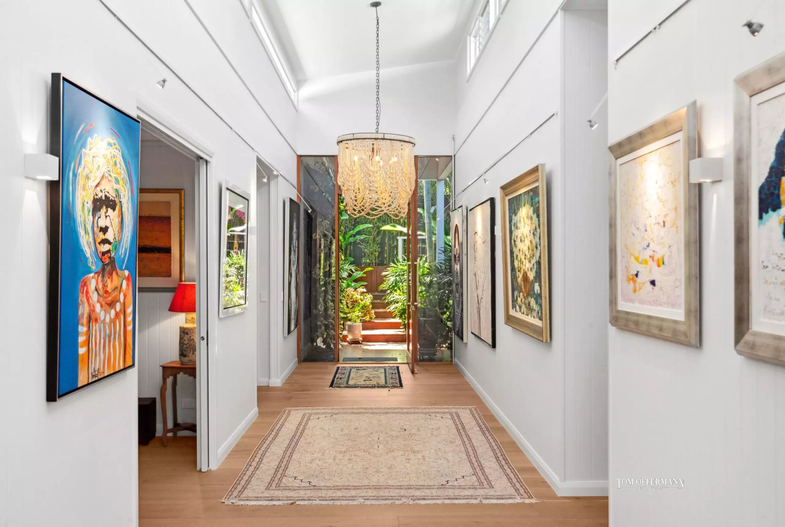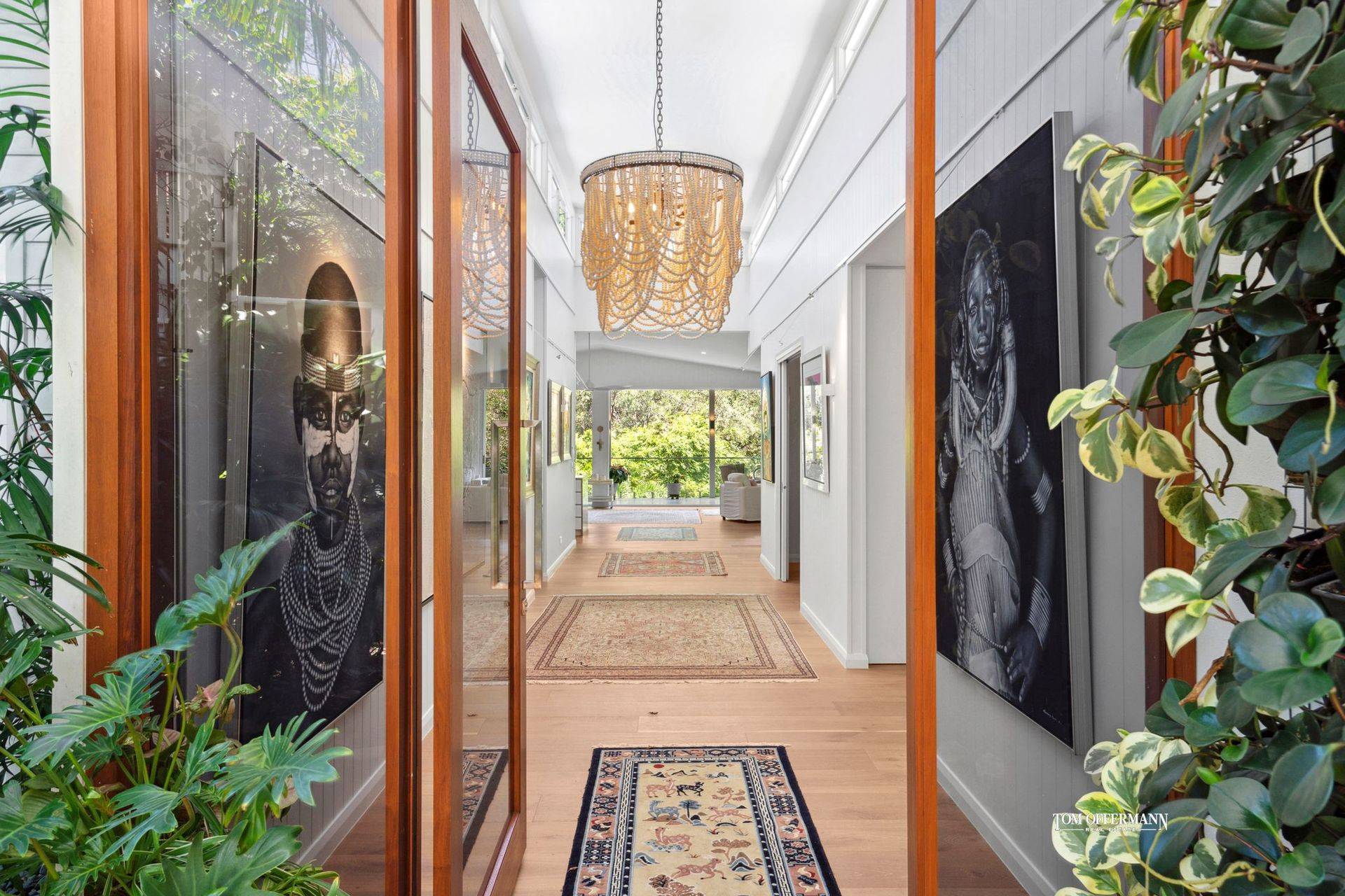 Admire the clerestory-height ceilings, white VJ walls, plantations shutters and grey stone wall with niches adding whispers of Palm Springs, and how naturally attracting sunlight, bounces across endless American oak flooring.