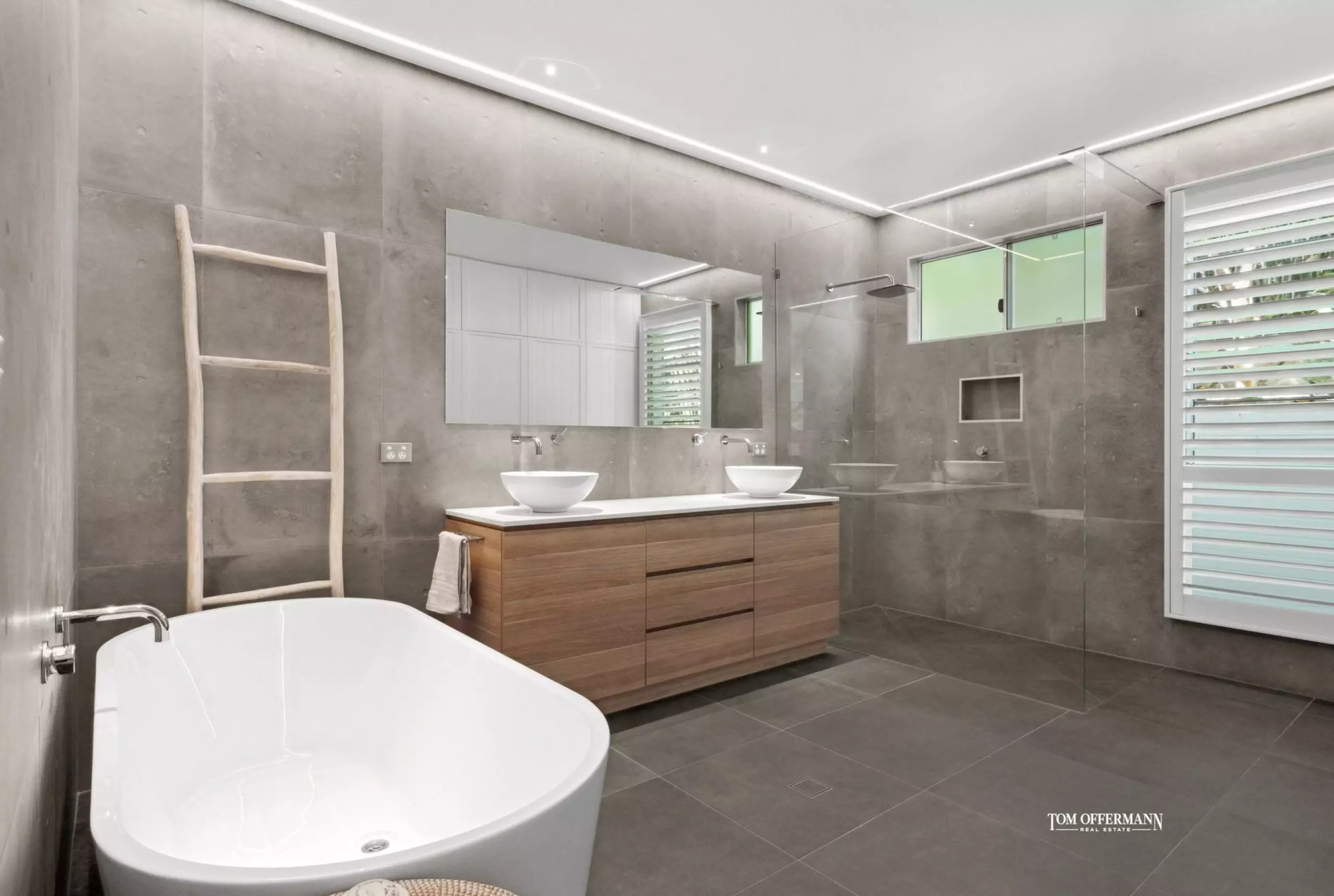 • About: Lester Friend build completed for current owner 2019; lift - garage to upper-level; timber paneled glass front door; gallery-style entrance hall; lighting specific to artworks; beaded chandelier by Sth African designer; American oak wide plank flooring; vaulted ceilings, plantation shutters & VJ walls throughout; cool white aesthetic featuring grey & natural stone & neutral palette + VJ walls; fans/aircon; 4 carpeted bedrooms – upper level premier king suite retreat w walk-in robe, ensuite w grey stone tiled walls, stone-topped timber cabinetry + bathtub; king bedroom w BIR & ensuite + powder rooms; mid-level - 2 bedrooms, access to terrace; bathroom; laundry w drying court access; living/dining – feature wall of stone w specialty lit niches; disappearing doors to undercover terrace w nature reserve backdrop; leisure/media room w custom cabinetry; mid-level open plan living & dining w kitchenette opens to pool & terrace