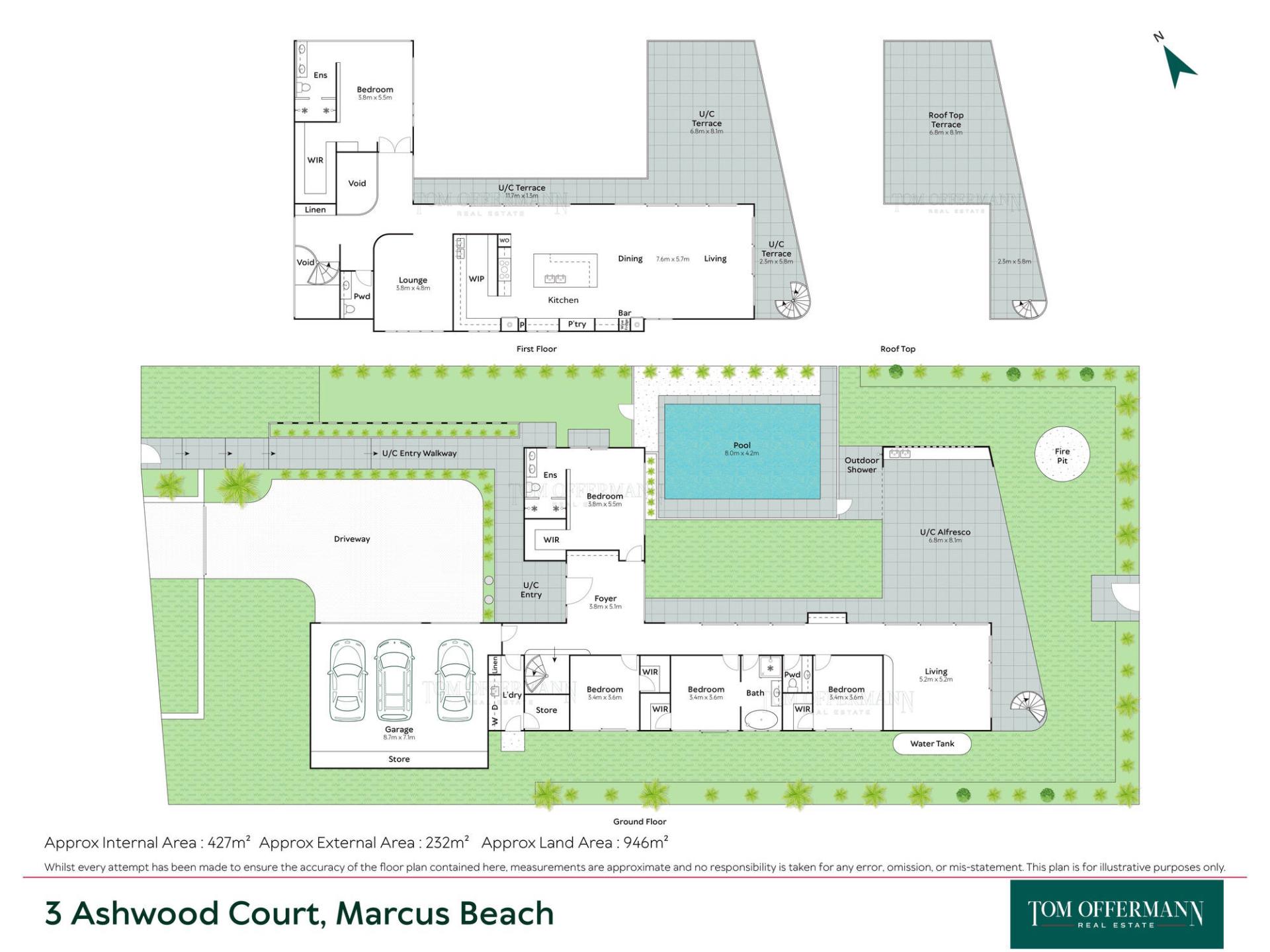 On the ground floor are four bedrooms. The premier suite which looks out to pool has a walk-in robe and ensuite with single bowl counter styled as per the main ensuite. Similarly, a bathroom with bathtub also a powder room shared by three king bedrooms each with a walk-in robe.