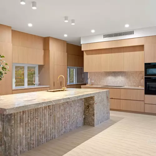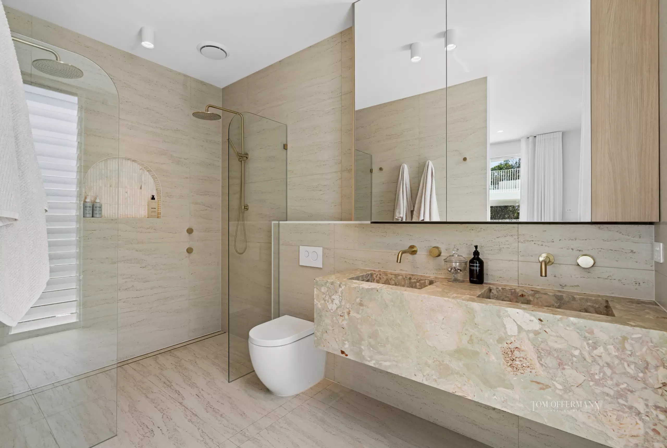 There are five bedrooms. Continuing the unprecedented level of sophistication is the premier suite retreat with wispy sheers and a pool outlook. The walk-in robe elicits instant fashionista envy, and the ensuite has a wall-hung custom-curved Italian marble double bowl counter with statement mirrors.