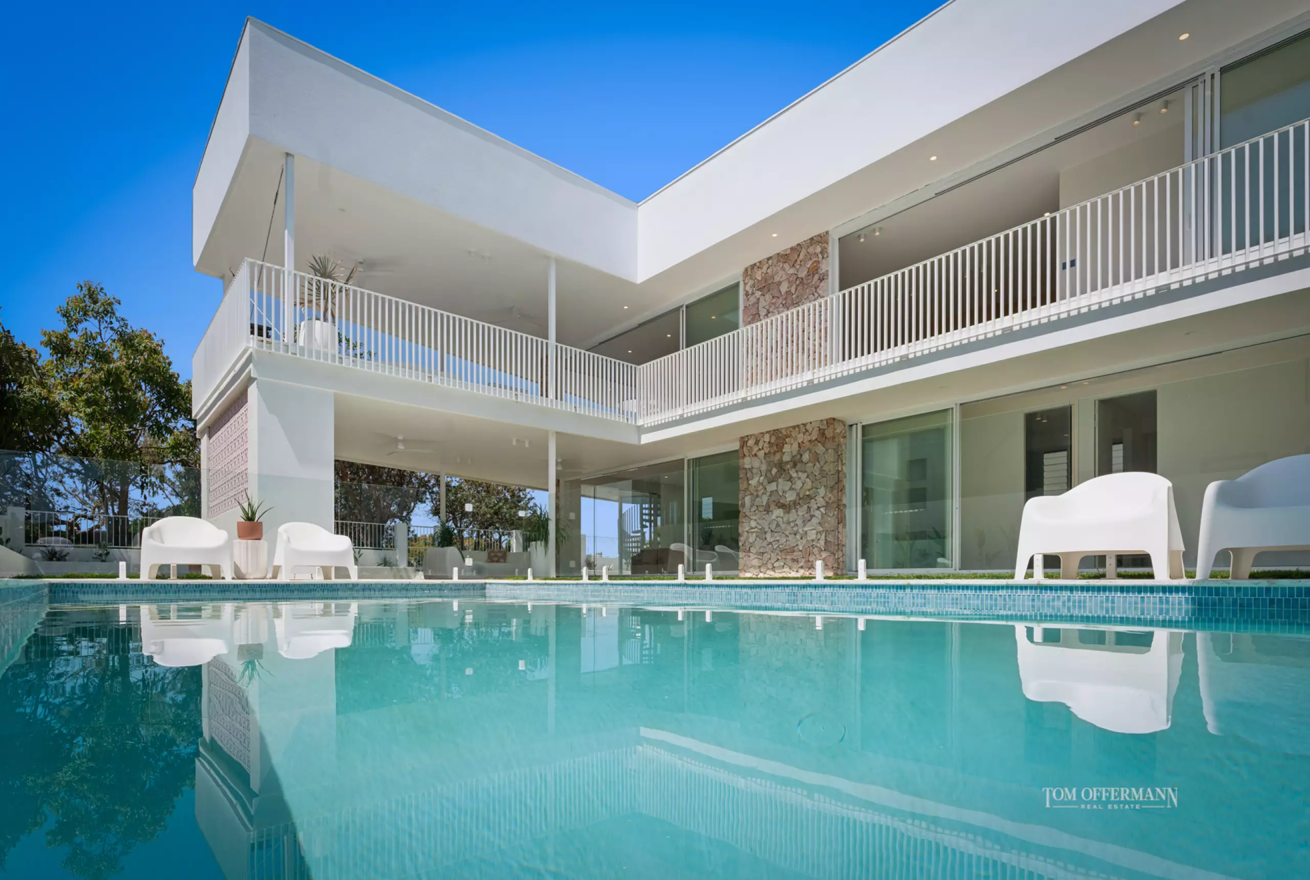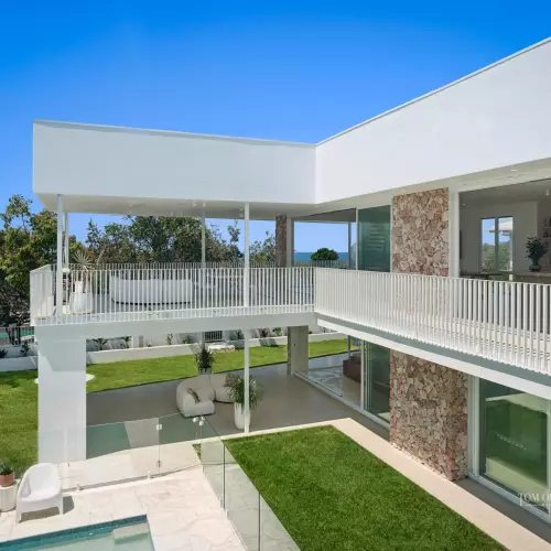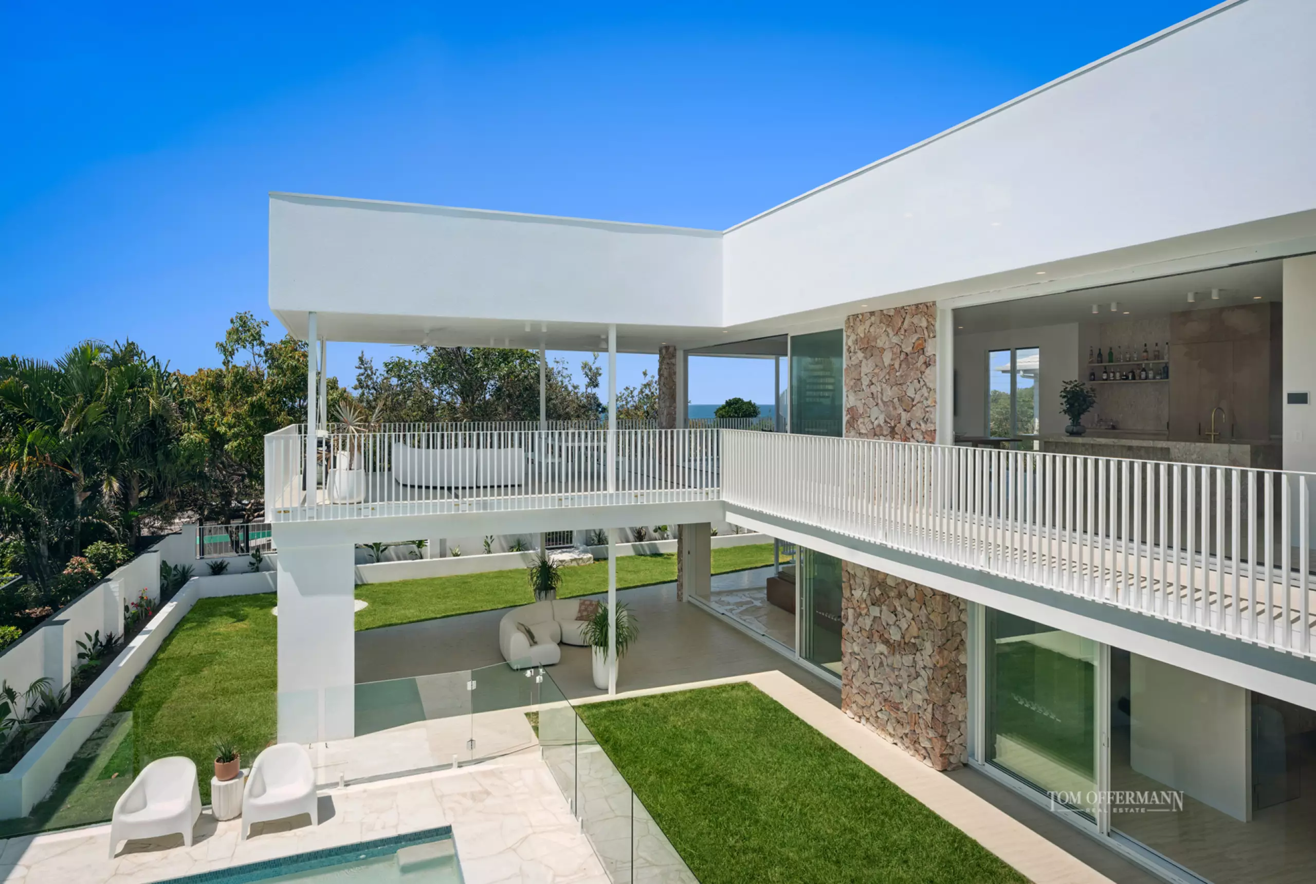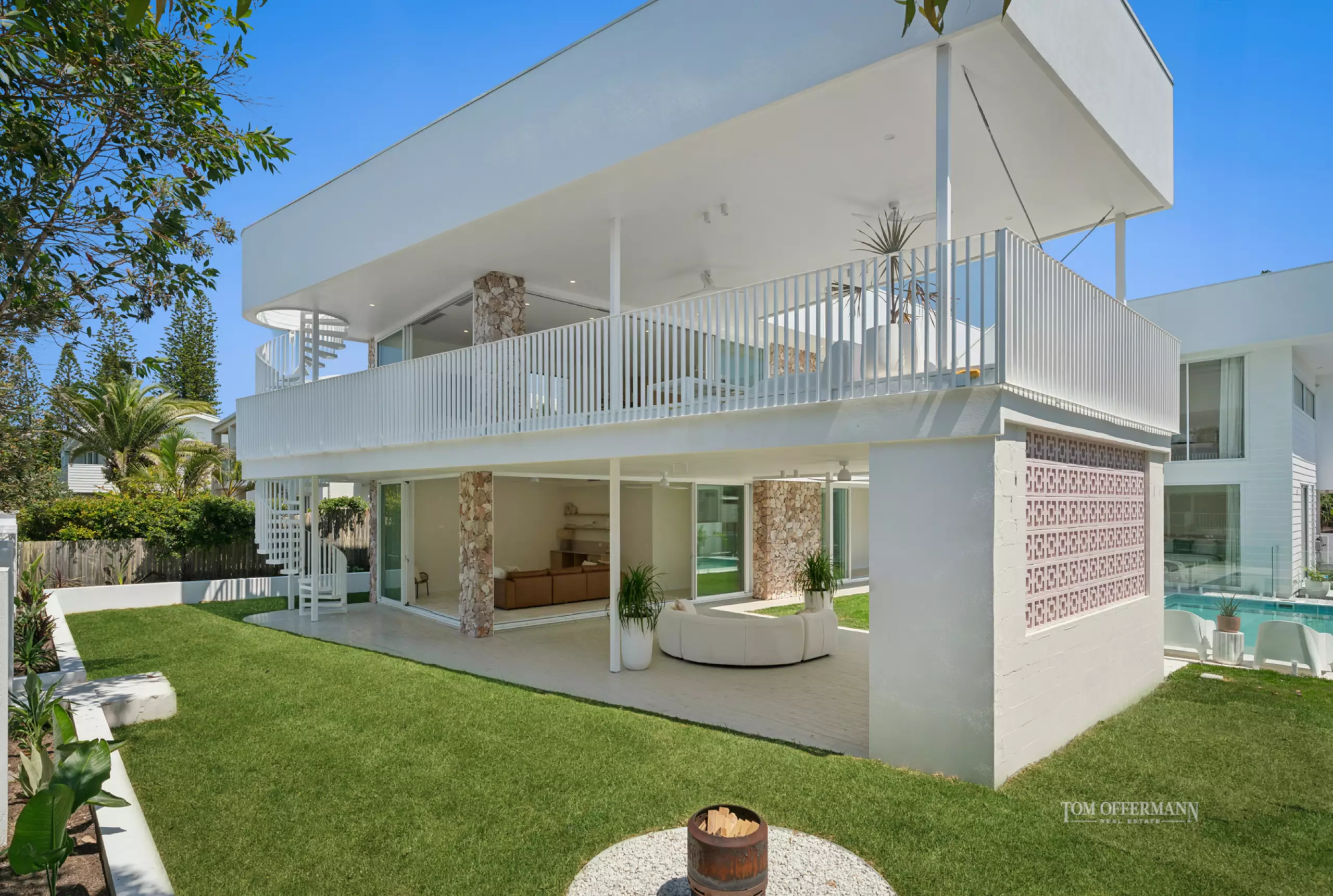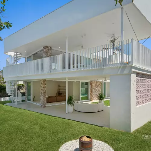 Behold classic Palm Springs-inspired white-bright magnificence on a larger-than-most site with signature breeze blocks, and stars aligning into five with 180° Coral Sea views, salty breezes and from the back gate to squeaky white sand, it's a mere three minutes.