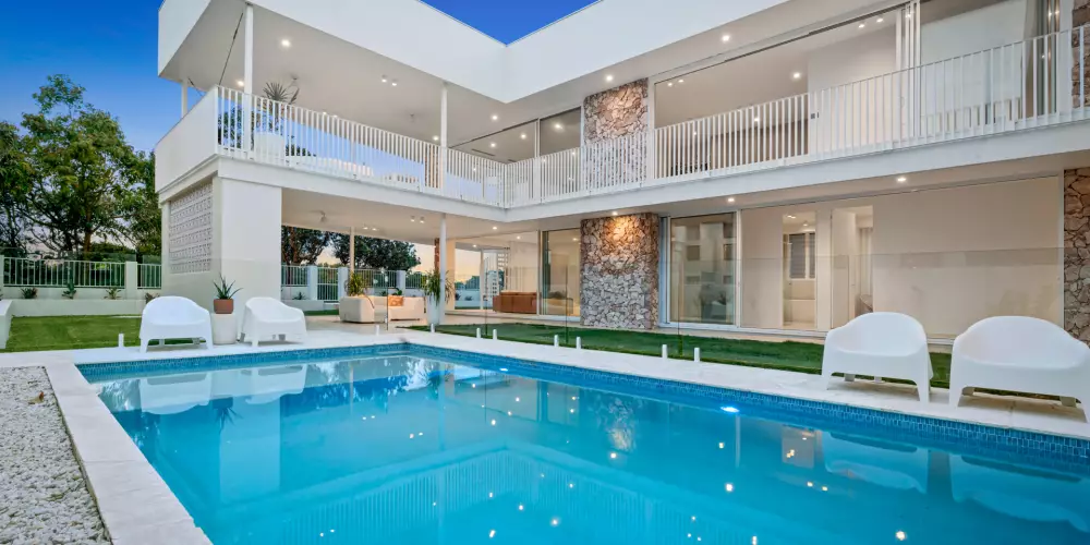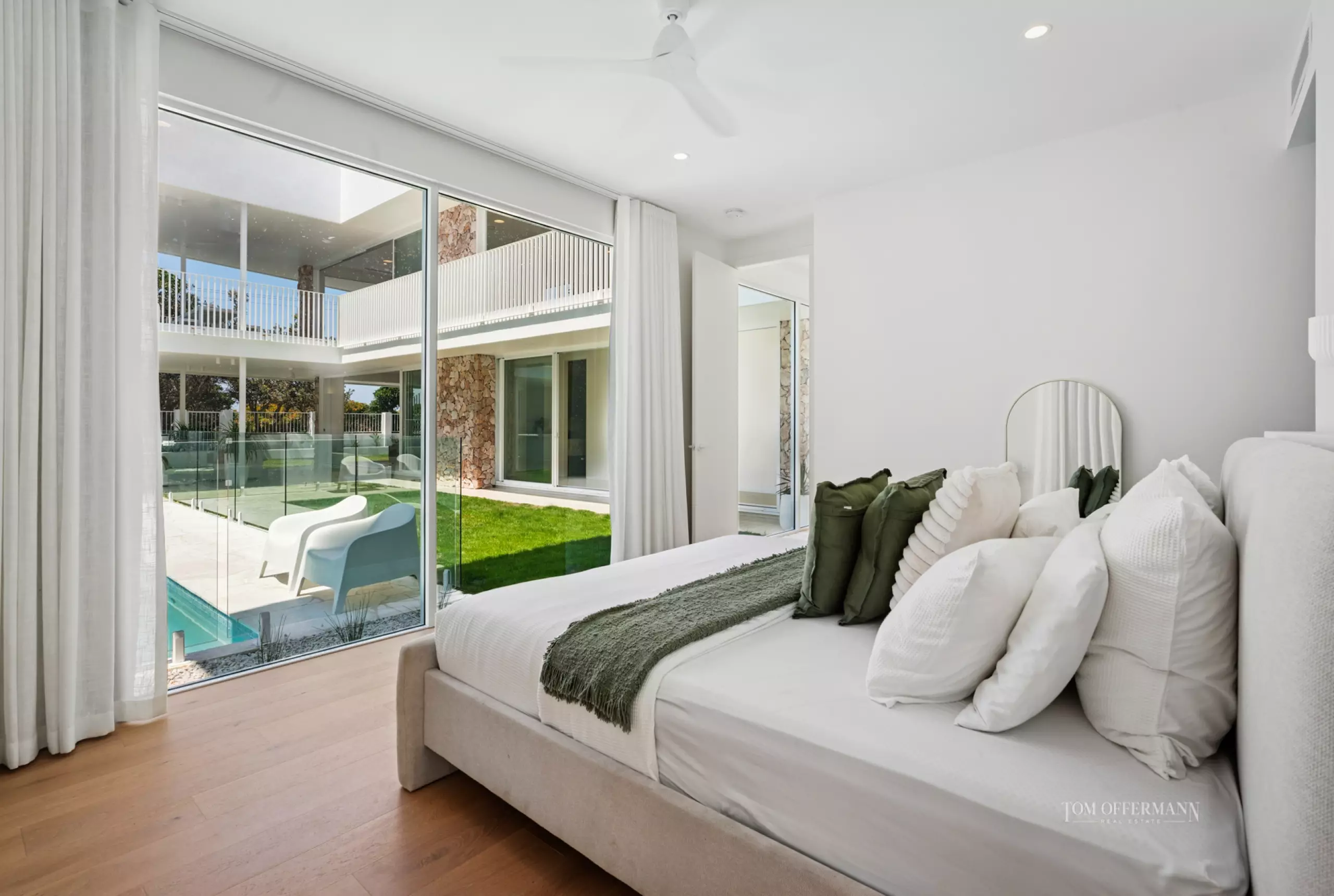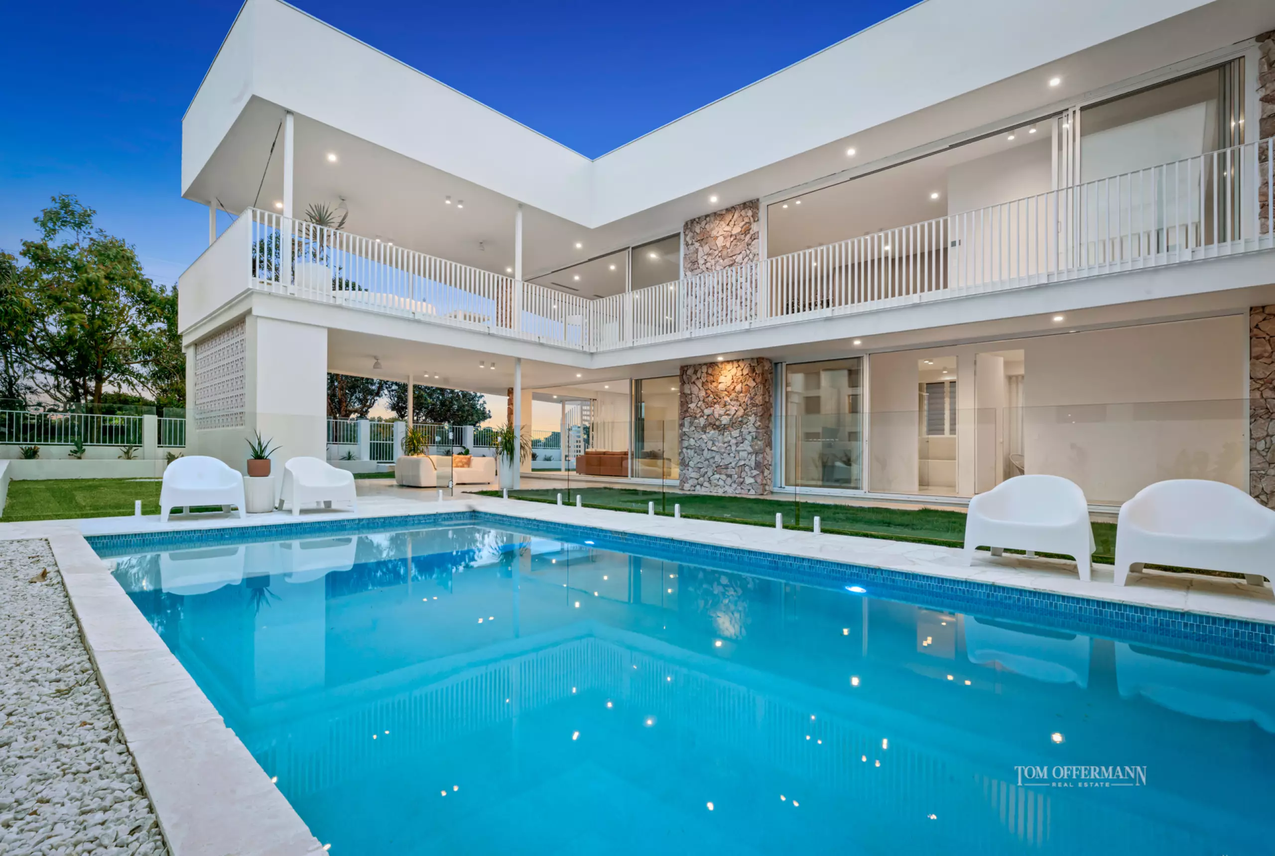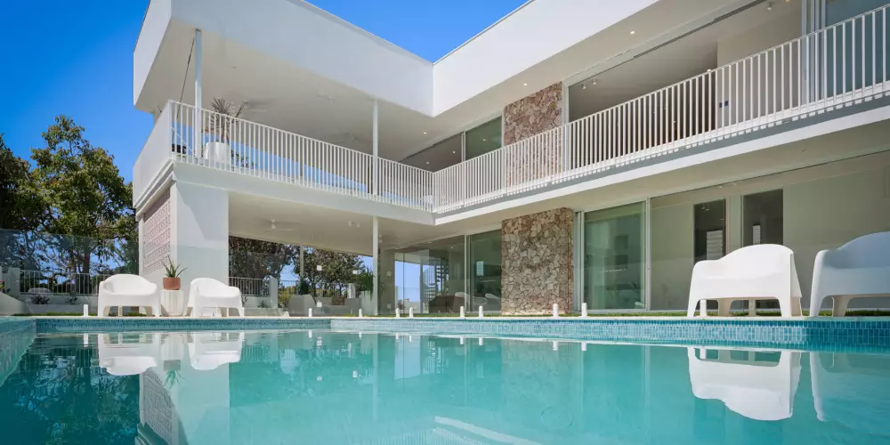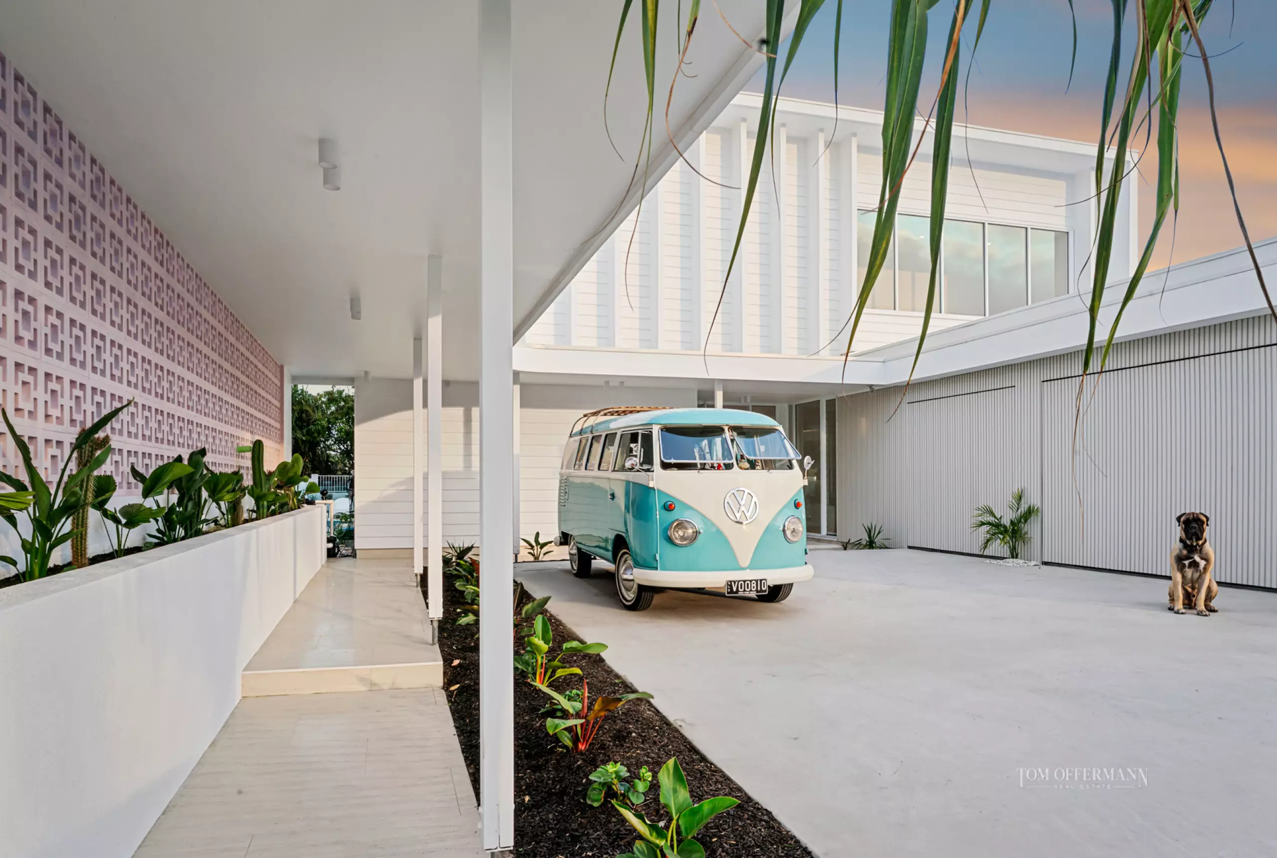 Behold classic Palm Springs-inspired white-bright magnificence on a larger-than-most site with signature breeze blocks, and stars aligning into five with 180° Coral Sea views, salty breezes and from the back gate to squeaky white sand, it's a mere three minutes.