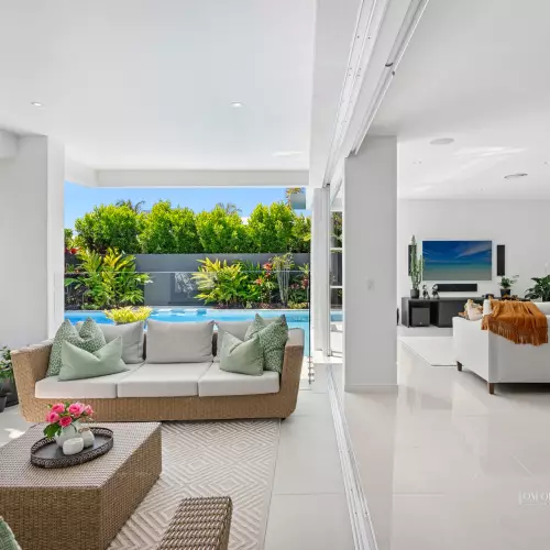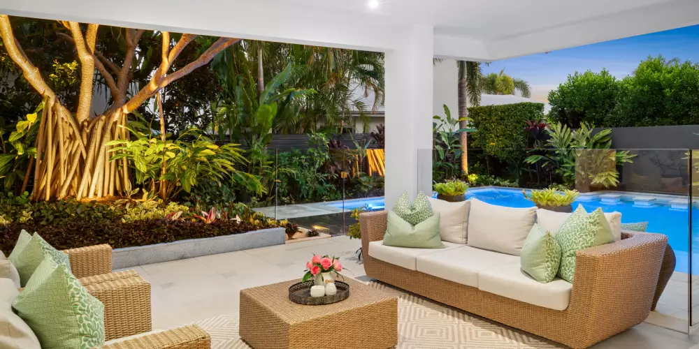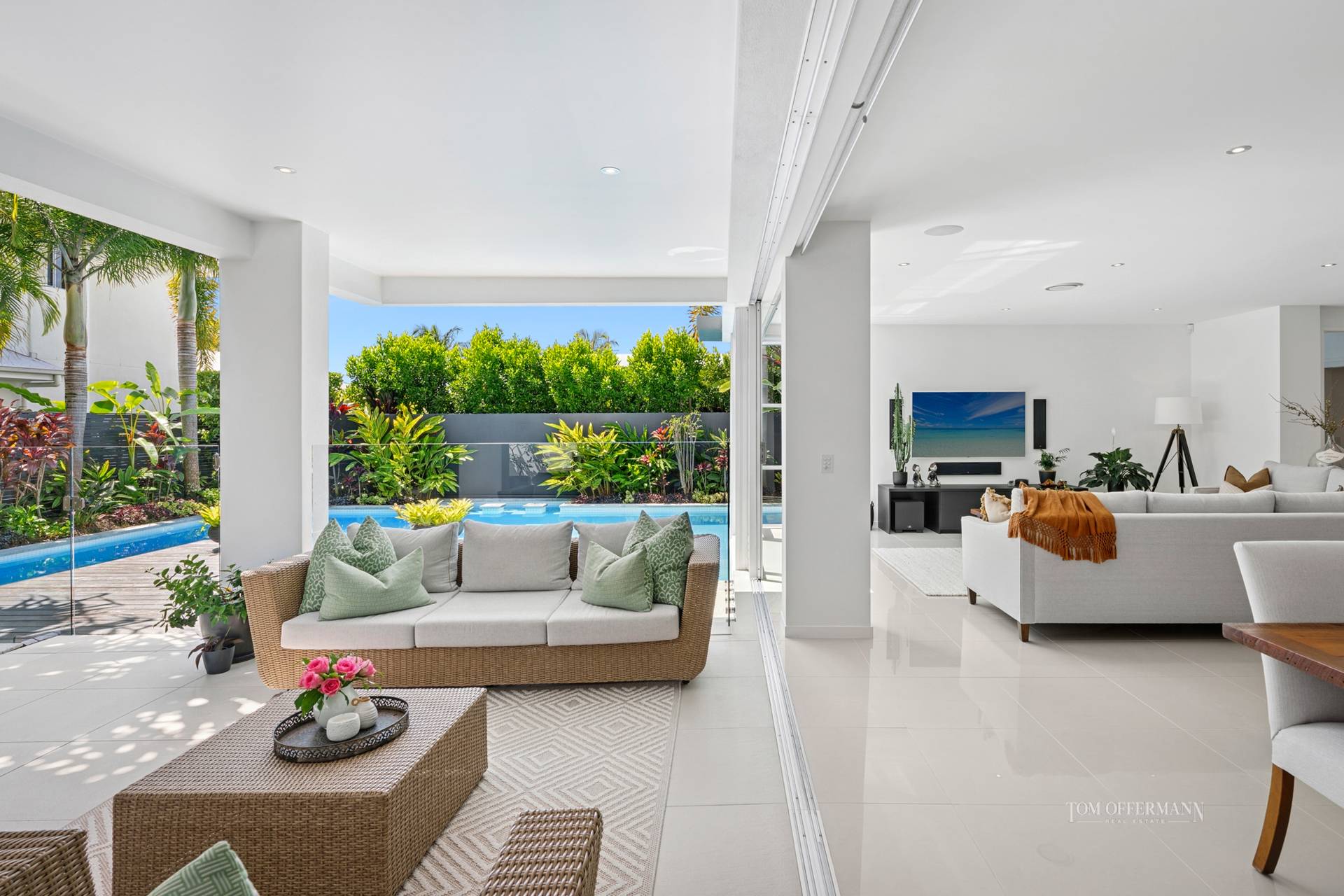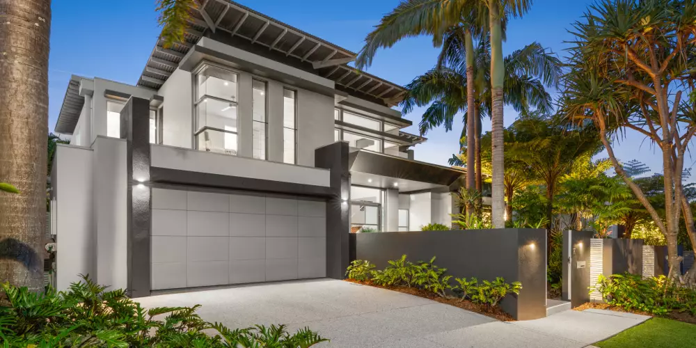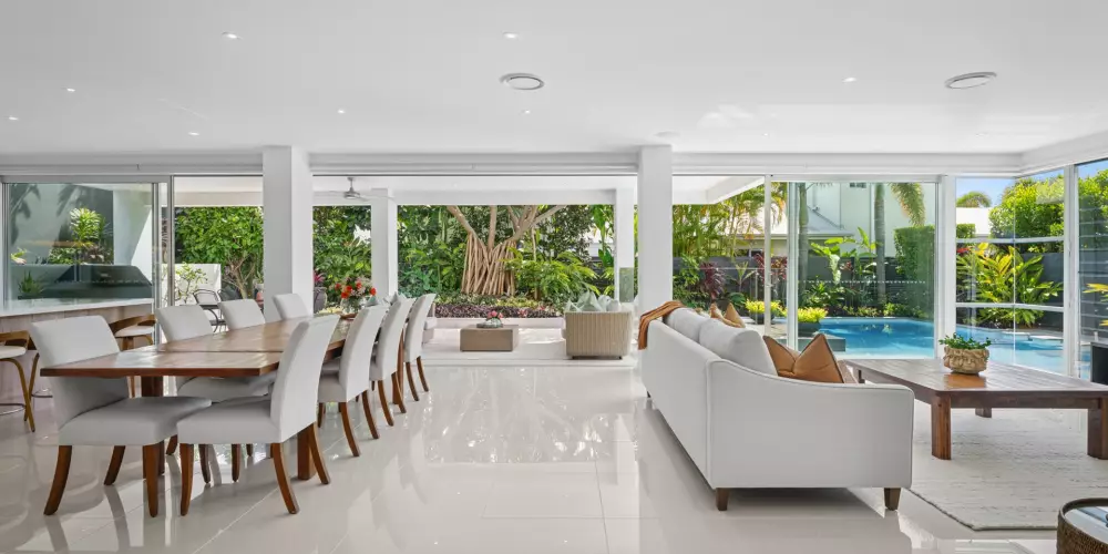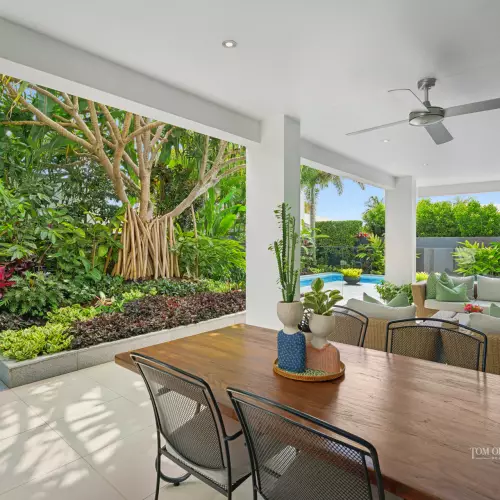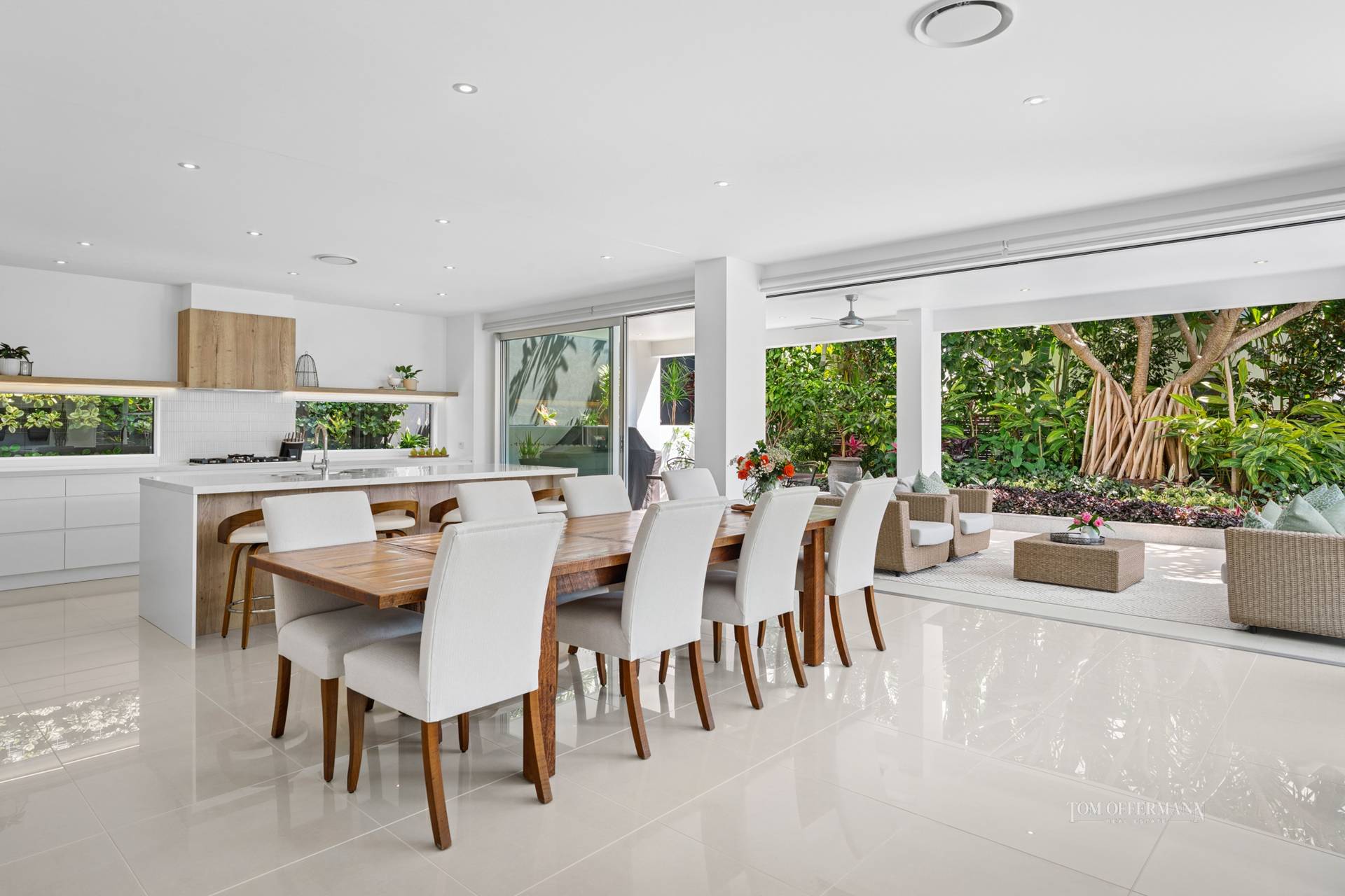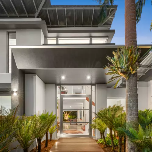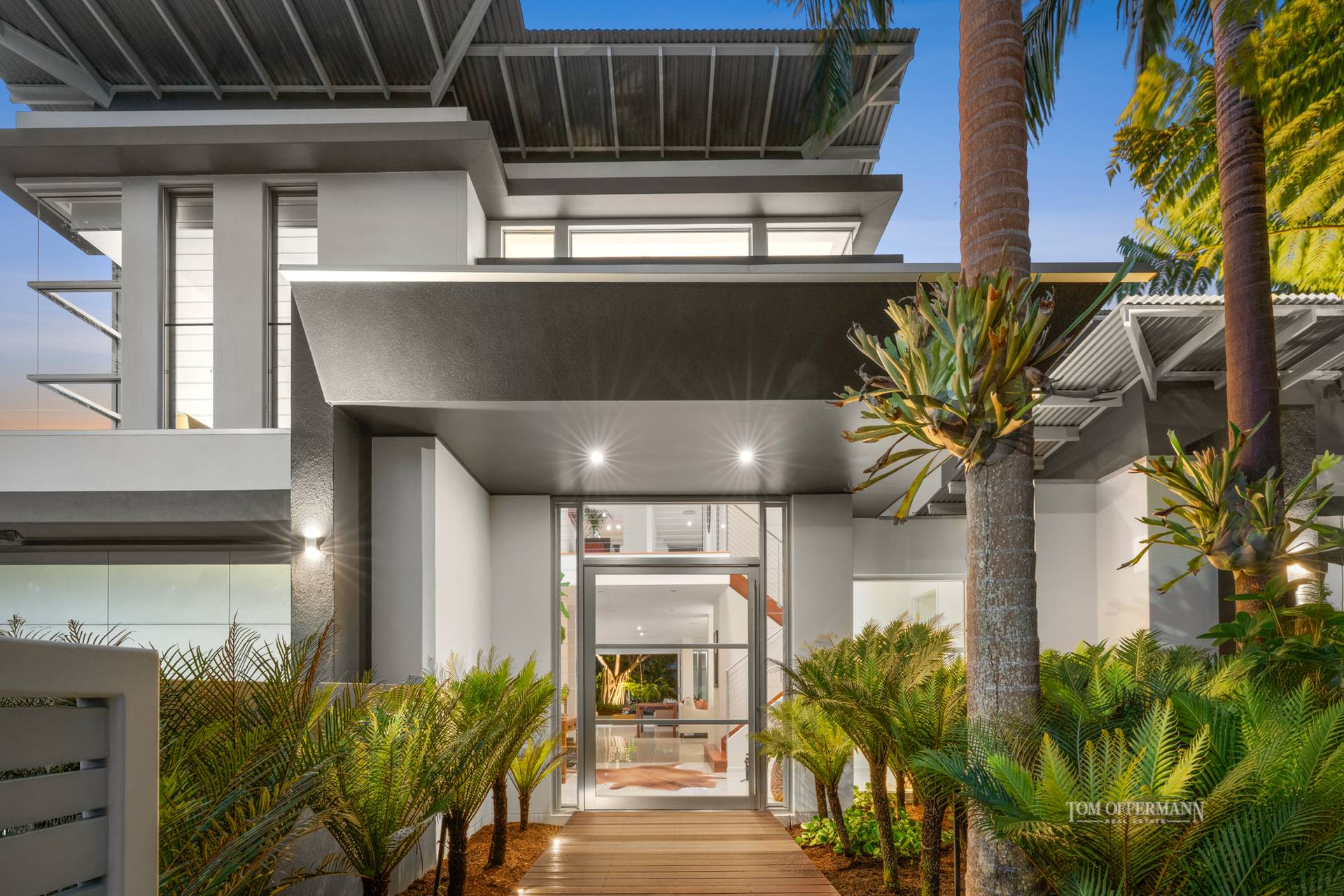 Be greeted at the gate by gardens adorned with tibouchina, cycads frangipani and palms either side of the timber walkway and discover an alluring residence of peace and quiet beyond compare, the result of a clever collaboration between architect Sarah Waller and builder Duncan Squires.